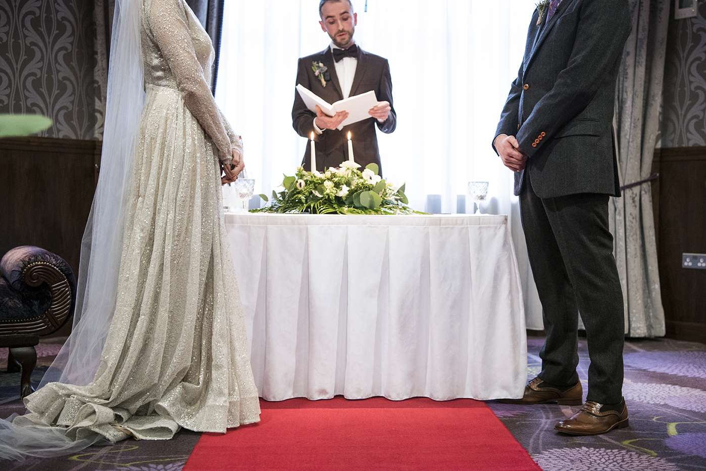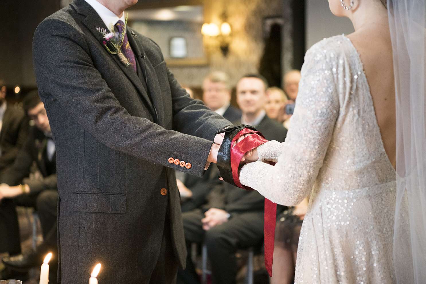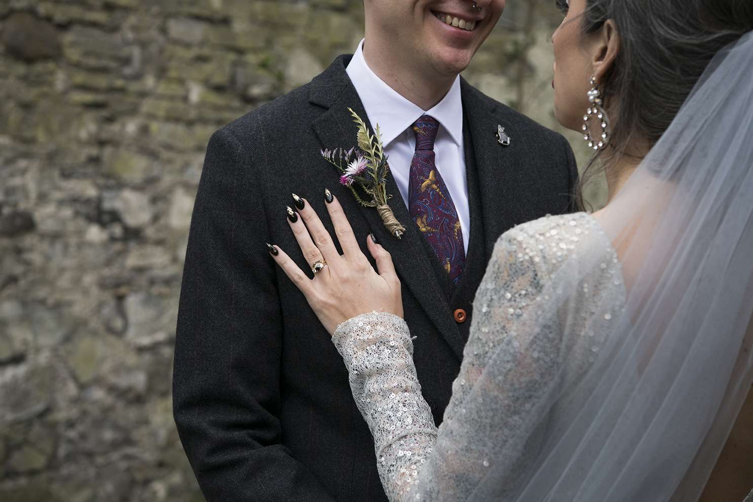 They had their legal ceremony two days before in the local registry office with just their two best friends present. On the wedding day, their ceremony was then officiated by a good friend, and they kept it short and sweet – including a handfasting and a ring warming.