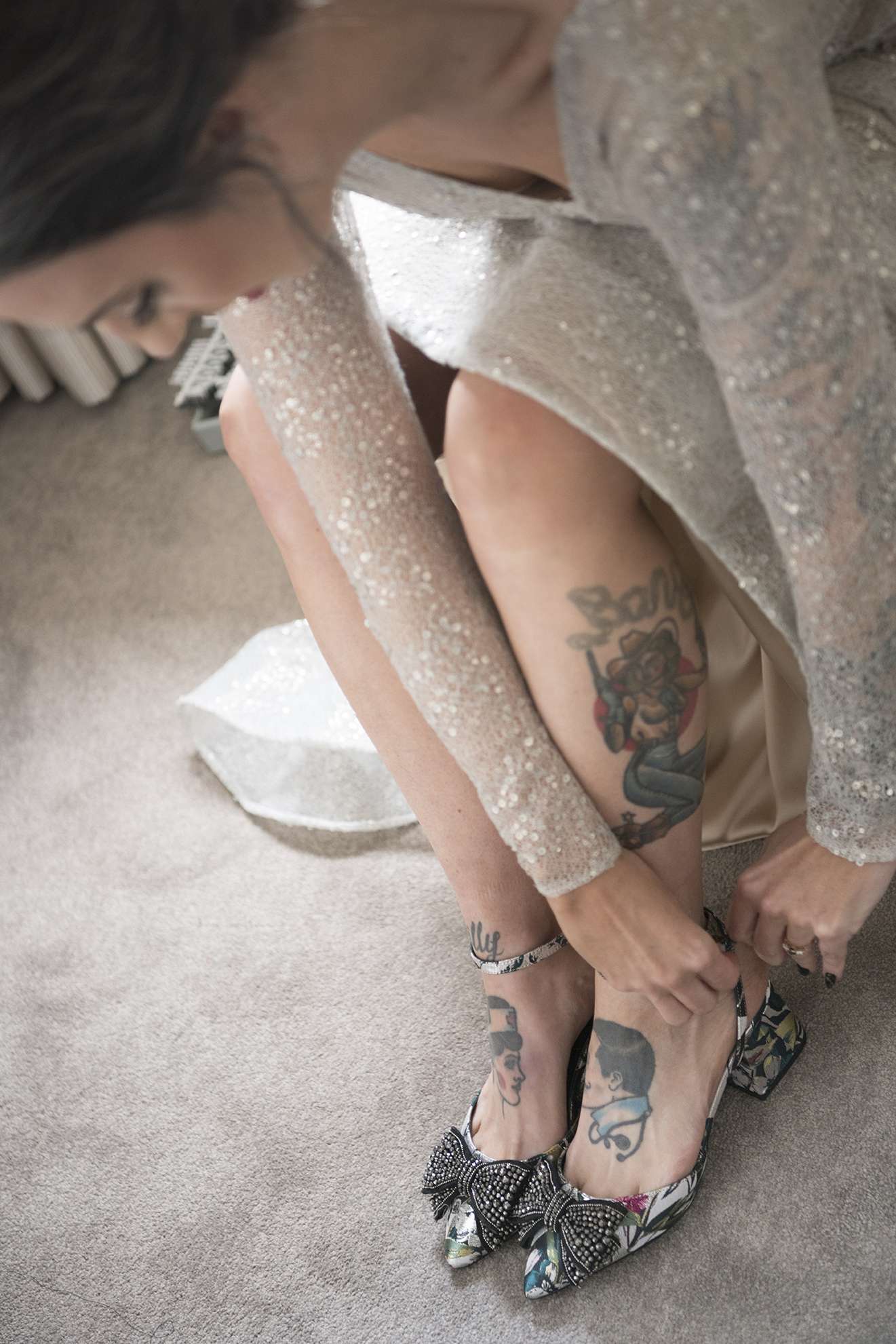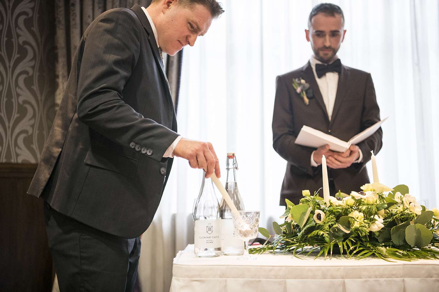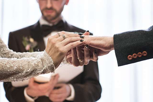 They had their legal ceremony two days before in the local registry office with just their two best friends present. On the wedding day, their ceremony was then officiated by a good friend, and they kept it short and sweet – including a handfasting and a ring warming.