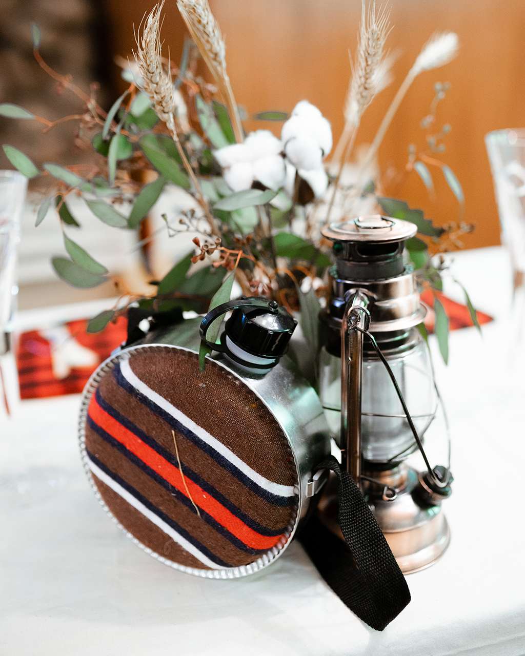 Scott and Jackie’s ceremony kicked off with a bucket of beers and a pile of blankets so their friends and family could enjoy a cold one while staying warm in true camp-out style. Jackie walked out with both her parents. They were married by a close friend which made the whole thing so much more comfortable, casual and familial – the last thing the couple wanted was a stuffy wedding being orated from a stranger giving long speeches and running through awkward rituals. They wrote and exchanged personal vows, including a planned homage to Star Wars. Their family threw confetti and waved pennant flags, and once they got to the end of the aisle they grabbed cold beers and gave them a good swig!