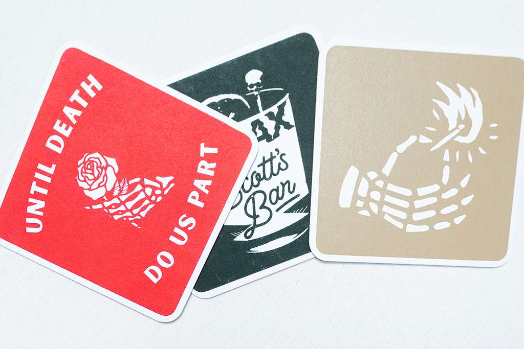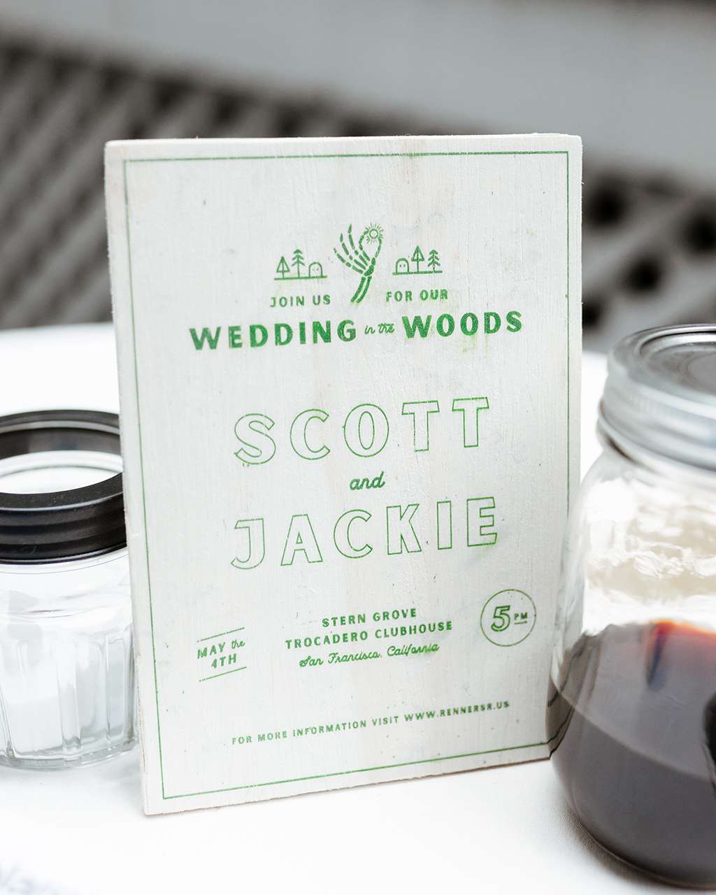 Everything generally had a colour / mismatched vibe, so they made sure all the designed elements of their day were consistent to help tie everything together. Jackie designed all the stationery, the signage, posters, table numbers, menus and built the website. Scott screen-printed the signs, stationery, coasters, tote bags and t-shirts to give away like it was a sporting event. They made welcome signs by screen-printing pieces of cheap wood. They made felt pennants and buttons for people to take home.