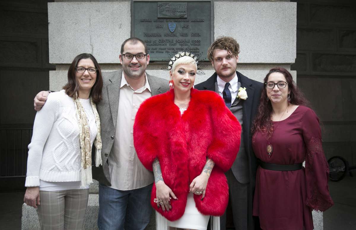 The day kicked off with them getting ready together (after some hotel suite bath pics of course!) at Hotel Monaco. They then had a self-unifying Quaker ceremony at Philadelphia City Hall. “We married each other under a self-uniting / Quaker certificate as Pennsylvania is one of the rare states that lets couples get hitched without an officiant”, the bride began. “We wanted to involve all of our witnesses in signing so we purchased a custom certificate by a Philly local that had spaces for everyone to sign. We left the legal one to my parents.”