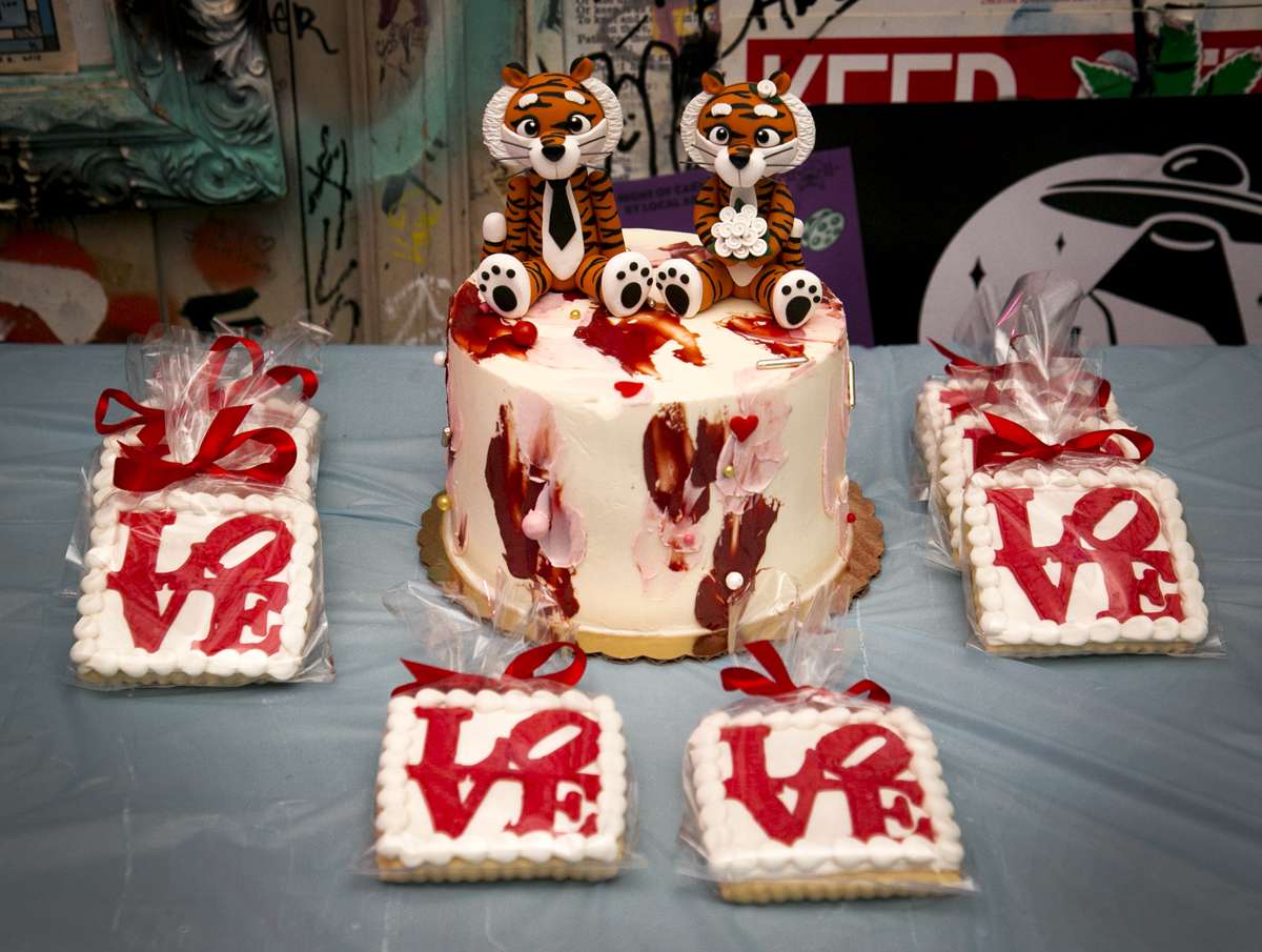 Decor-wise they kept things simple and inexpensive. Finding most things at Dollar Tree and Amazon. Instead of a fancy cake they had cookies from Whipped Bakeshop with two smaller cakes from local bakeries. Philadelphia Pretzel Co. made them heart shaped pretzels which they ate with champagne at the ceremony and not wanting a fancy sit down meal they had pizza delivered to Tattooed Mom which they served with vegan and meat cheese steaks, pierogis, tater tots, pitas and hummus, chicken fingers, mozzarella sticks and waffle fries!