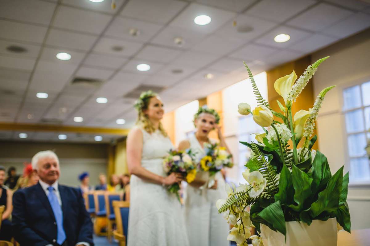 Becs and Megs’ simple wedding started with a ceremony at Manchester register office followed by a restaurant reception at No 1 Canal Street. Armed with a budget of £3500 they only included things they cared about, wore outfits from Karen Millen and kept the extra decorations minimal. The flowers were limited to their bouquets and the flowers in their hair.