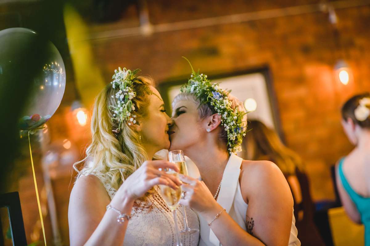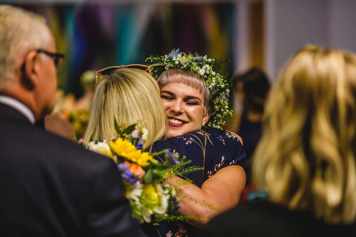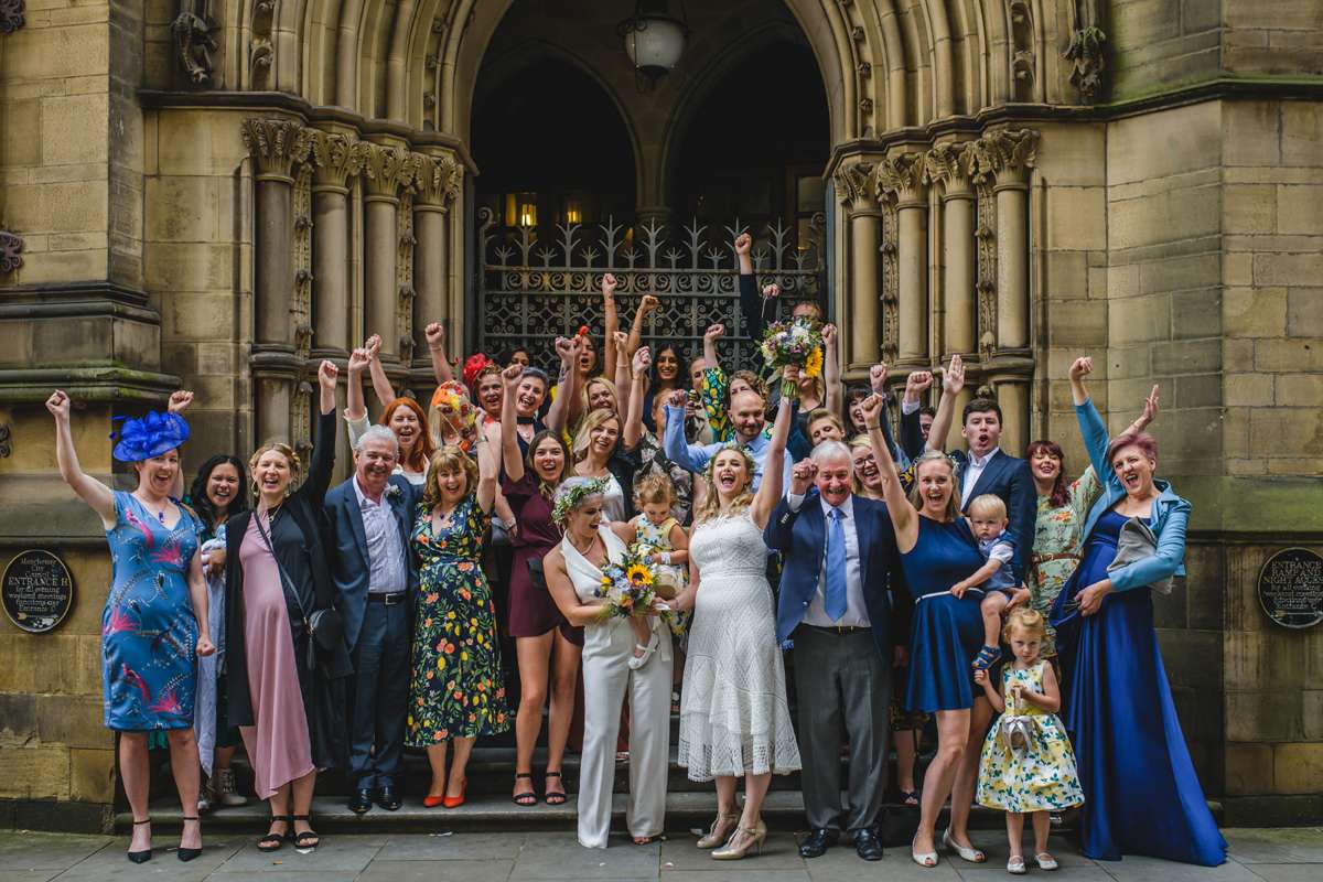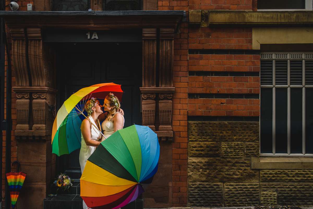They actually started by planning a secret wedding ten weeks before the date. They were going to just ask just two friends to be witnesses which is why they ended up getting married on a Tuesday at 11am! “The ideas then began to grow as we decided we couldn’t be married without our dearest present to celebrate”, they continued. “We were so humbled that people came from Switzerland, Scotland, Ireland, Devon, London, the lakes, the Midlands and Manchester to support us. Everyone had to take a day off work and make childcare arrangements, but none of this seemed to matter to them, we invited them and they were so happy to be invited. We loved marching them across Manchester form the registry office to Canal Street, carrying seven rainbow umbrellas just in case!”
