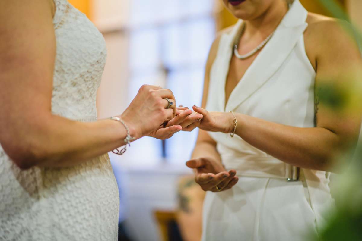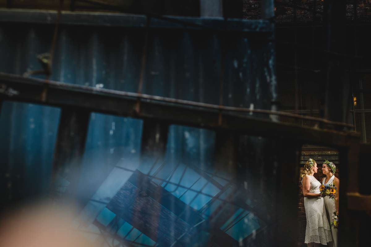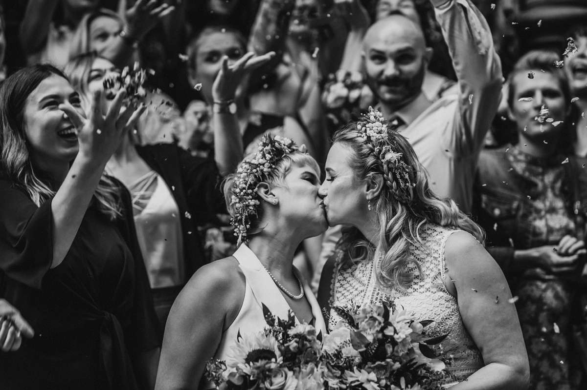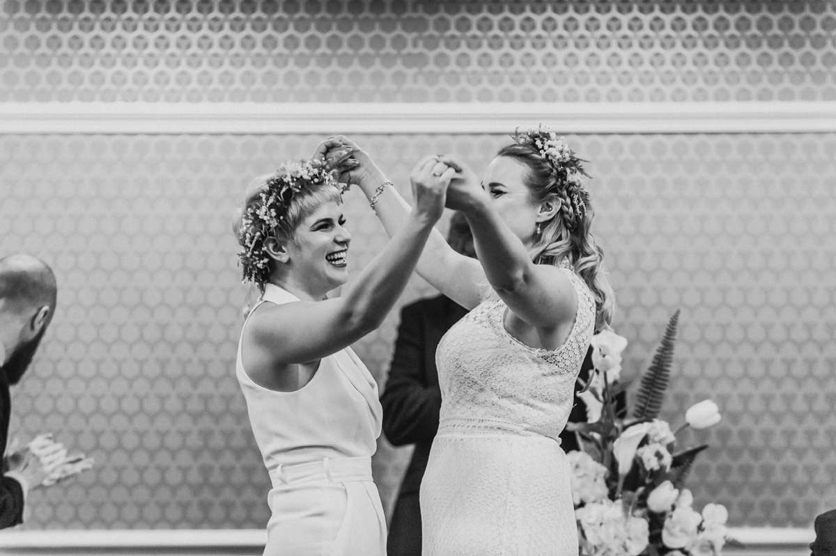 They actually started by planning a secret wedding ten weeks before the date. They were going to just ask just two friends to be witnesses which is why they ended up getting married on a Tuesday at 11am! “The ideas then began to grow as we decided we couldn’t be married without our dearest present to celebrate”, they continued. “We were so humbled that people came from Switzerland, Scotland, Ireland, Devon, London, the lakes, the Midlands and Manchester to support us. Everyone had to take a day off work and make childcare arrangements, but none of this seemed to matter to them, we invited them and they were so happy to be invited. We loved marching them across Manchester form the registry office to Canal Street, carrying seven rainbow umbrellas just in case!”