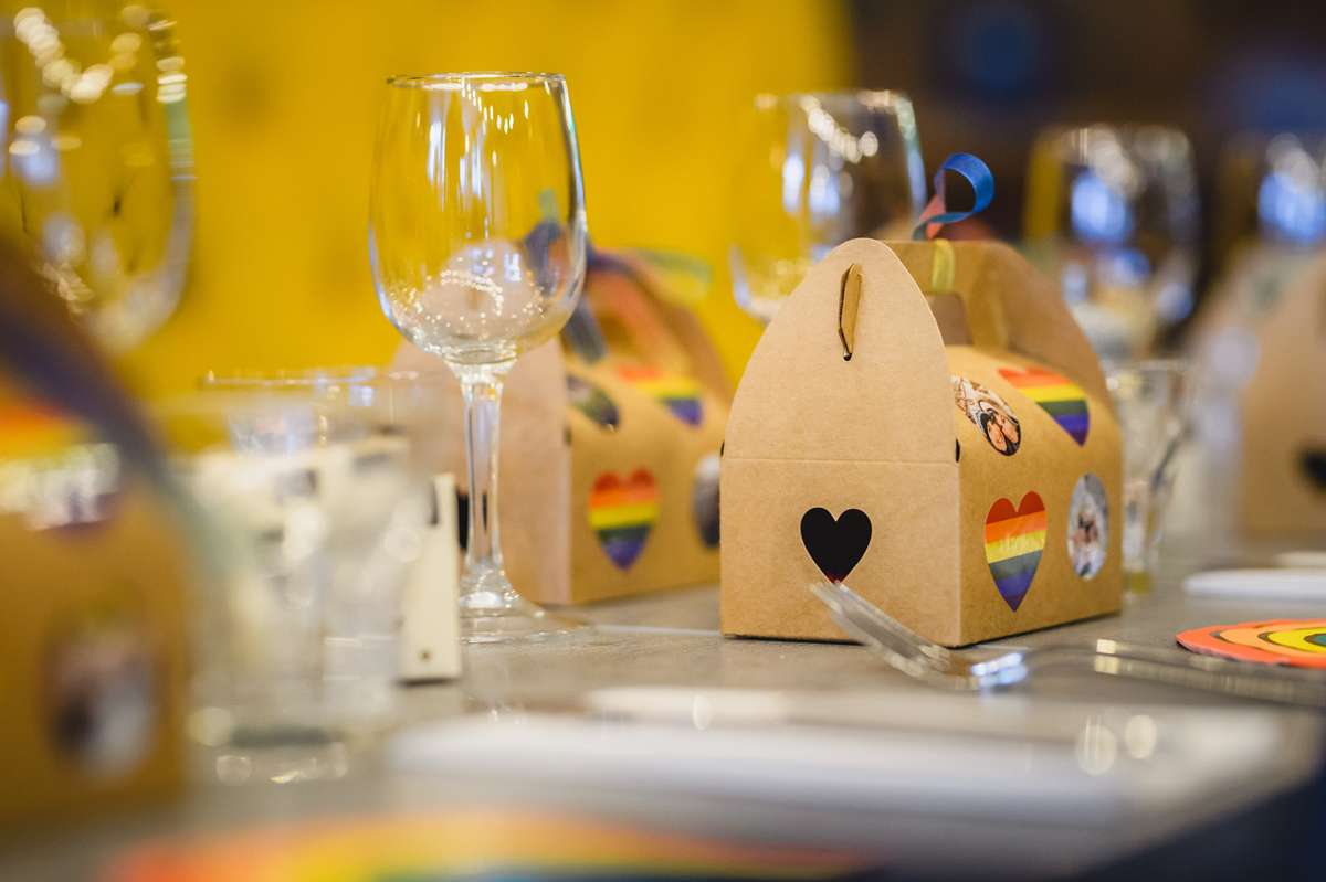 Becs decided to give everyone a cheese knife as a a favour because they both love cheese! They burnt their initials and the wedding date onto each knife. “We also gave them a baby bell and a tiny pot of pickle, along with bubbles and some stick on moustaches in a little brown box which we decorated with rainbow stickers and little round stickers of photos of the two of us. We also painted a post box for all the cards white with rainbow letters and a photo of us on the front. We ordered vacuum sealed confetti petals on Amazon and bagged that up the night before.”