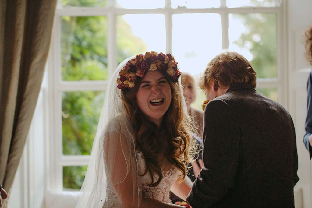 Their ceremony was held in the drawing room of Butley Priory, a stunning room with high vaulted ceilings, chandelier and wall-to-wall book cases. They had two readings; one from Winnie the Pooh read by Lucy’s brother, and the other read by a friend who introduced them. “Because we had chosen to get married in October we were happy to accept whatever weather we got on the day, however we were so lucky to have beautiful sun-shine which meant that after the ceremony we were able to enjoy the beautiful garden and surrounding woodland.