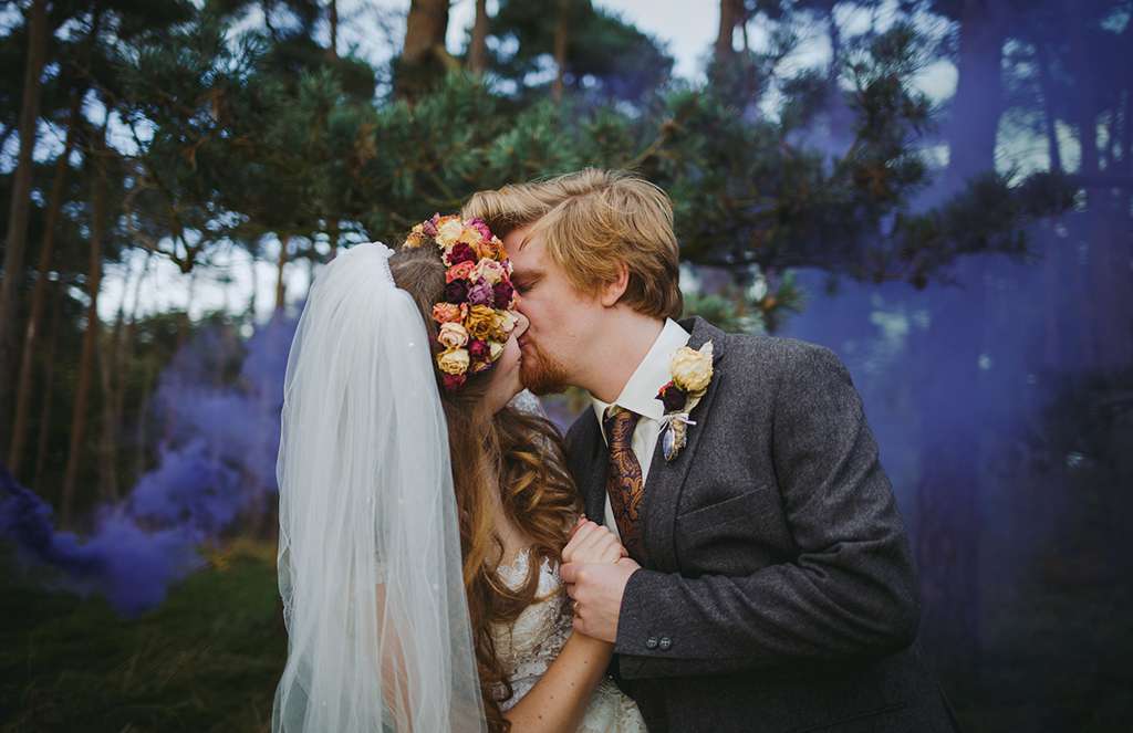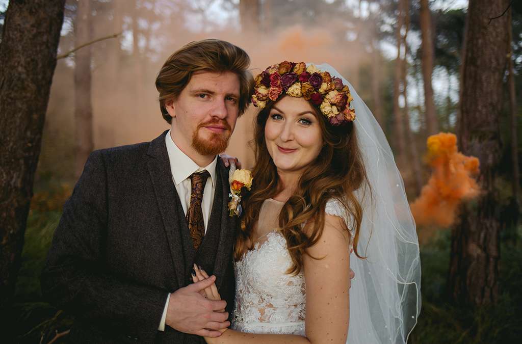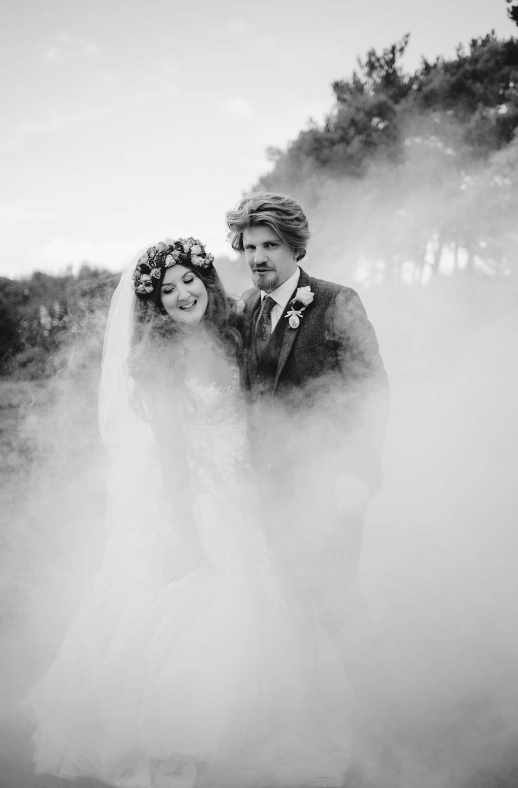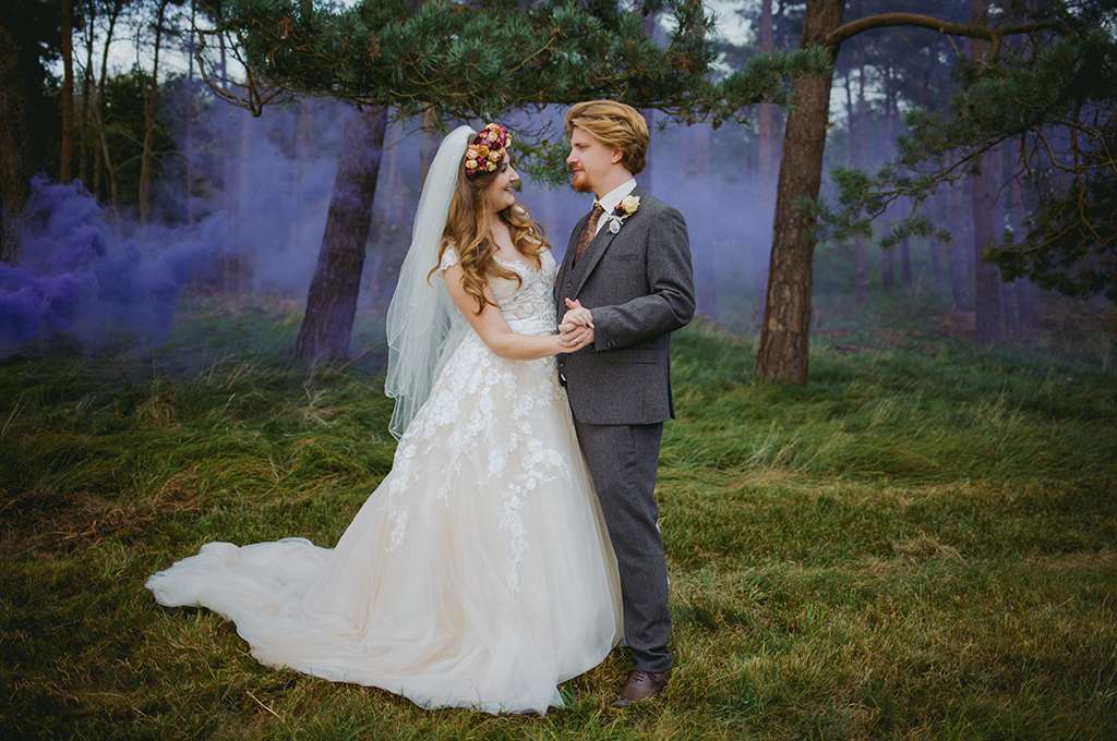 A memory that really stands out for the couple was going into the woods after the ceremony to have pictures taken and witnessing a once-in-a-lifetime moment. “We had bought some coloured smoke bombs to experiment with and whilst we were getting ready we heard some strange snorting and grunting sounds coming from the trees behind us, when a stag and deer ran out of the trees and circled around us! It was equally terrifying and amazing at the same time and made for some great photos.”
