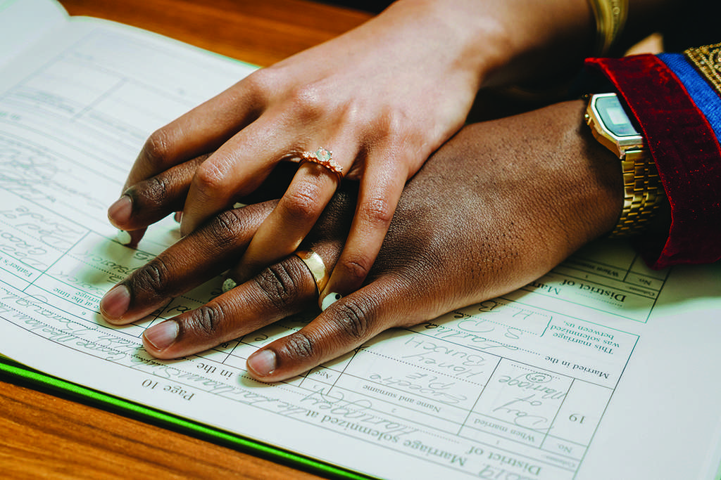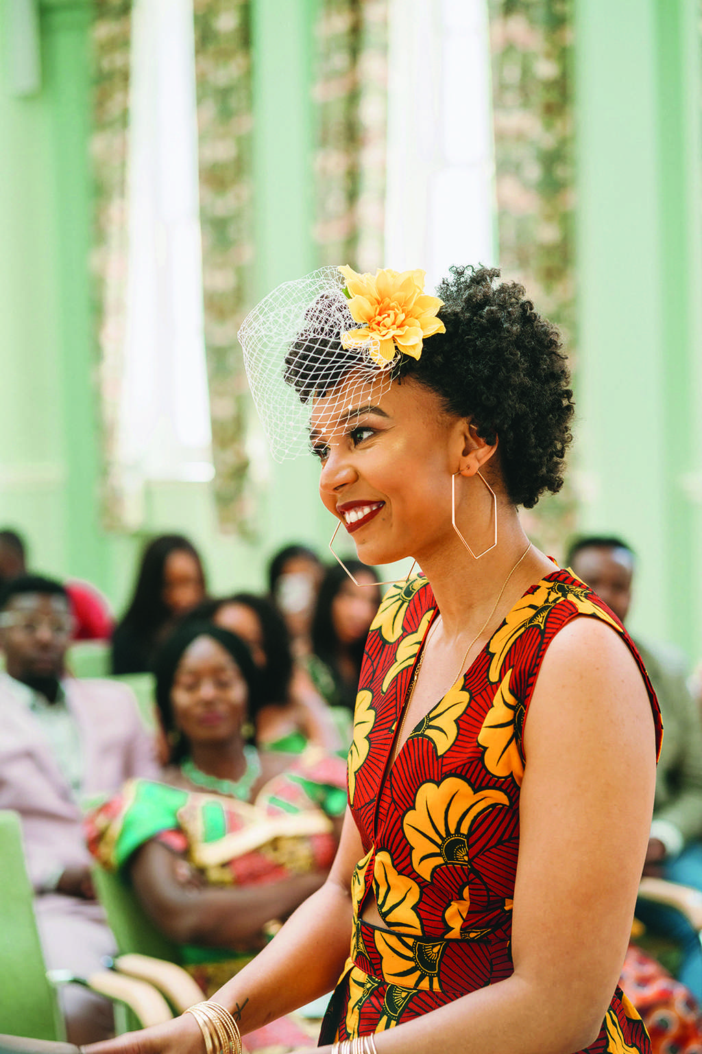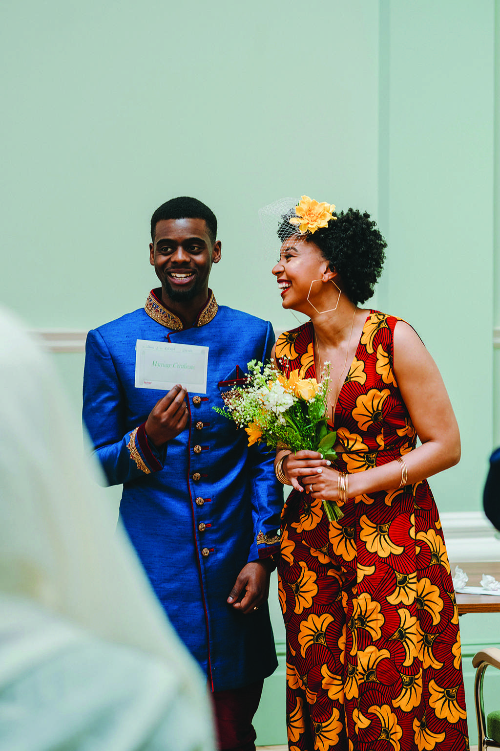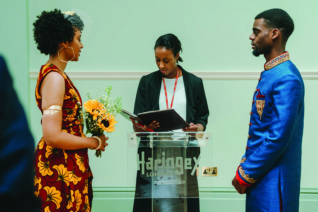 Both Luke and Aida wanted to represent their African heritage in their outfits. Aida was adamant that she didn’t want a traditional white wedding dress, or even a typical dress for that matter. She chose a beautiful burgundy and mustard African fabric and had a local tailor create a jumpsuit with a cape out of it. She also made her own birdcage veil, wore high street jewellery and when she couldn’t find any flat shoes she wanted, just wore a pair she already owned. “Much to my mother disapproval,” she laughed, “but at least I was comfortable! I hate heels, so why would I wear them on my wedding day?!”