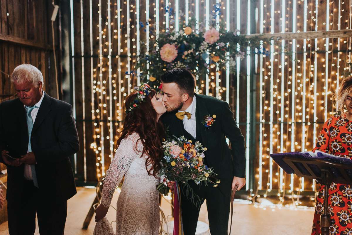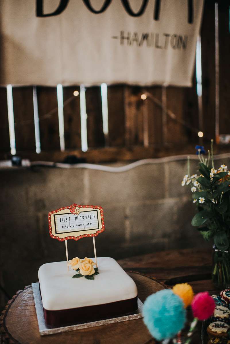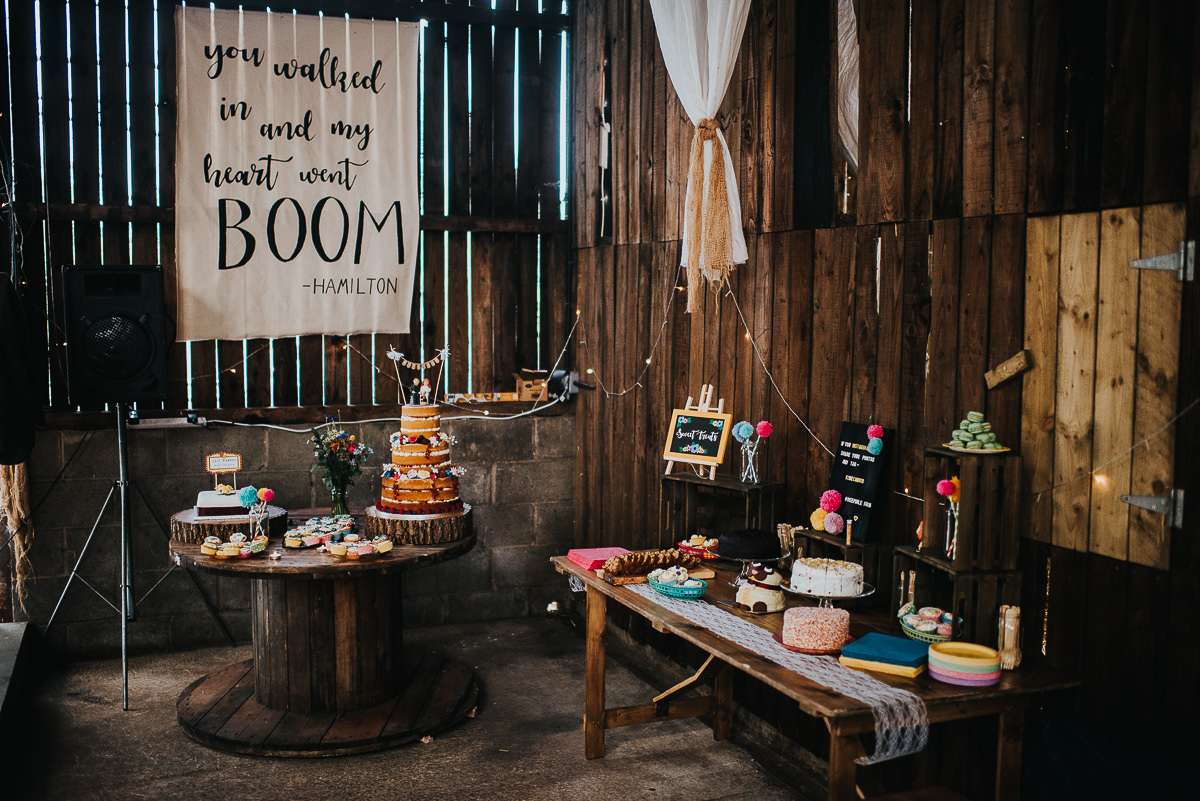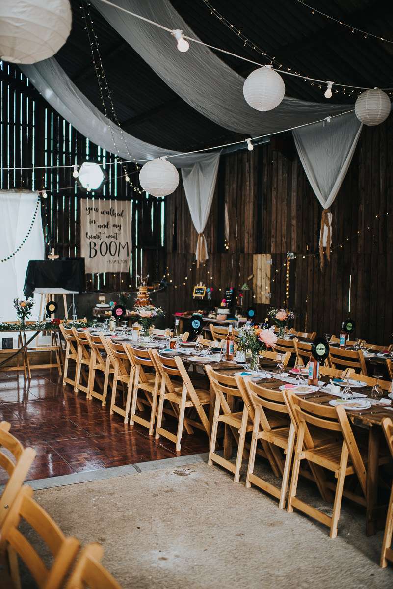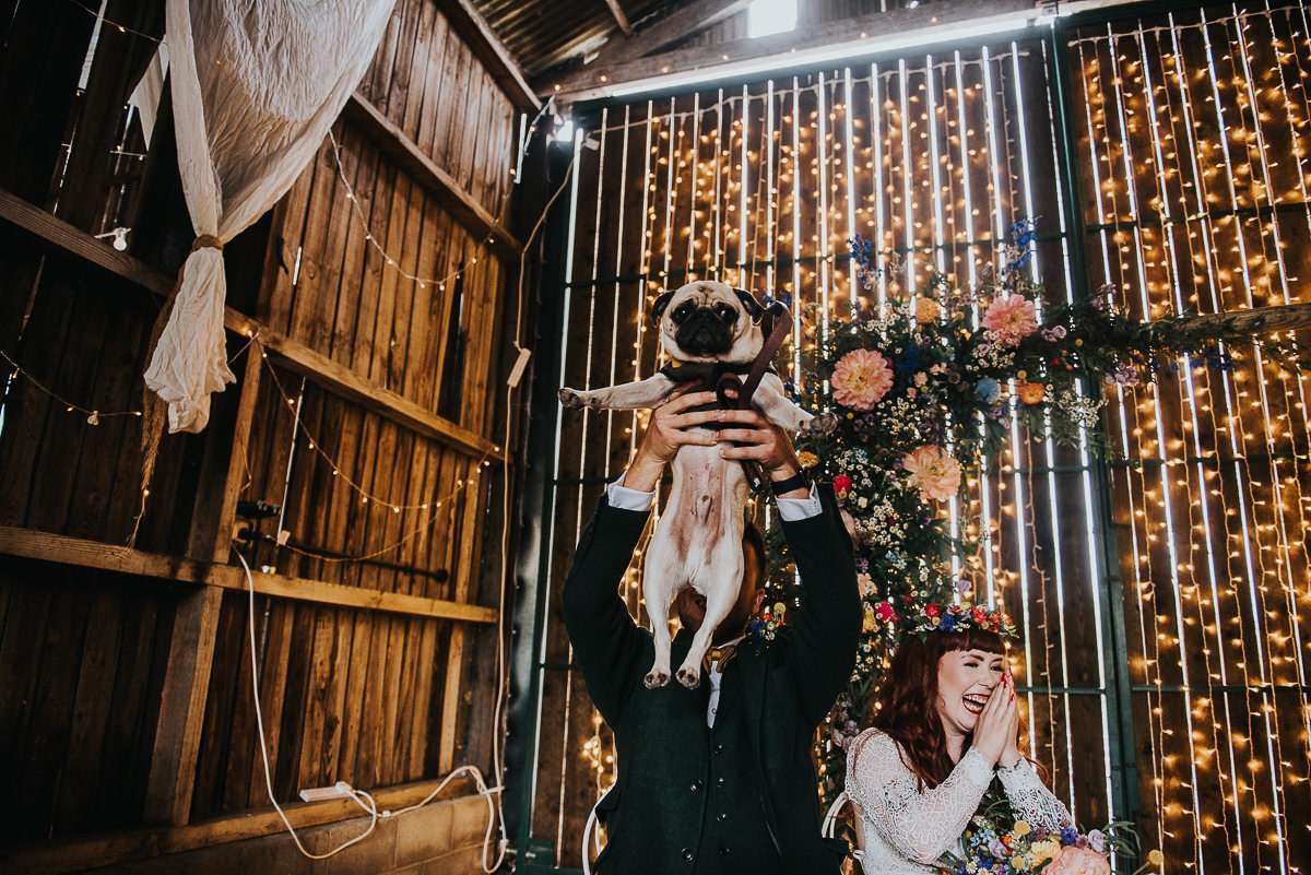 Their ceremony, held in the barn, was exactly how they wanted it to be. “Our ceremony was, in one word, EPIC!” Kayley continued. “Lou Starr created the most amazing ceremony all about our relationship and musical theatre. We had sound bites from our favourite shows to tell our love story (e.g. Can You Feel The Love Tonight from The Lion King, Man Up from The Book of Mormon). Lou changed costumes from a nun, to a bearded lady. She created a countdown conundrum of Les Miserables to give anyone time to object before we said our vows (and decided who was going first with rock, paper, scissors!). Finally, we had everybody up doing the Time Warp then a giant sing-a-long to We Go Together from Grease as we left the barn. Our pug Frank was ring bearer and was held up like in The Circle Of Life to a raucous applause.”