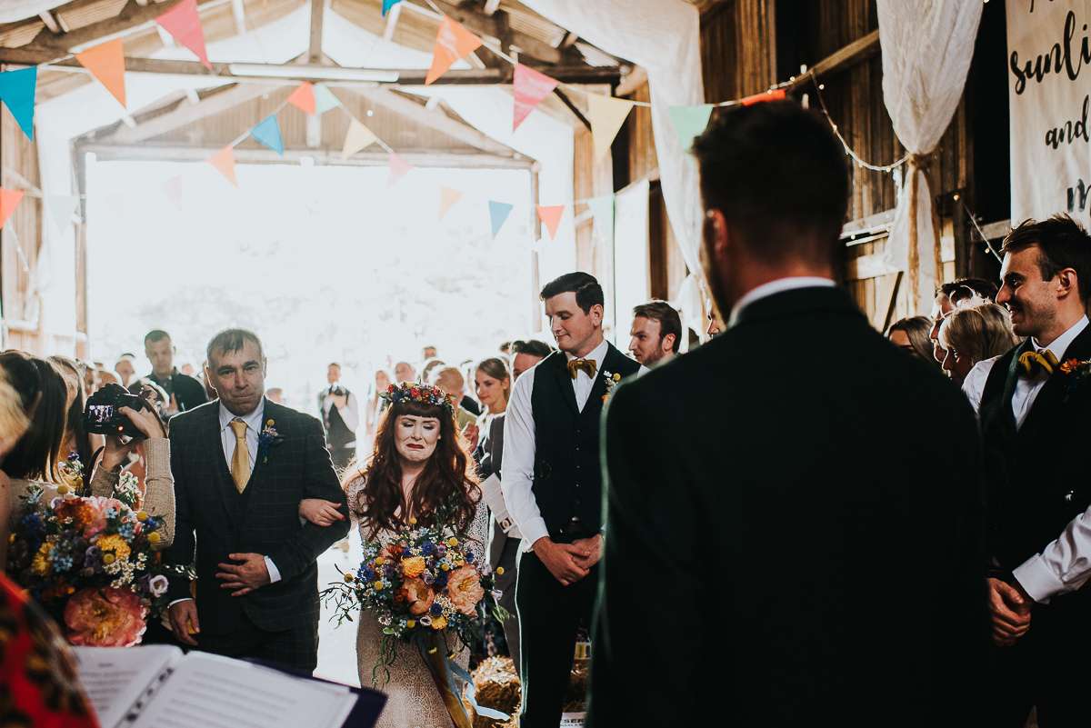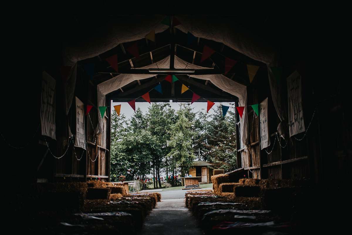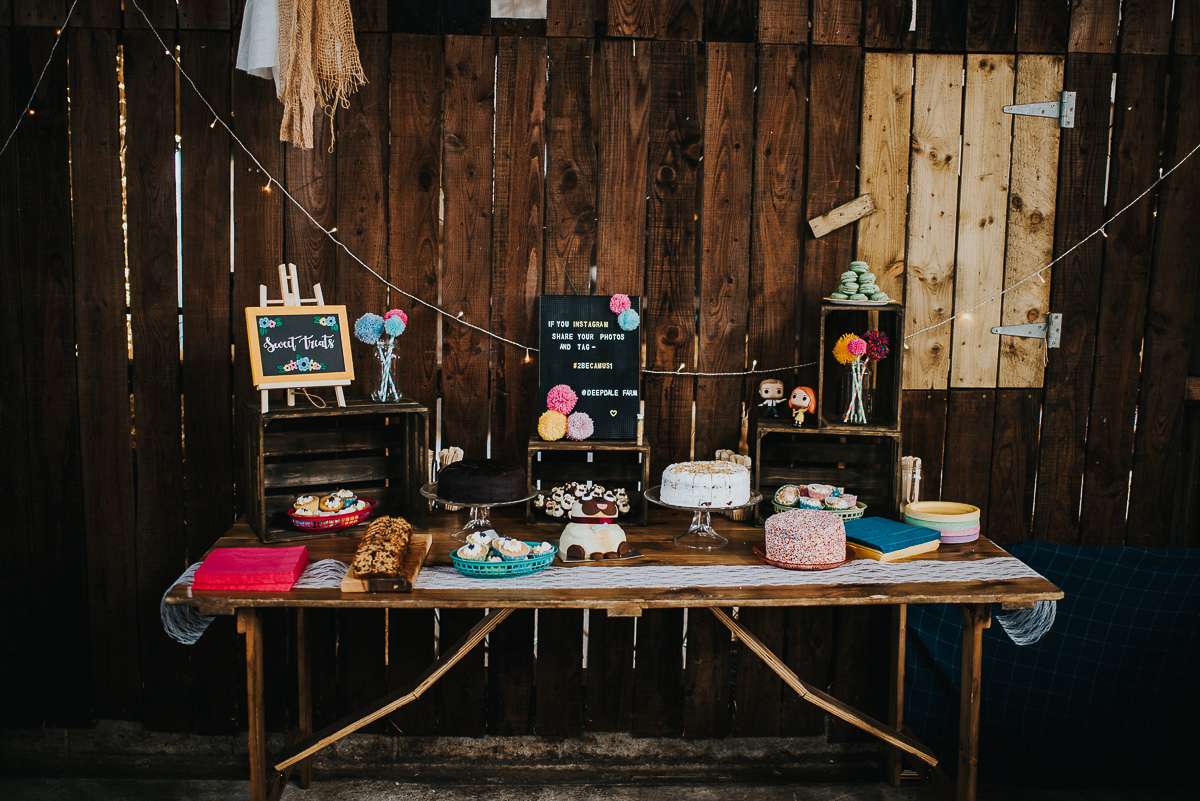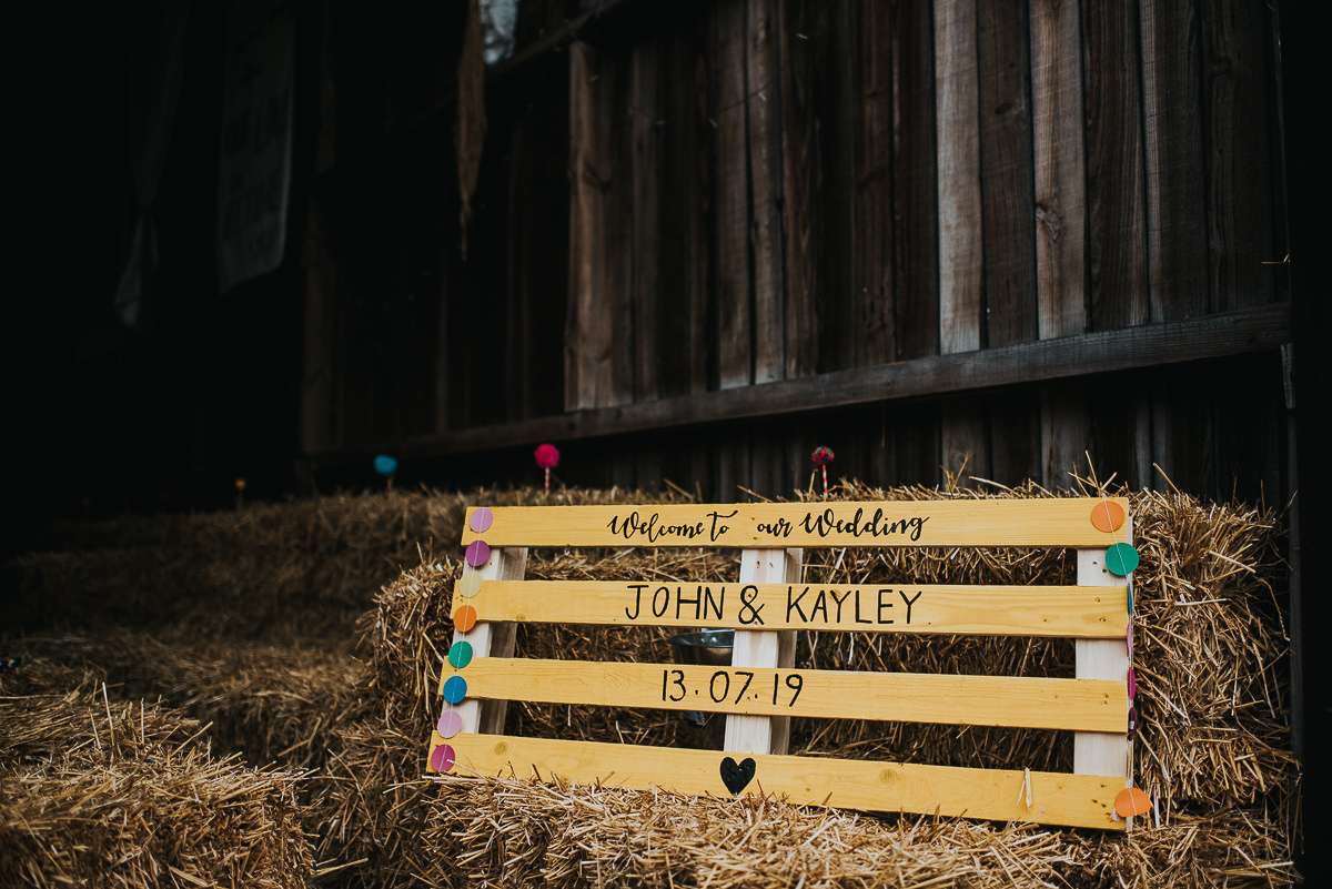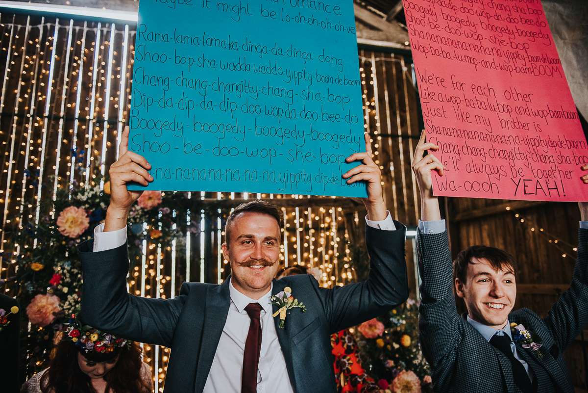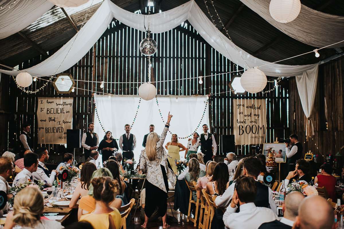 Their ceremony, held in the barn, was exactly how they wanted it to be. “Our ceremony was, in one word, EPIC!” Kayley continued. “Lou Starr created the most amazing ceremony all about our relationship and musical theatre. We had sound bites from our favourite shows to tell our love story (e.g. Can You Feel The Love Tonight from The Lion King, Man Up from The Book of Mormon). Lou changed costumes from a nun, to a bearded lady. She created a countdown conundrum of Les Miserables to give anyone time to object before we said our vows (and decided who was going first with rock, paper, scissors!). Finally, we had everybody up doing the Time Warp then a giant sing-a-long to We Go Together from Grease as we left the barn. Our pug Frank was ring bearer and was held up like in The Circle Of Life to a raucous applause.”
