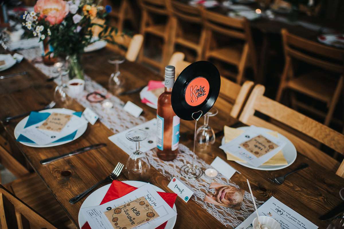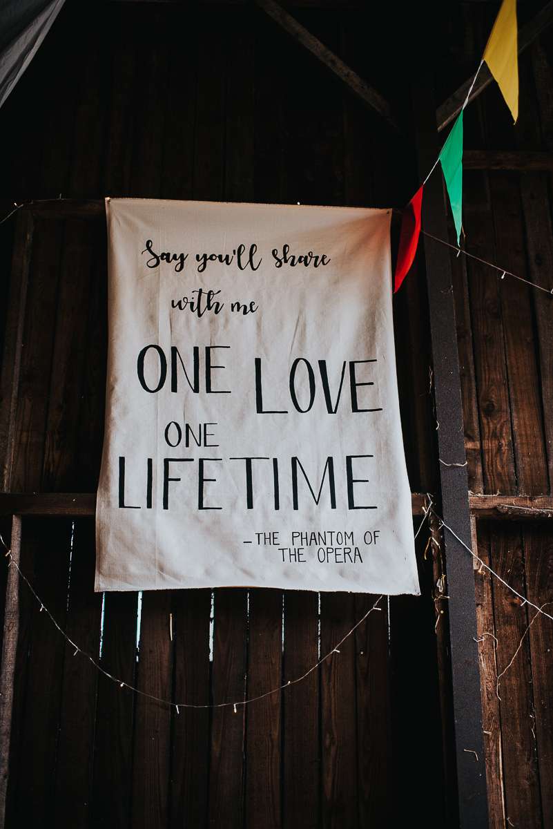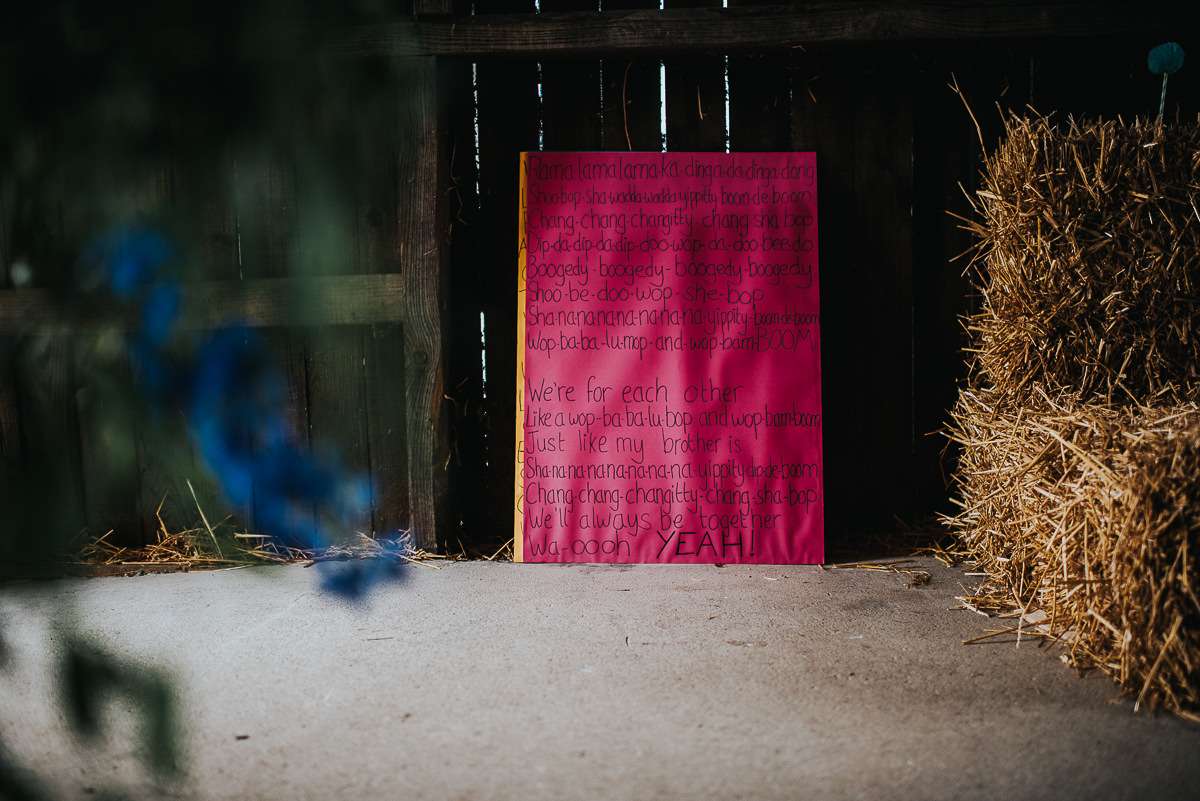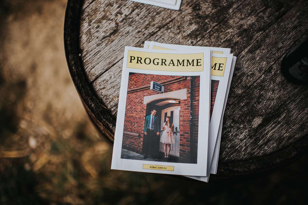 “We bought a big roll of fabric, cut out each banner and acrylic painted the quotes”, Kayley explained. “We’ve got one up in our living room now to remember the day. We also created ‘theatre programmes’ for everyone who came to the ceremony which had ‘cast’ photos in (our families and wedding party), our story, a series of photos we had done at Sunderland Empire Theatre, and a collage of all the shows we have seen together. They also had a little bit explaining about the favours we had. We donated to the Mind charity to get sunflower seeds for our favours as mental health is a big part of our life and something we care a lot about.”