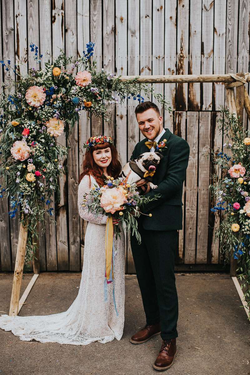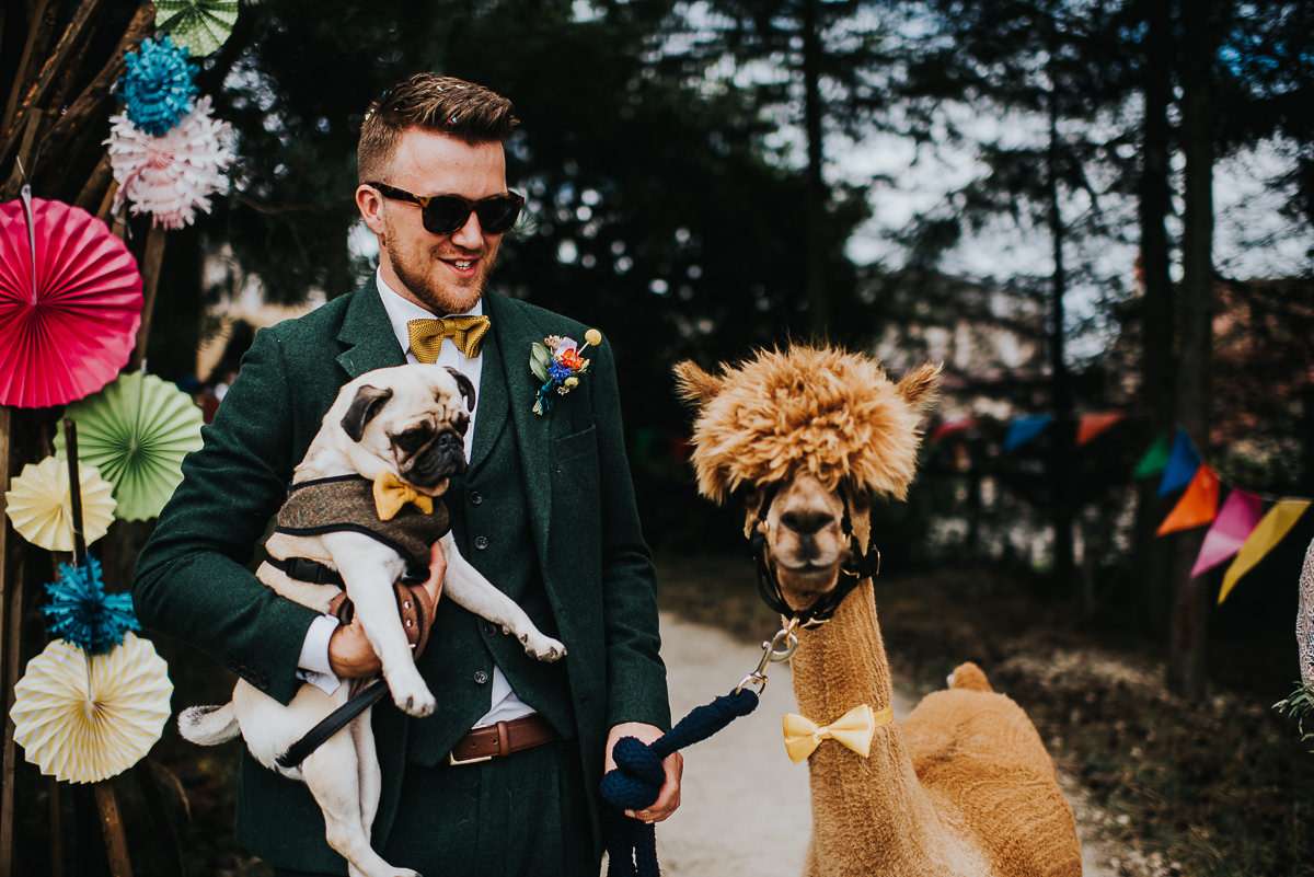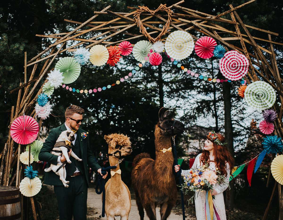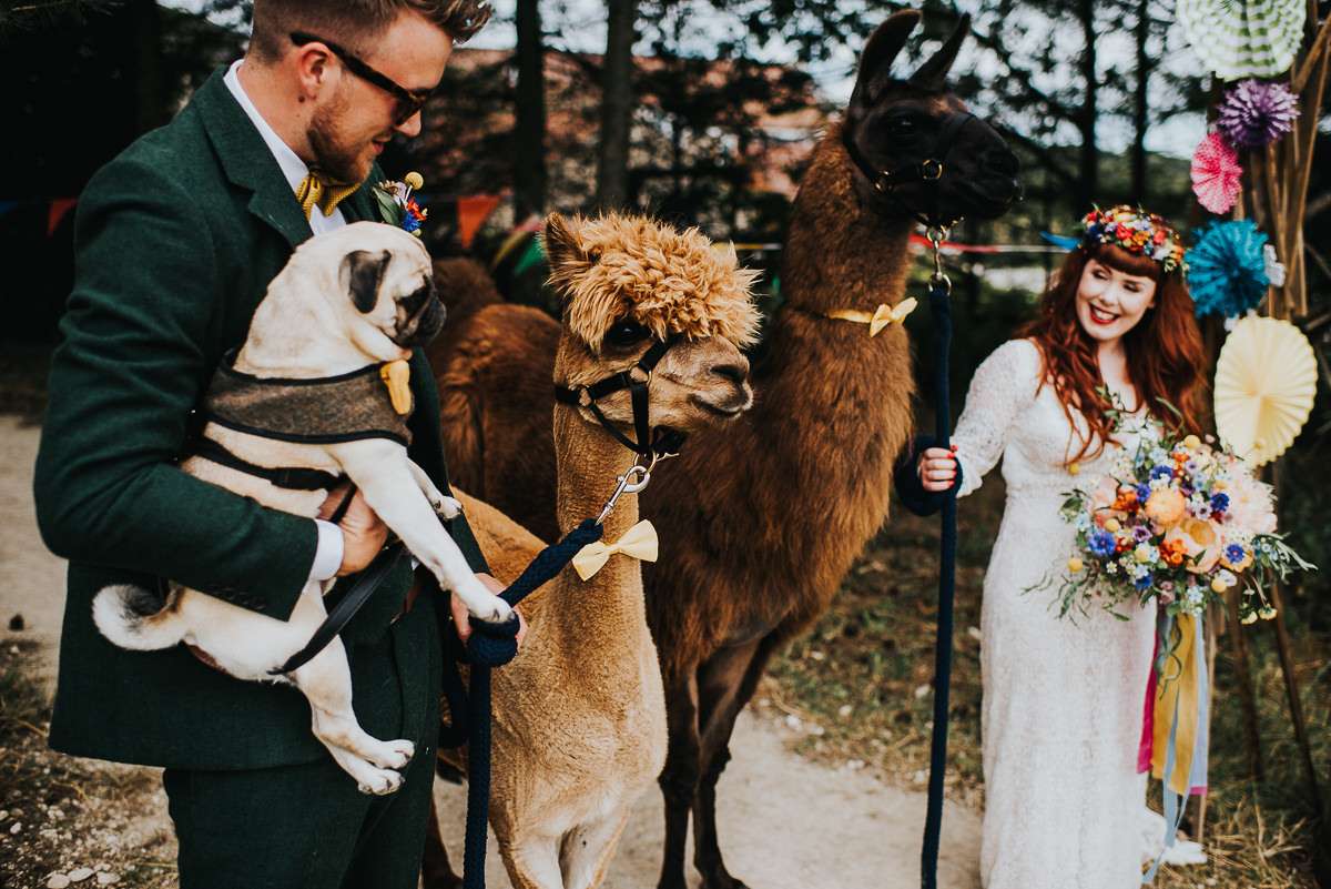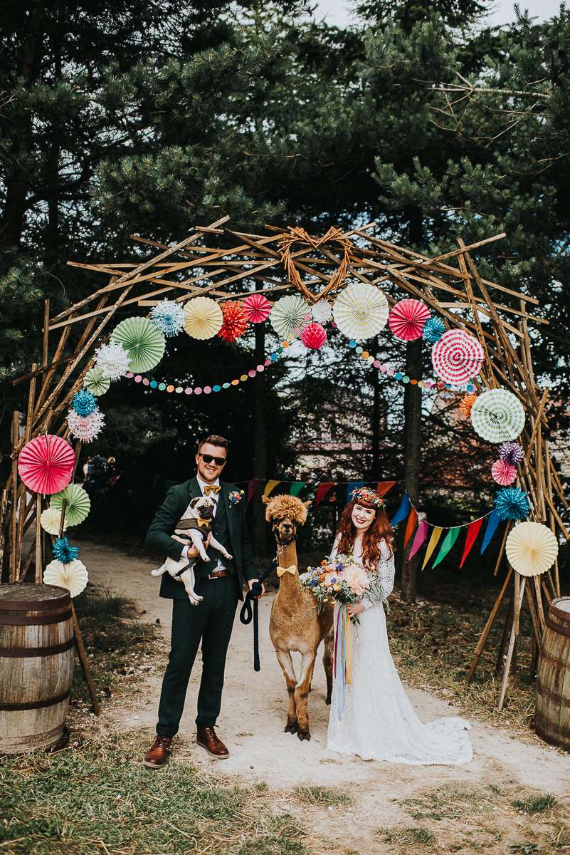 Bringing their musical love of musical theatre and colour into the day, Kayley and John were married at Deepdale Farm over the summer. They also had a number of very special guests, namely their pug, Frank, and a llama and alpaca who joined them for photos! All the decorations were designed and made by the couple themselves. Their particular favourites being the banners with musical quotes on.