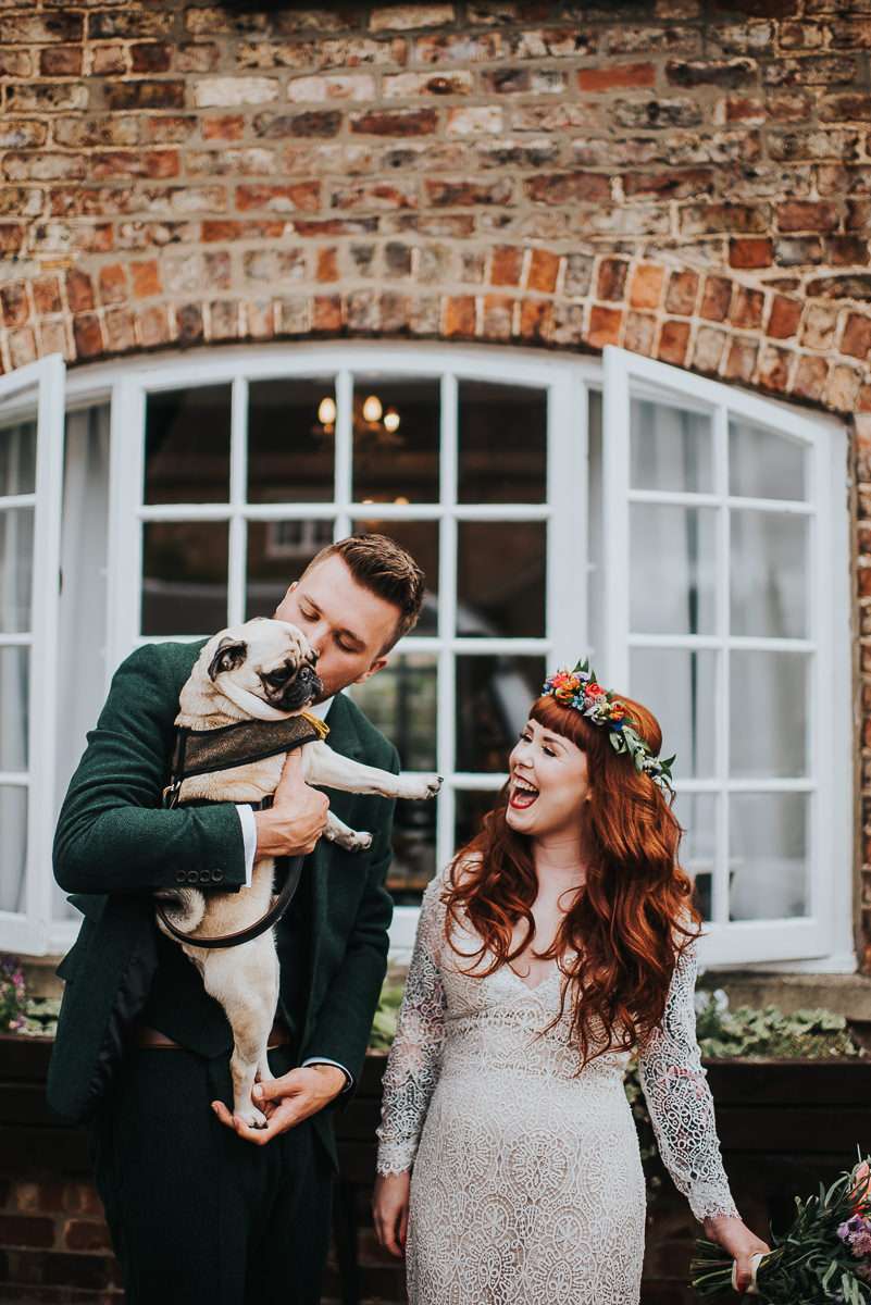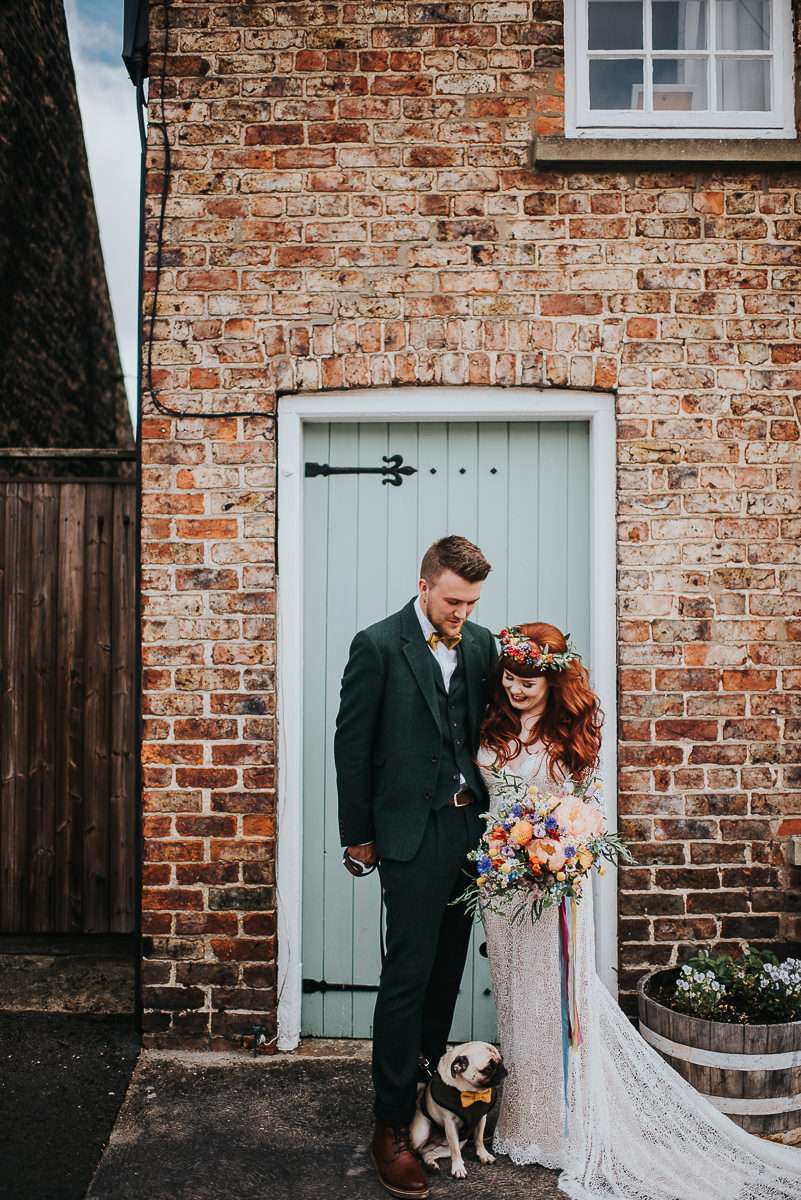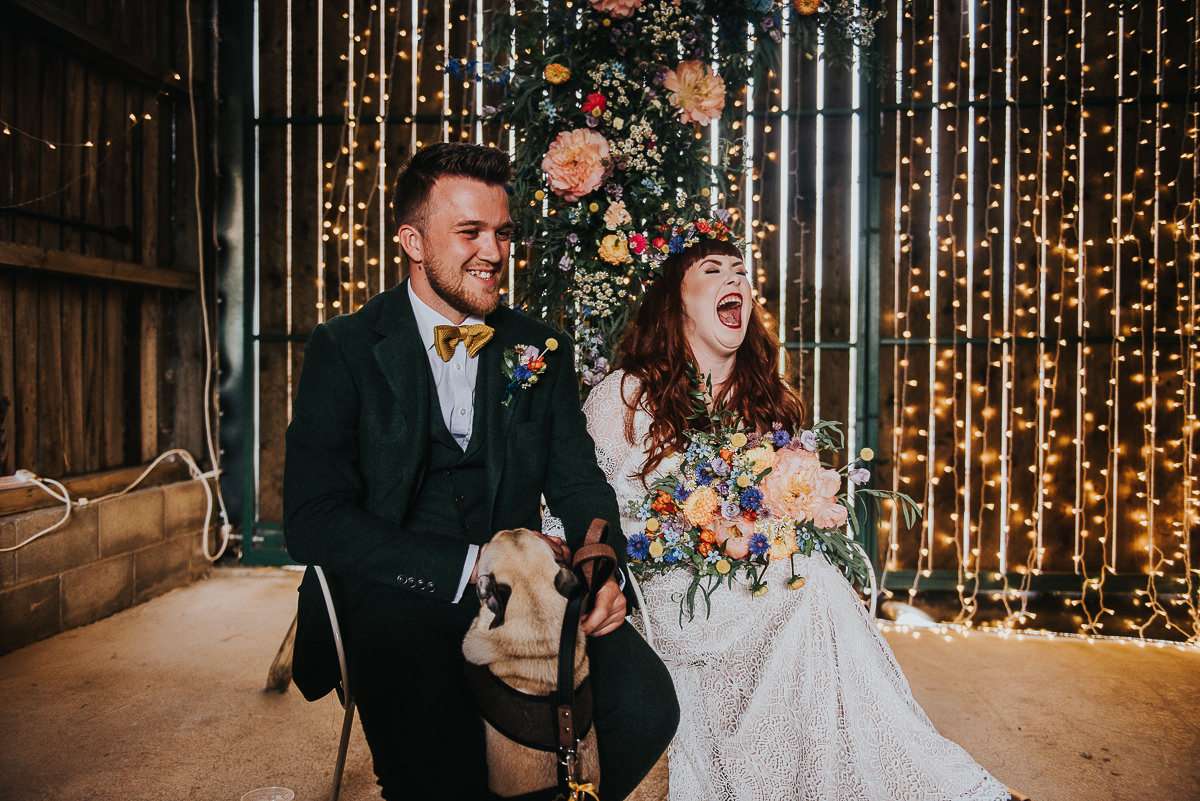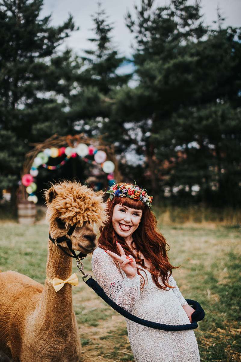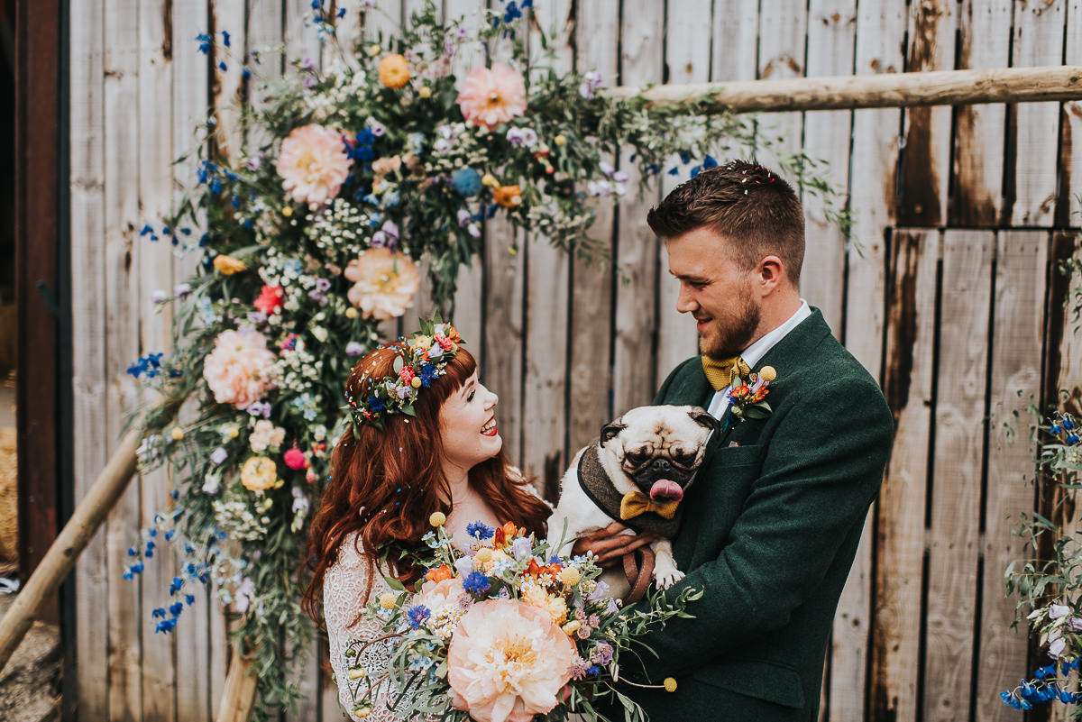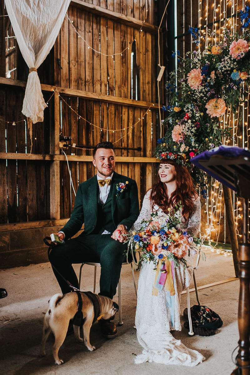 Bringing their musical love of musical theatre and colour into the day, Kayley and John were married at Deepdale Farm over the summer. They also had a number of very special guests, namely their pug, Frank, and a llama and alpaca who joined them for photos! All the decorations were designed and made by the couple themselves. Their particular favourites being the banners with musical quotes on.