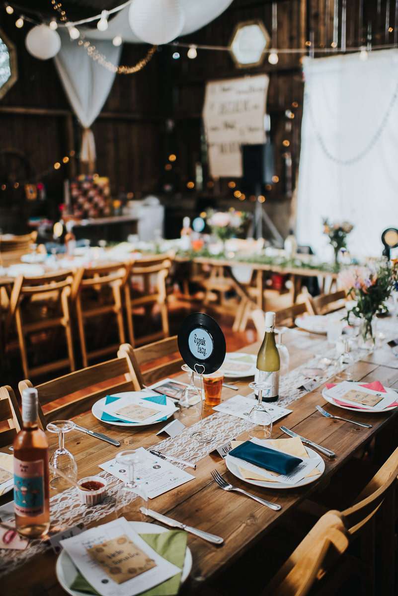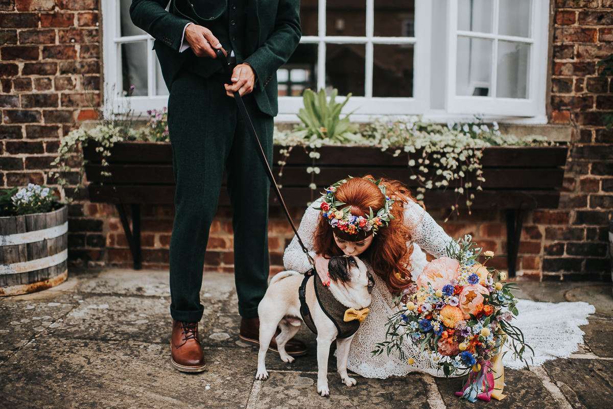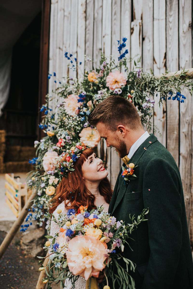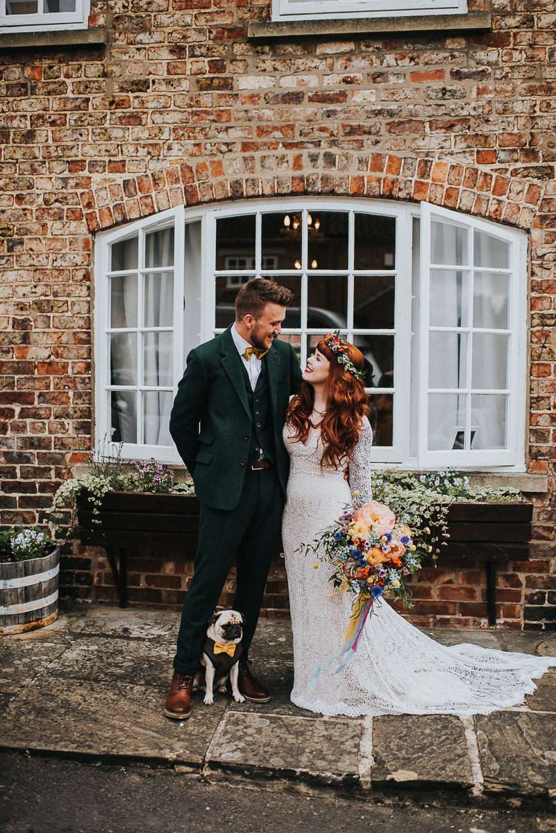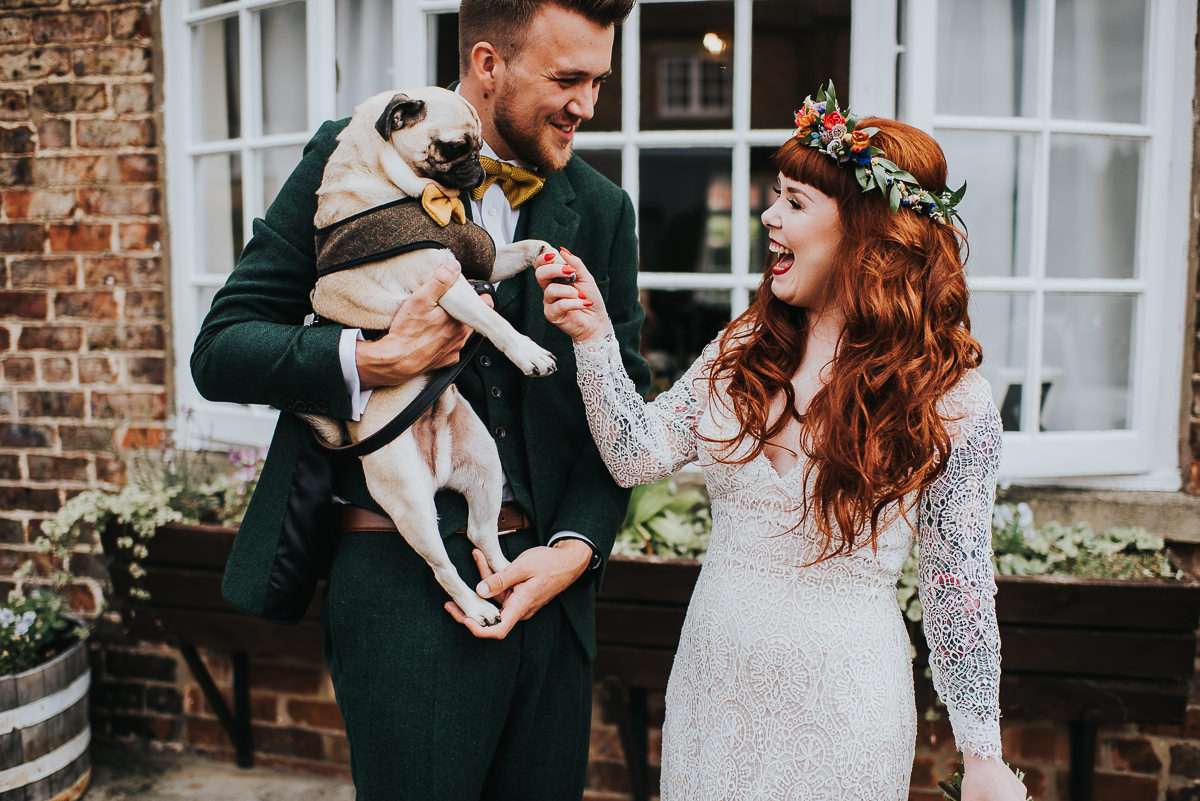 Bringing their musical love of musical theatre and colour into the day, Kayley and John were married at Deepdale Farm over the summer. They also had a number of very special guests, namely their pug, Frank, and a llama and alpaca who joined them for photos! All the decorations were designed and made by the couple themselves. Their particular favourites being the banners with musical quotes on.