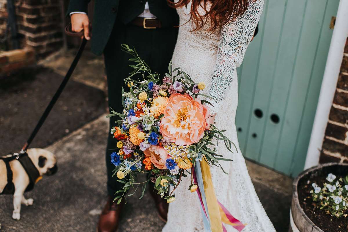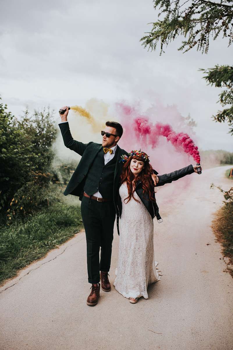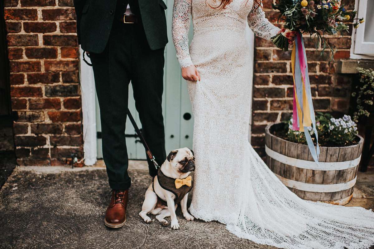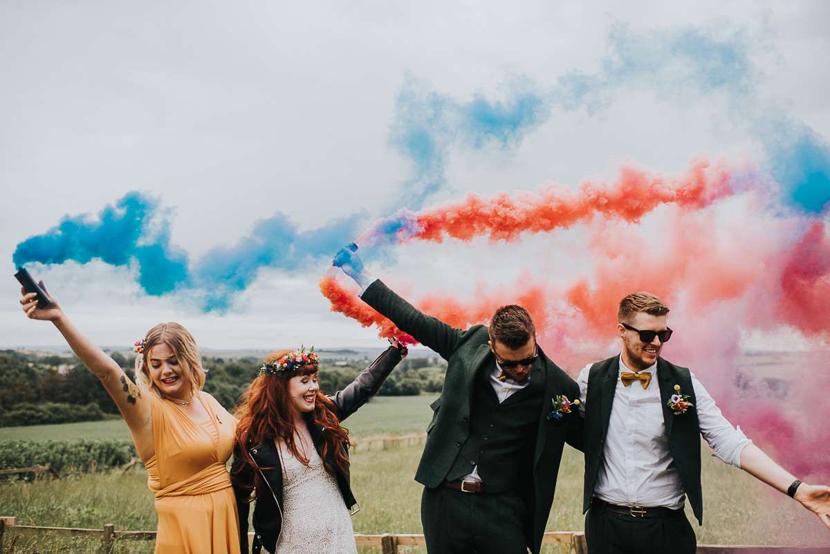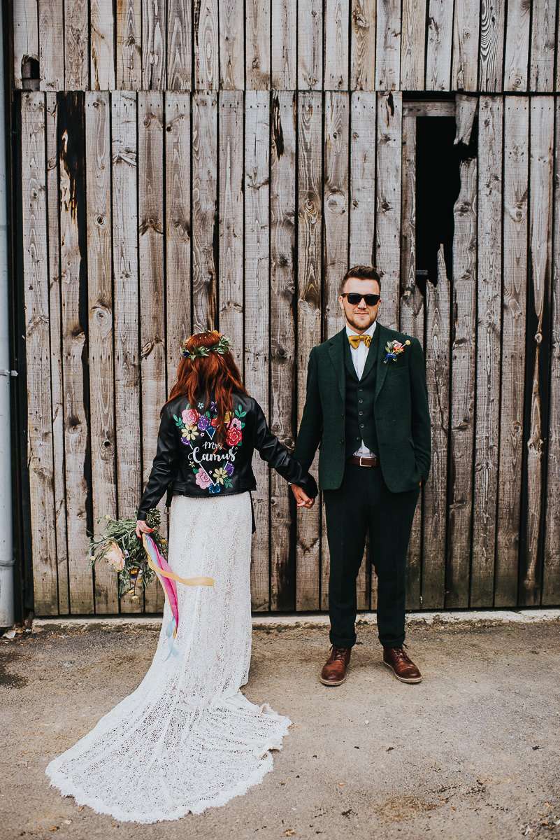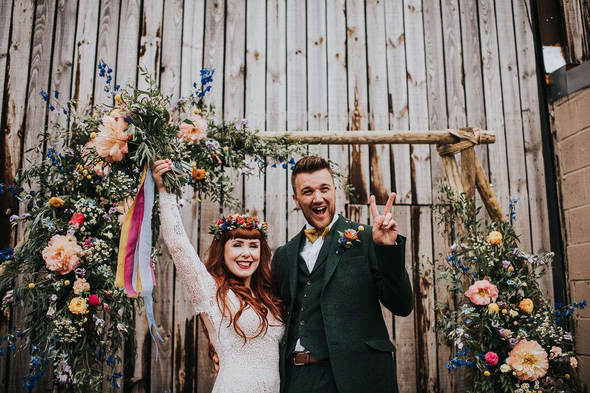 Bringing their musical love of musical theatre and colour into the day, Kayley and John were married at Deepdale Farm over the summer. They also had a number of very special guests, namely their pug, Frank, and a llama and alpaca who joined them for photos! All the decorations were designed and made by the couple themselves. Their particular favourites being the banners with musical quotes on.