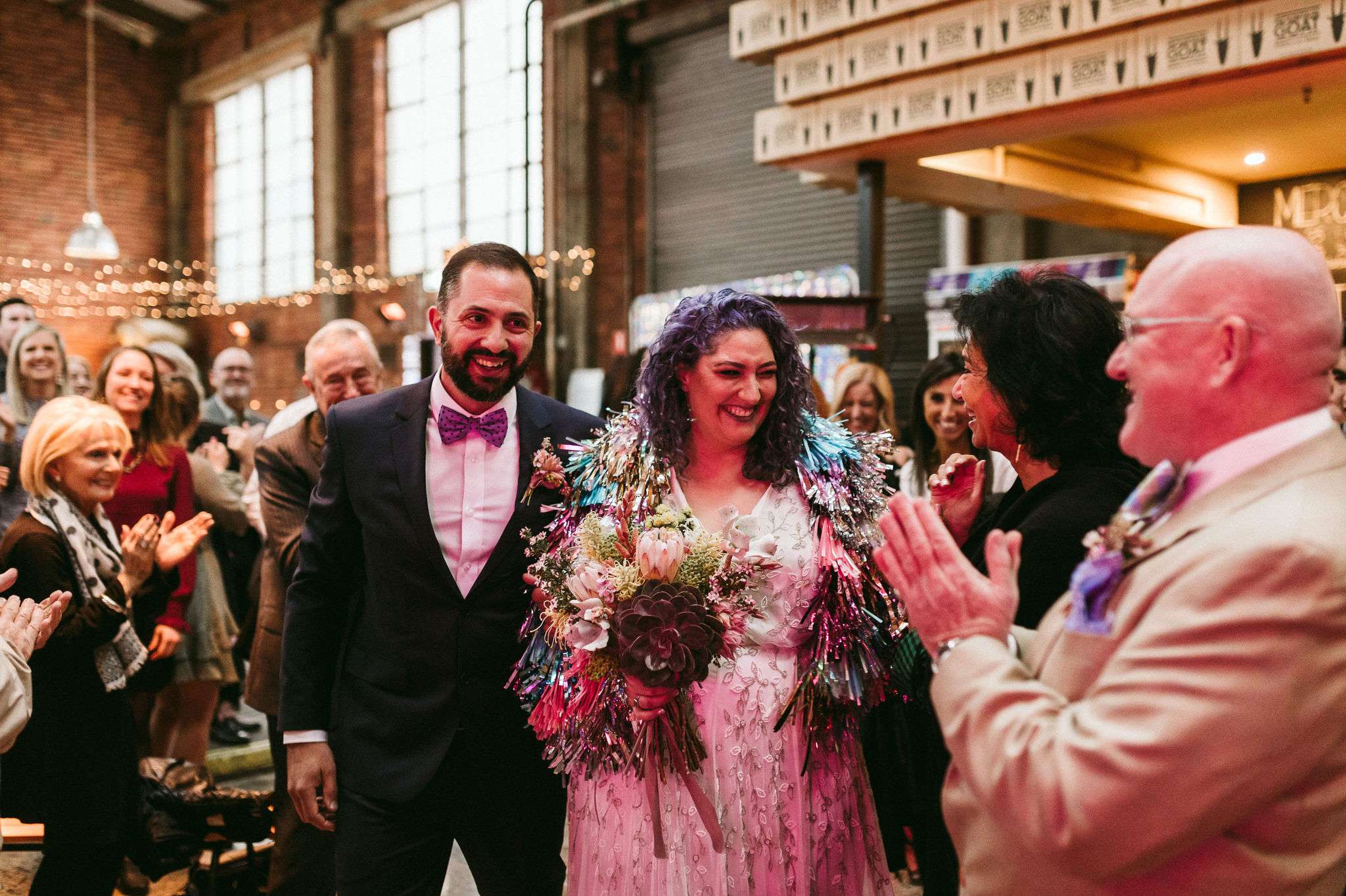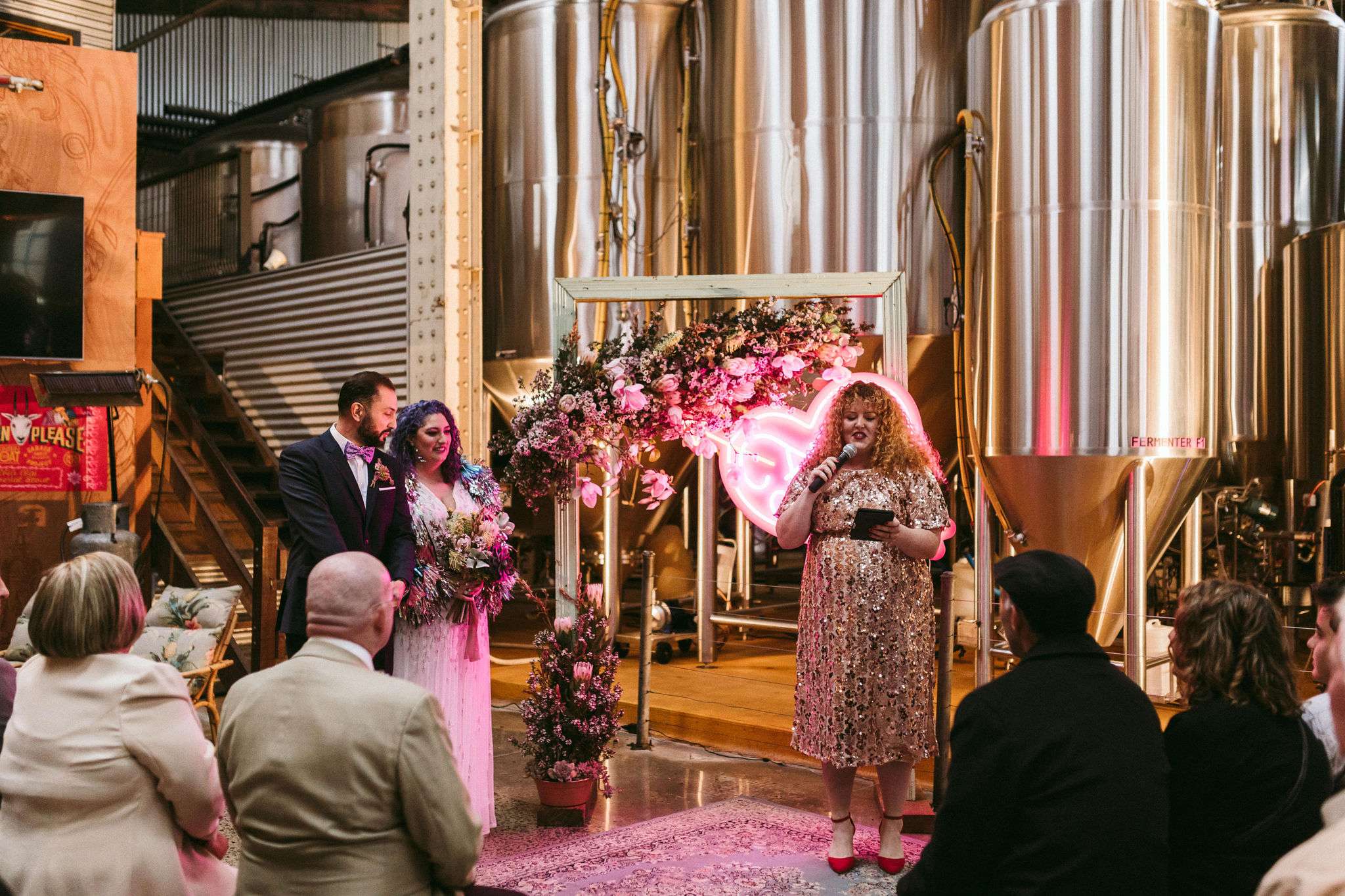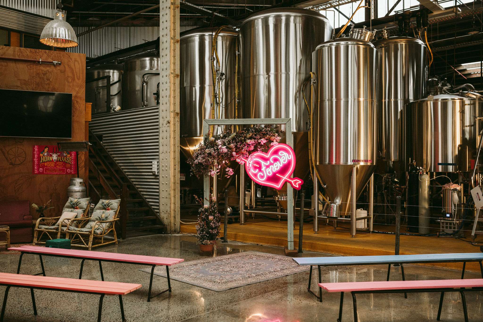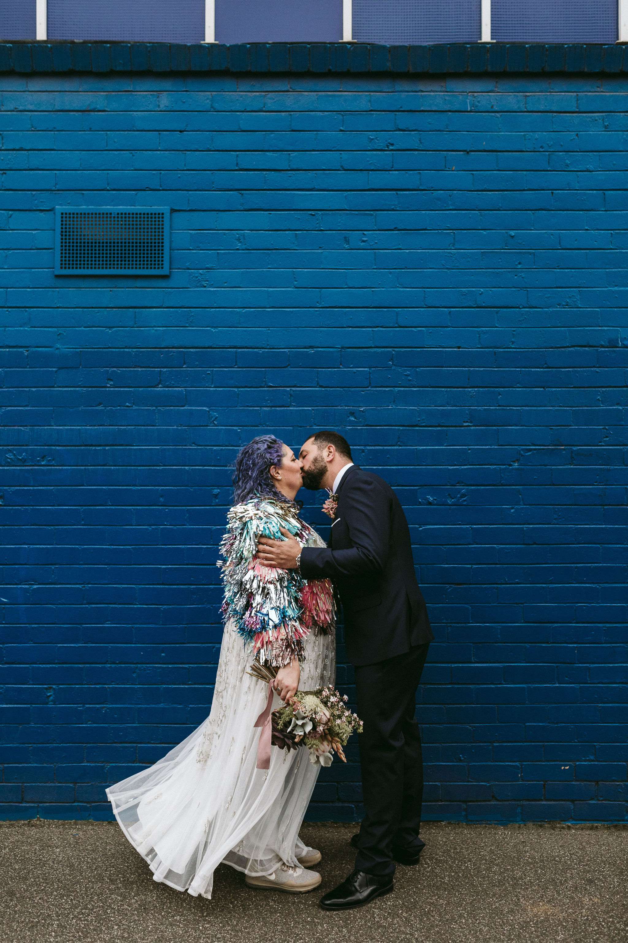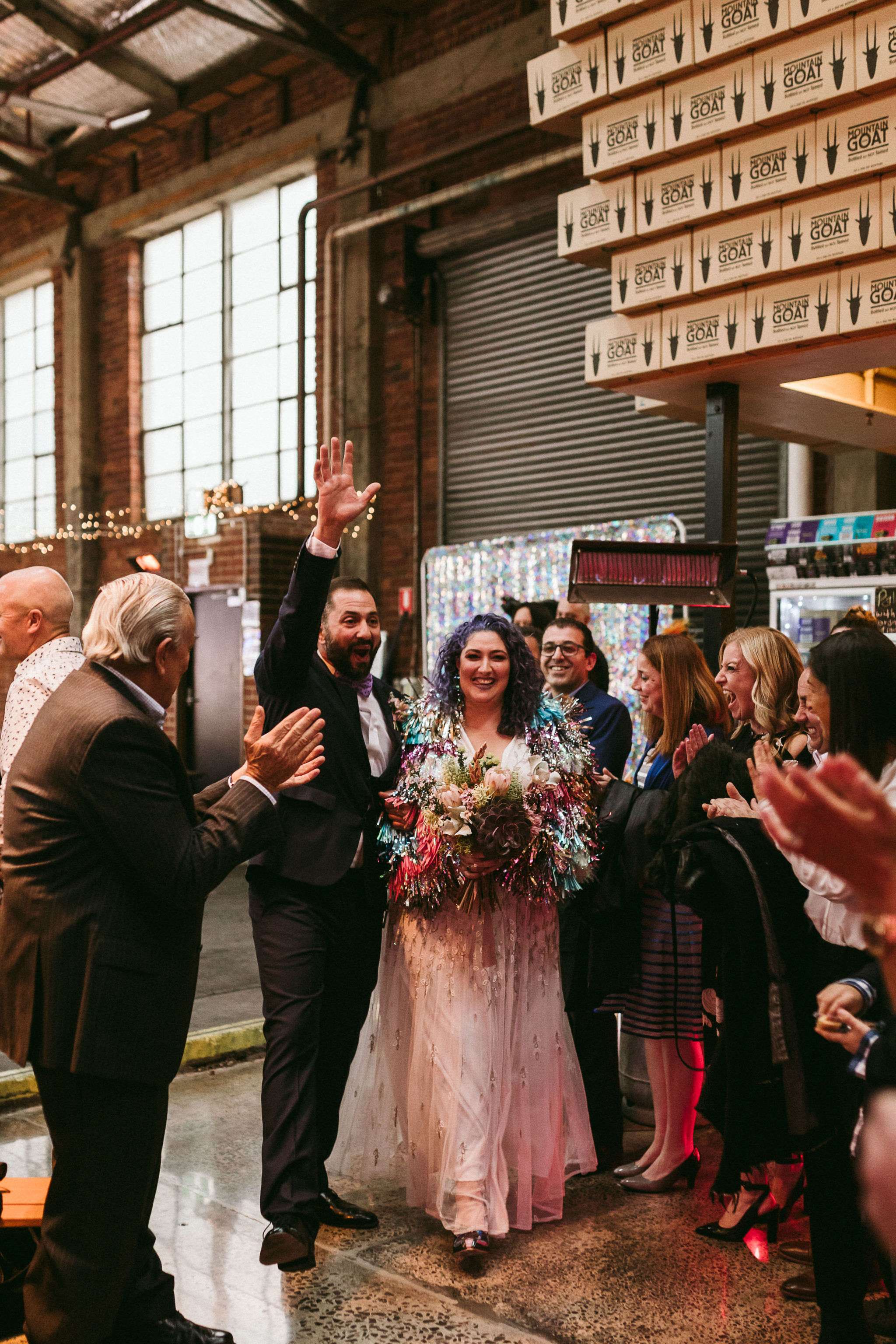 They made a conscious effort to step away from all the other weddings they’d attended and focused on creating a day that suited them. They were married at Mountain Goat Beer, a working, red brick, warehouse style brewery bar in Richmond, Australia. They put their focus, and majority of their budget, on the things important to them (namely, the catering!) and left behind stuff that didn’t matter to them (such as fancy transport). Their invites were sent via Paperless Post, and they didn’t have bridesmaids or groomsmen.