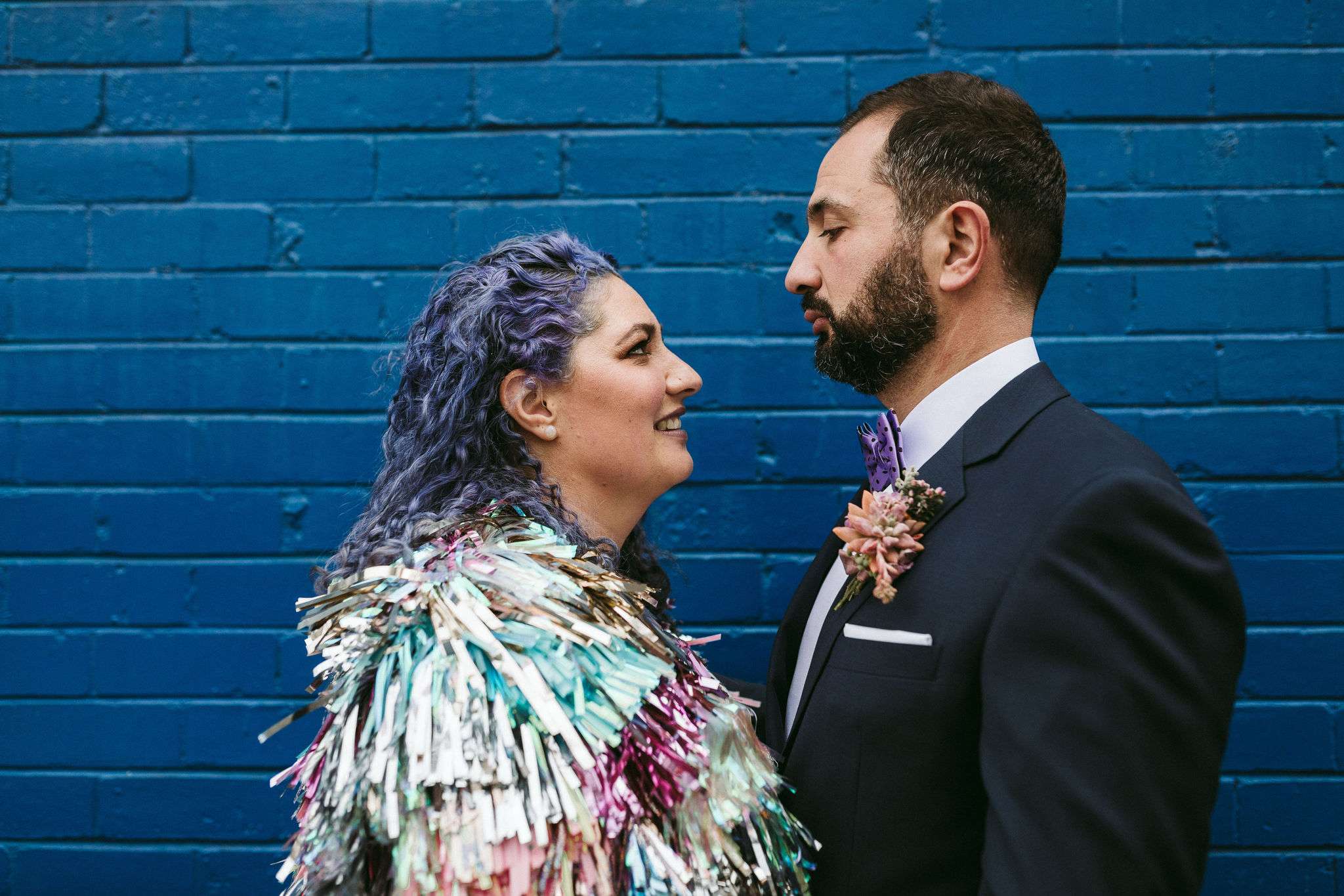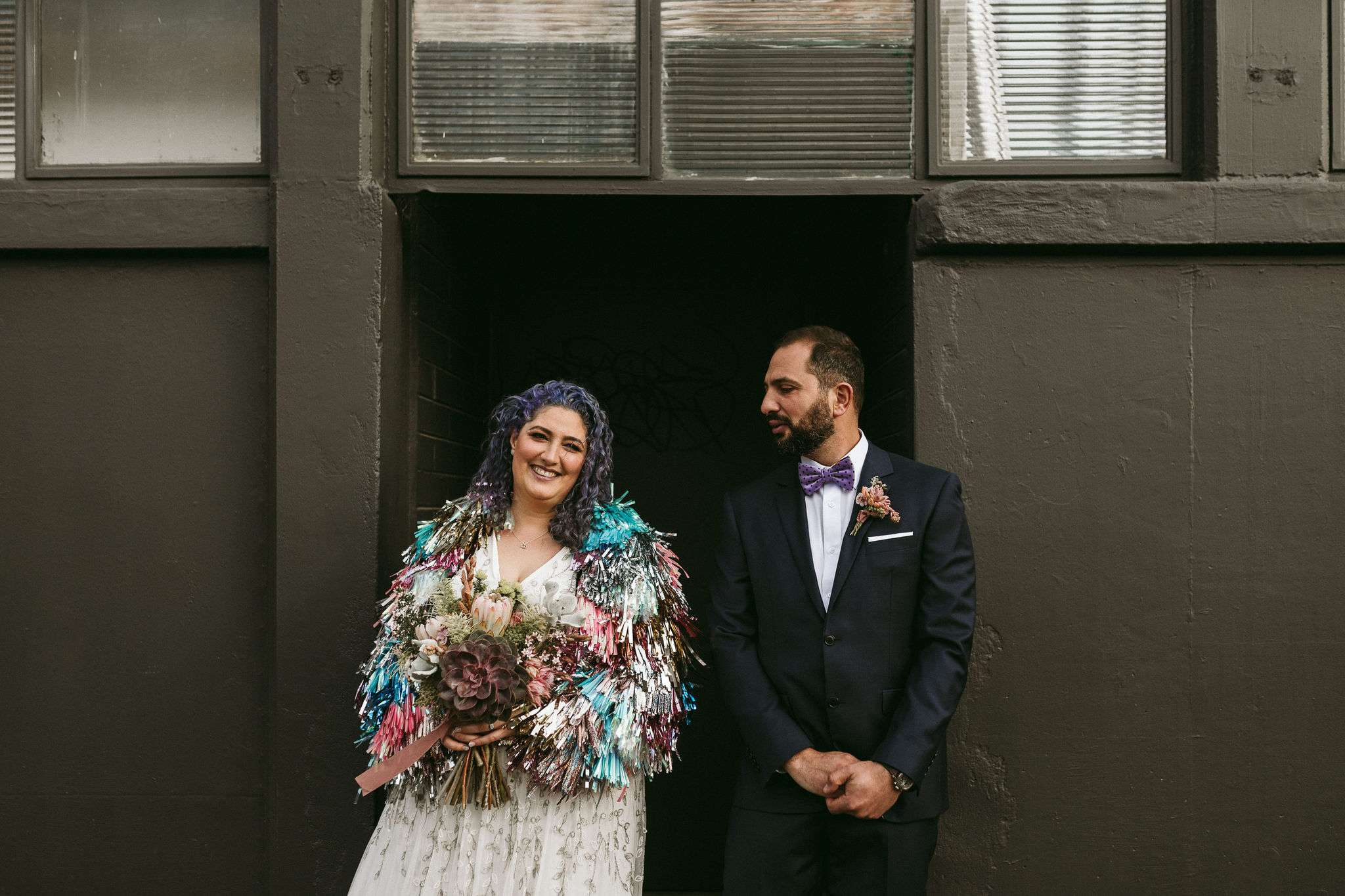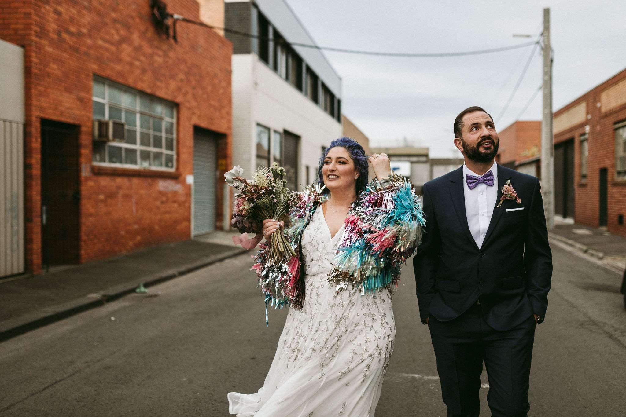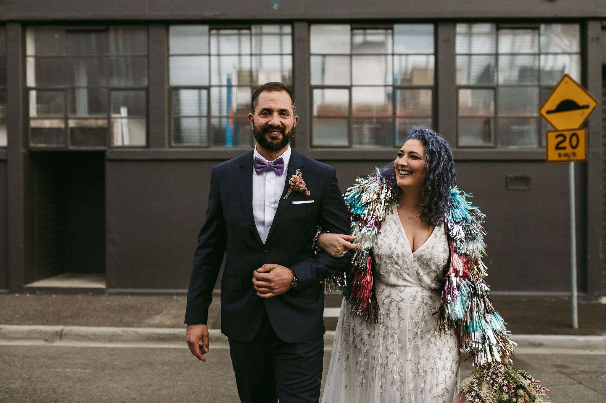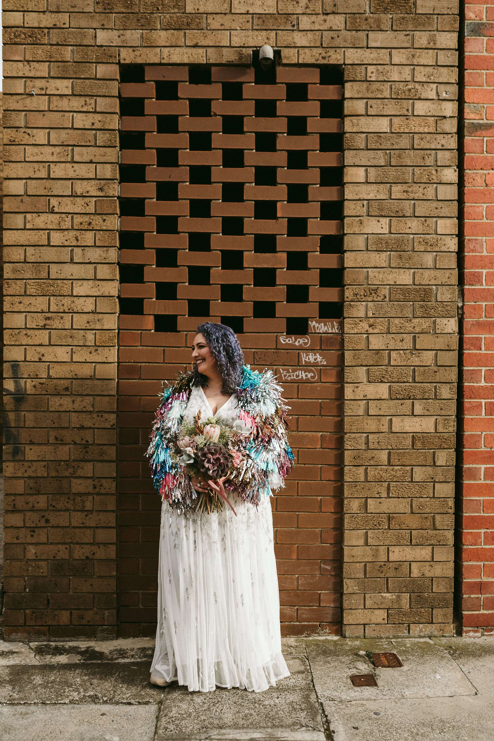 They made a conscious effort to step away from all the other weddings they’d attended and focused on creating a day that suited them. They were married at Mountain Goat Beer, a working, red brick, warehouse style brewery bar in Richmond, Australia. They put their focus, and majority of their budget, on the things important to them (namely, the catering!) and left behind stuff that didn’t matter to them (such as fancy transport). Their invites were sent via Paperless Post, and they didn’t have bridesmaids or groomsmen.