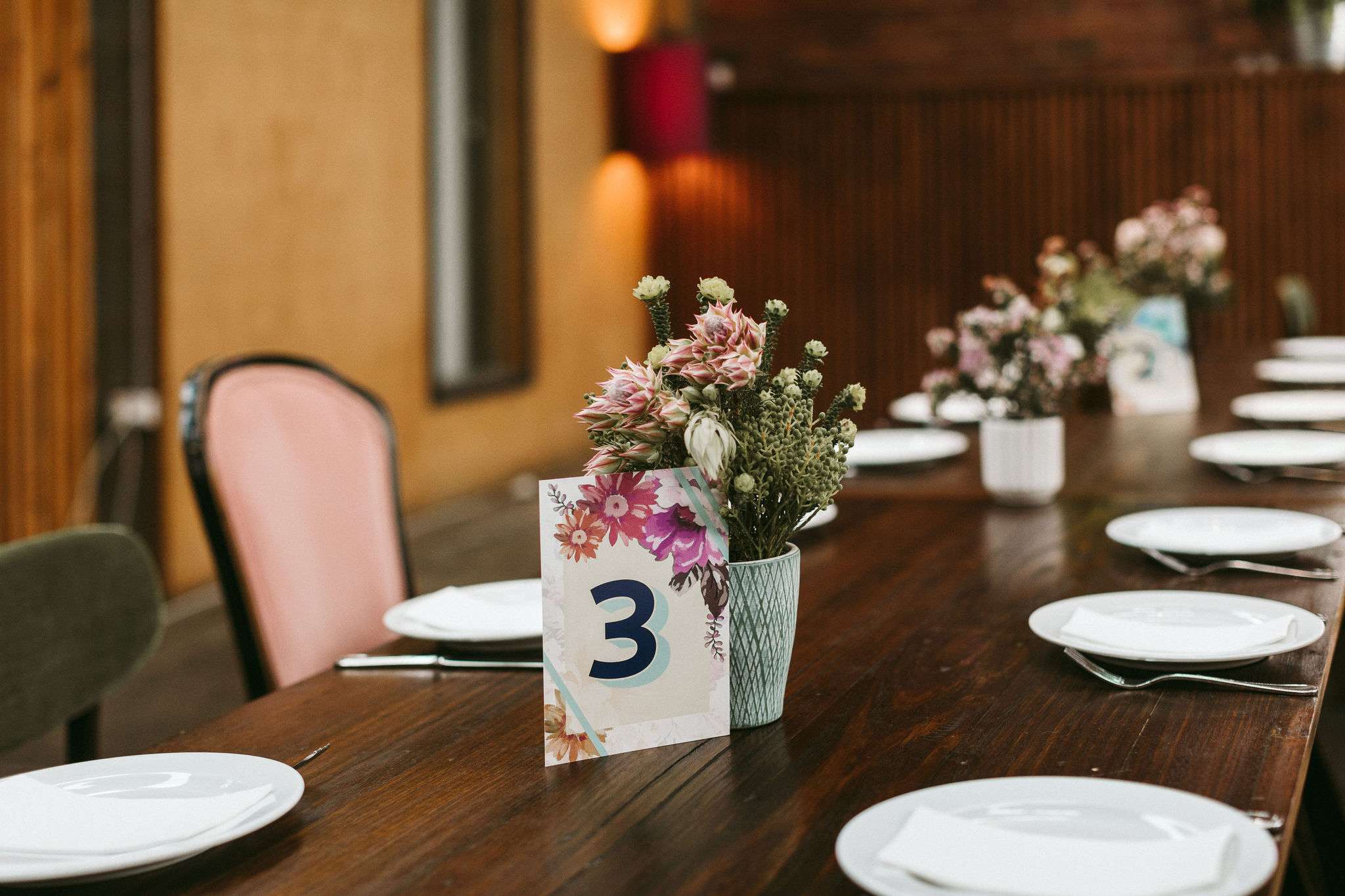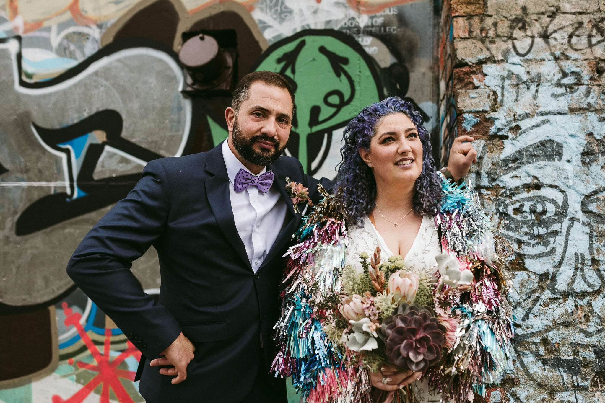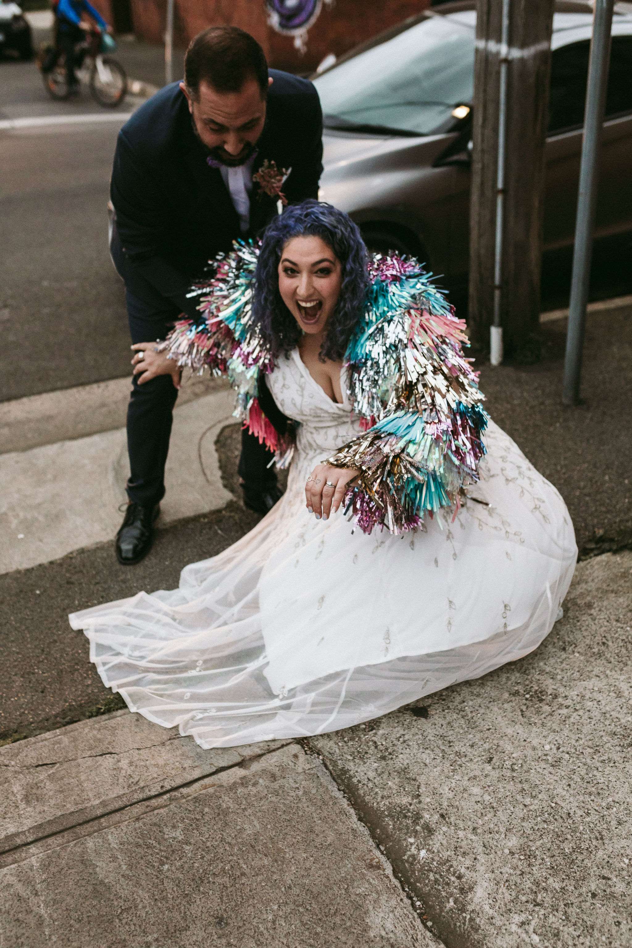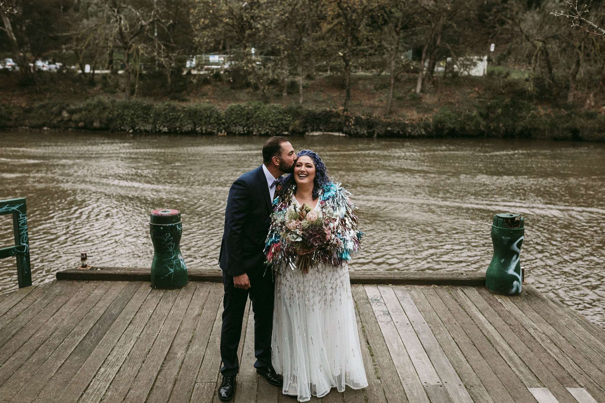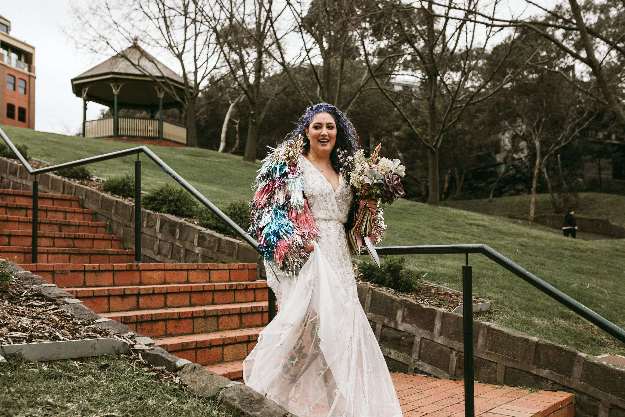 They made a conscious effort to step away from all the other weddings they’d attended and focused on creating a day that suited them. They were married at Mountain Goat Beer, a working, red brick, warehouse style brewery bar in Richmond, Australia. They put their focus, and majority of their budget, on the things important to them (namely, the catering!) and left behind stuff that didn’t matter to them (such as fancy transport). Their invites were sent via Paperless Post, and they didn’t have bridesmaids or groomsmen.