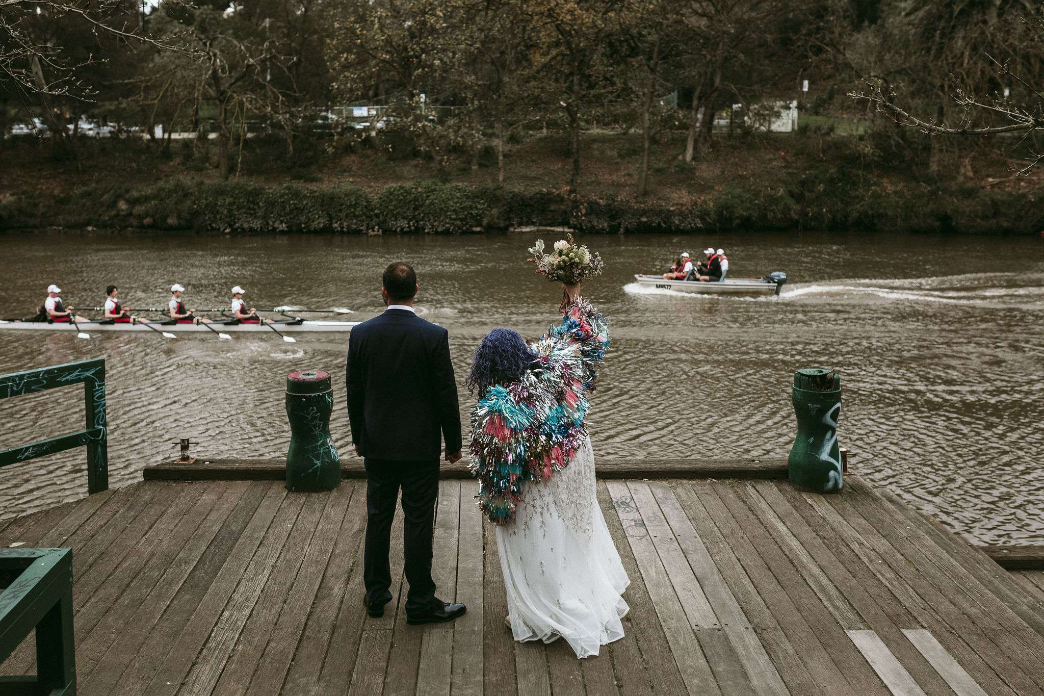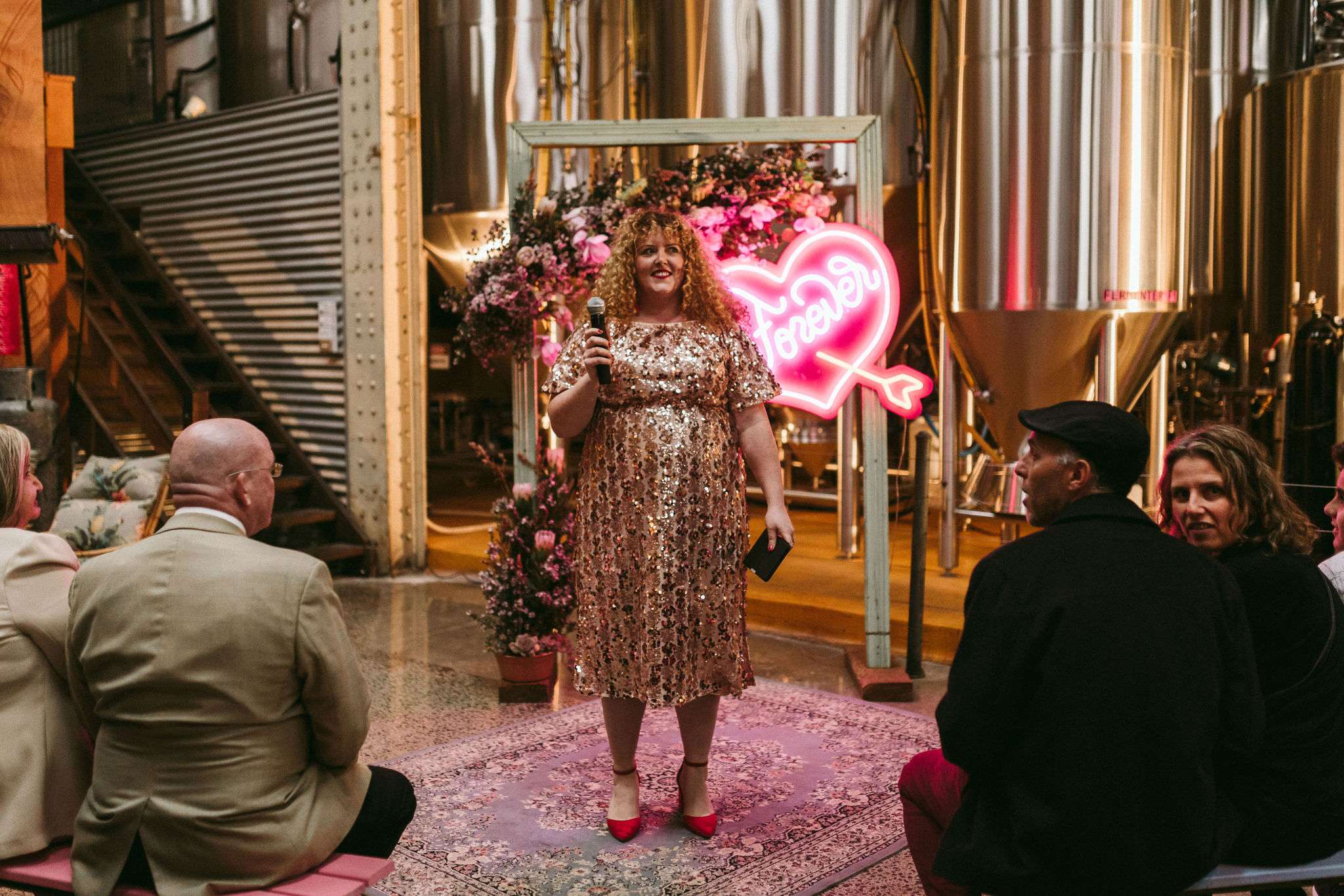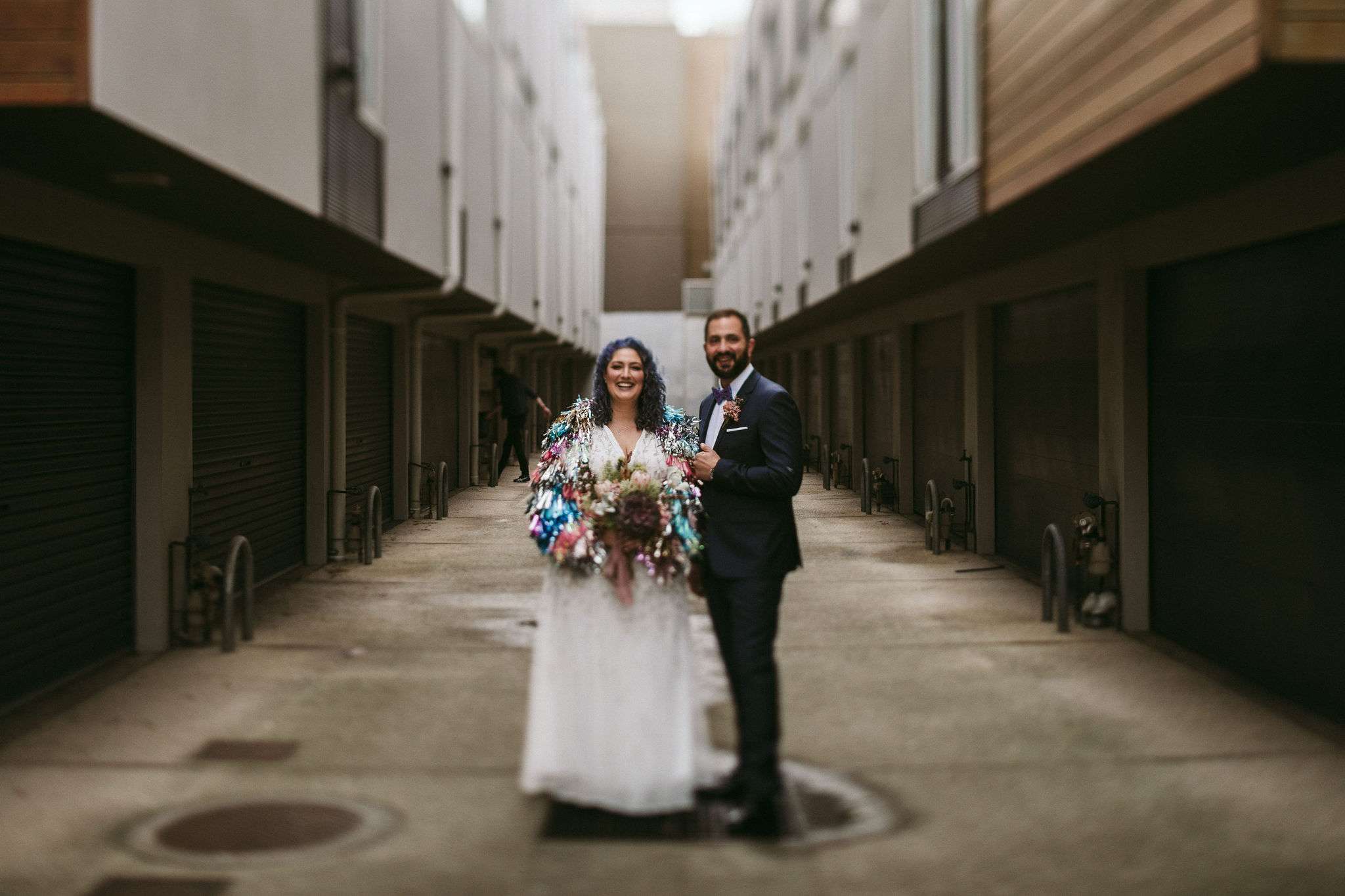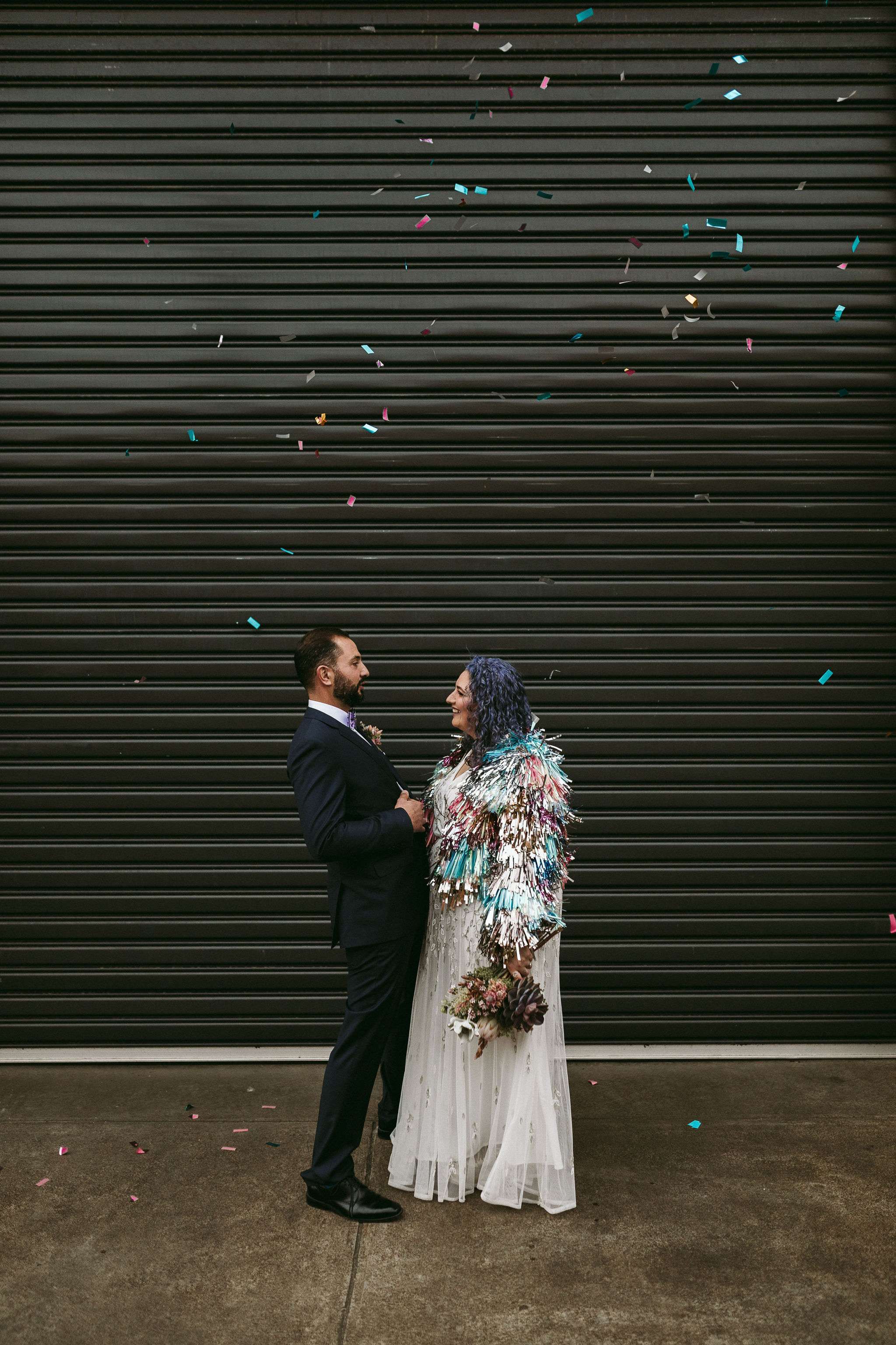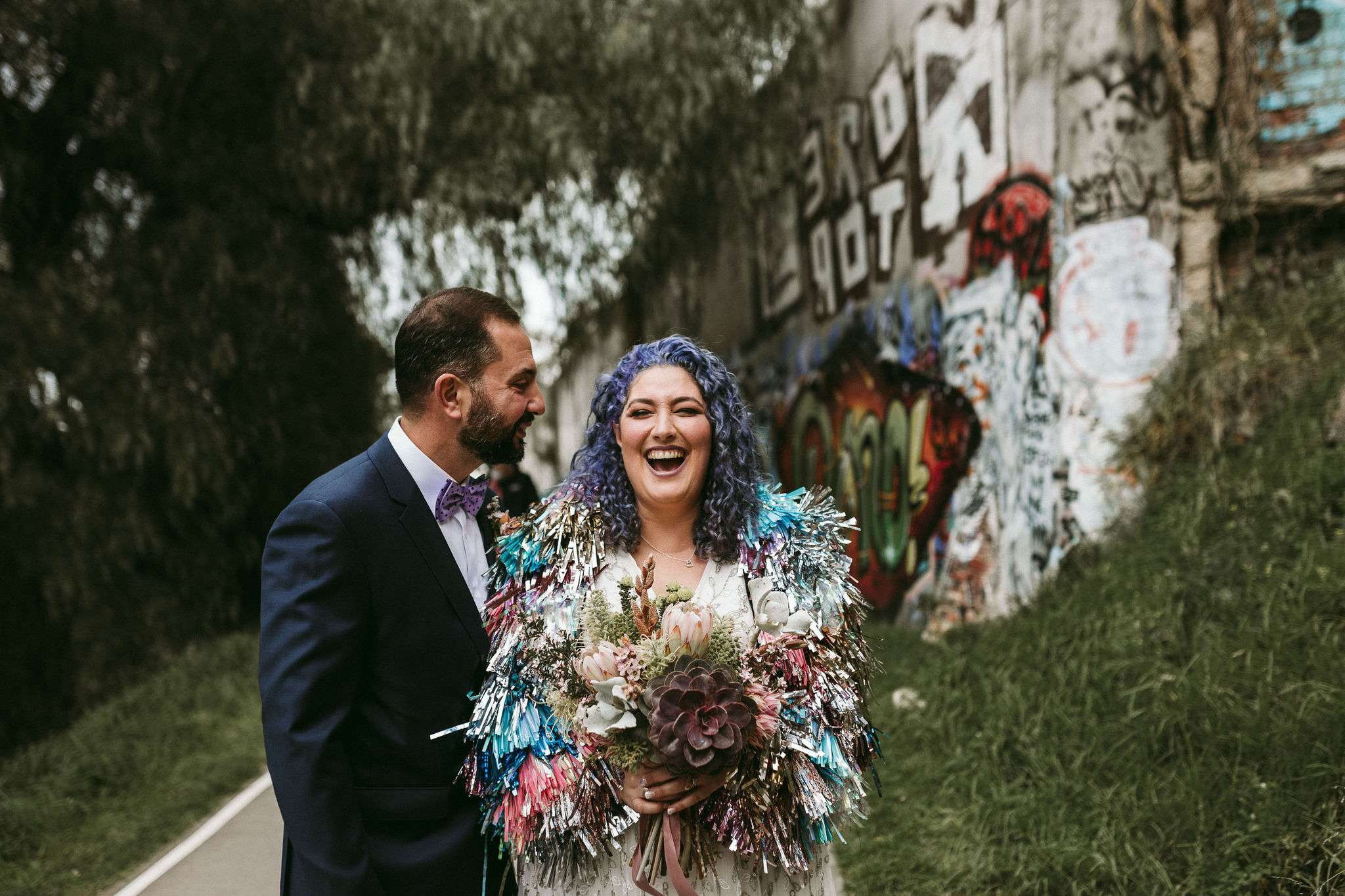 They made a conscious effort to step away from all the other weddings they’d attended and focused on creating a day that suited them. They were married at Mountain Goat Beer, a working, red brick, warehouse style brewery bar in Richmond, Australia. They put their focus, and majority of their budget, on the things important to them (namely, the catering!) and left behind stuff that didn’t matter to them (such as fancy transport). Their invites were sent via Paperless Post, and they didn’t have bridesmaids or groomsmen.