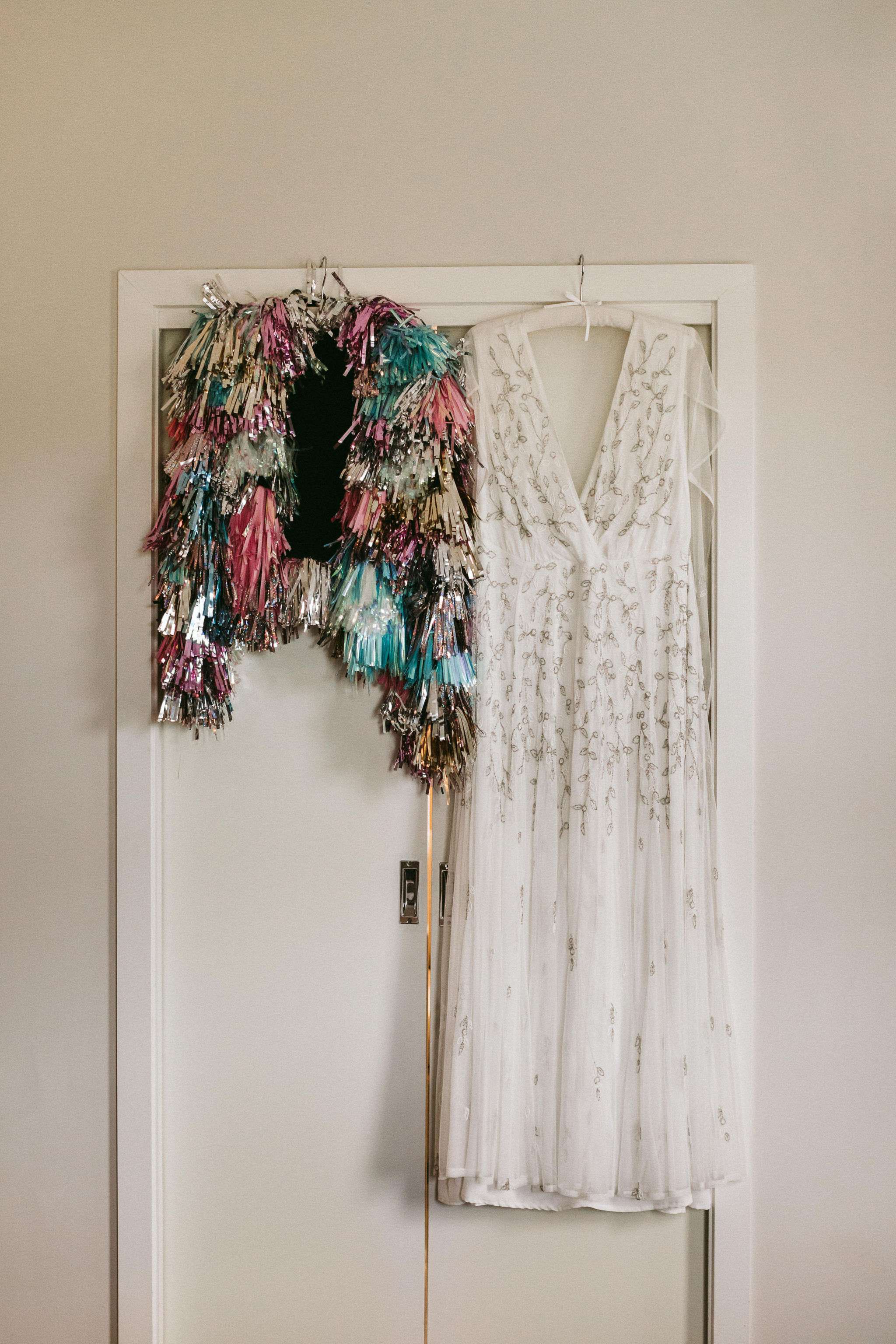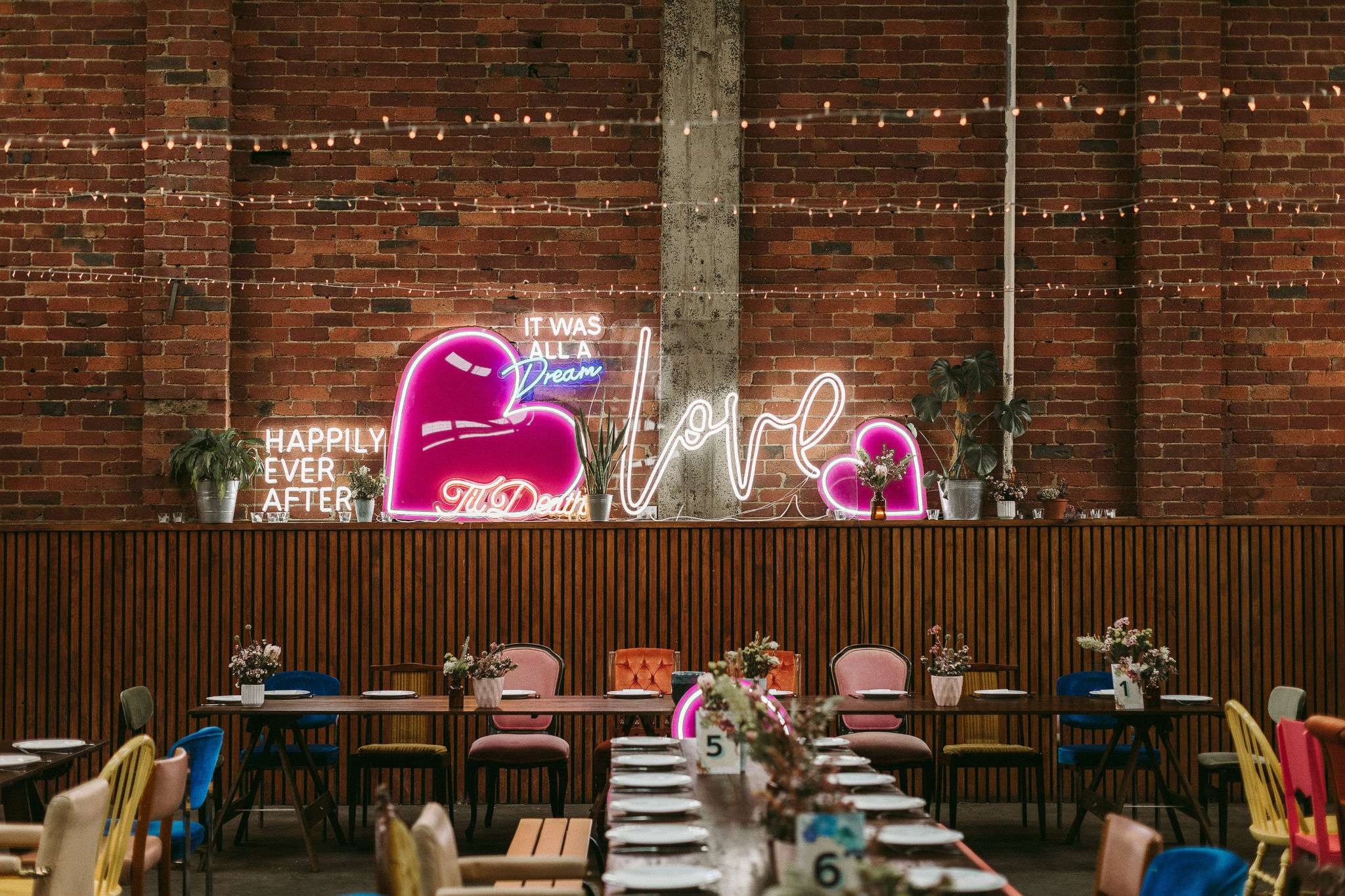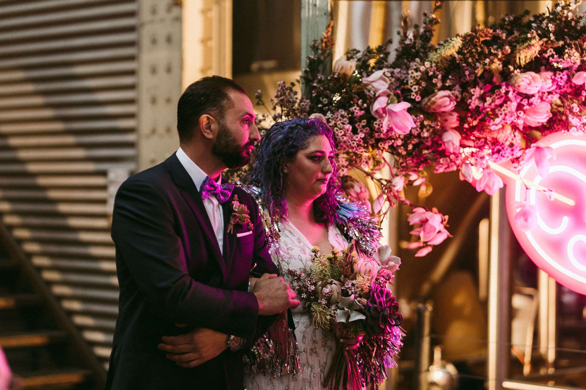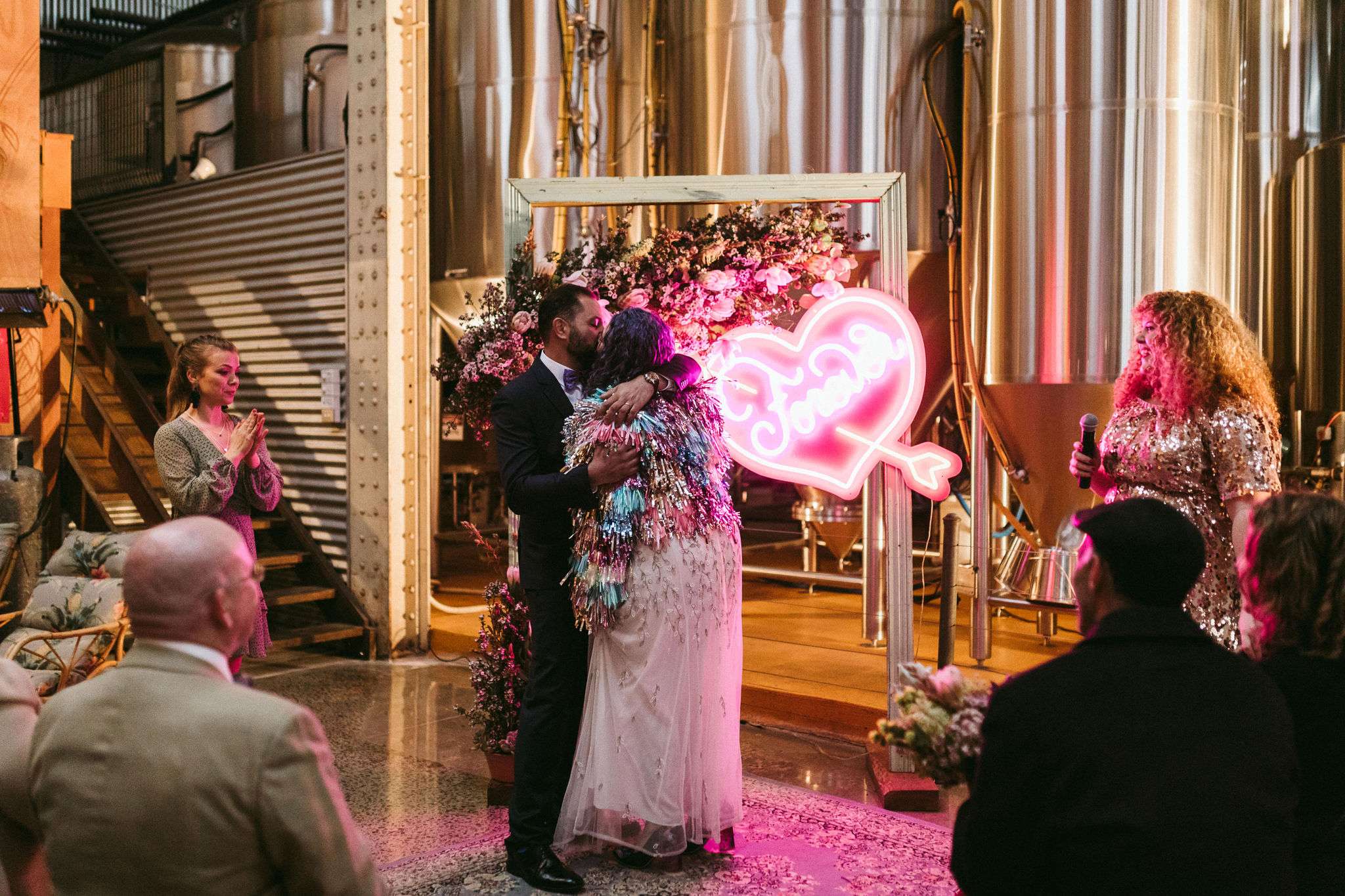 Esther wore an embellished cape wedding dress from ASOS, paired with Irregular Choice shoes (and Nikes for walking) and an incredible Rachel Burke jacket. They continued the relaxed disco-vibe with their reception decor; pairing neon signs with sumptuous florals by Good Grace and Humour. They added homely, vintage furniture with sequin backdrops and fairy lights. It’s no surprise that their favourite thing about planning the day was getting all the details just right.