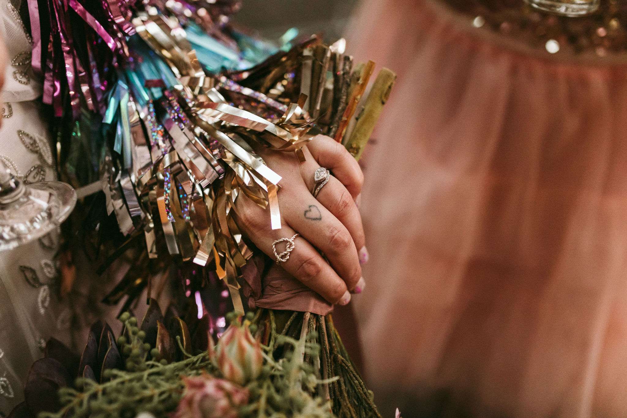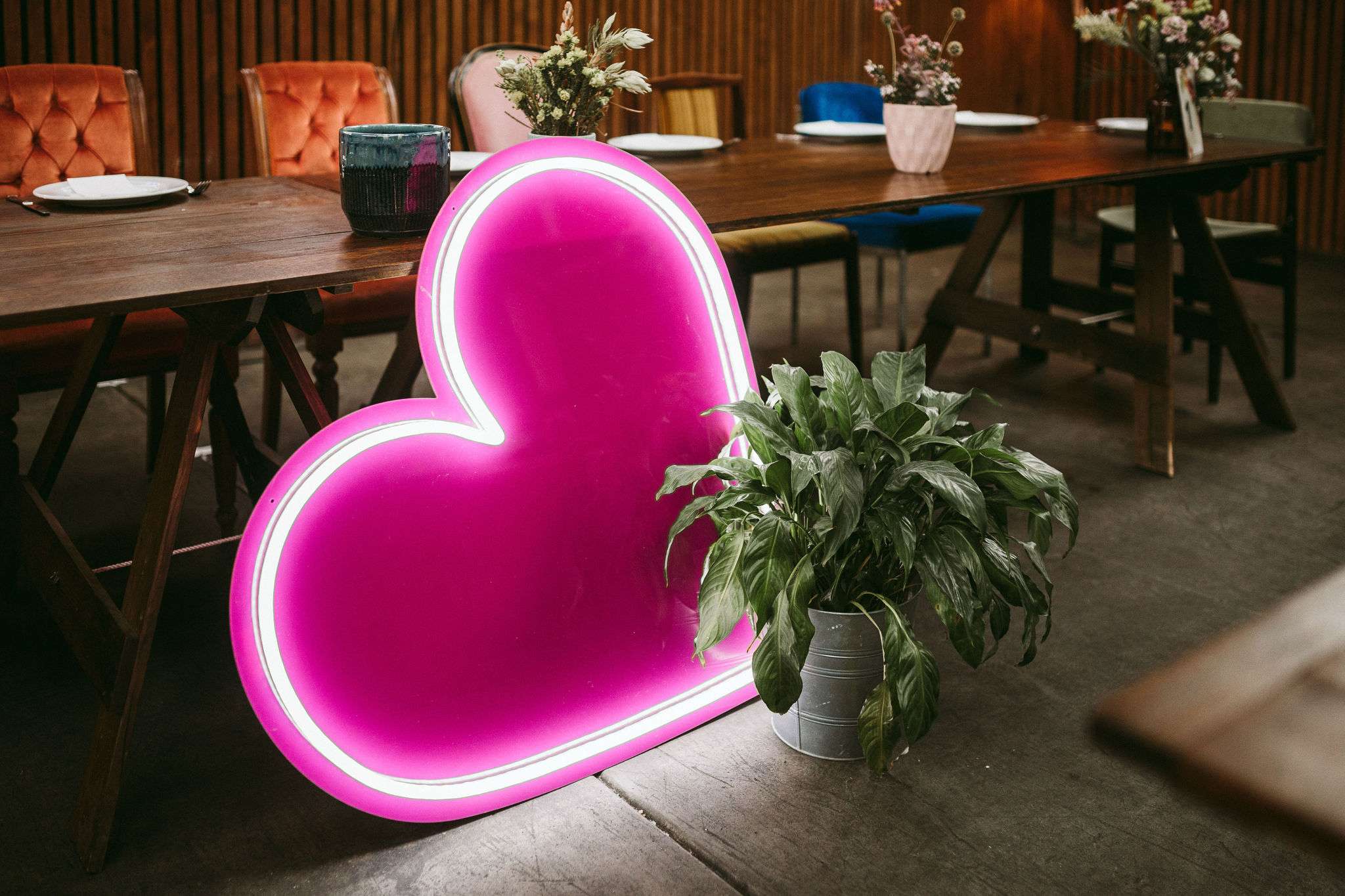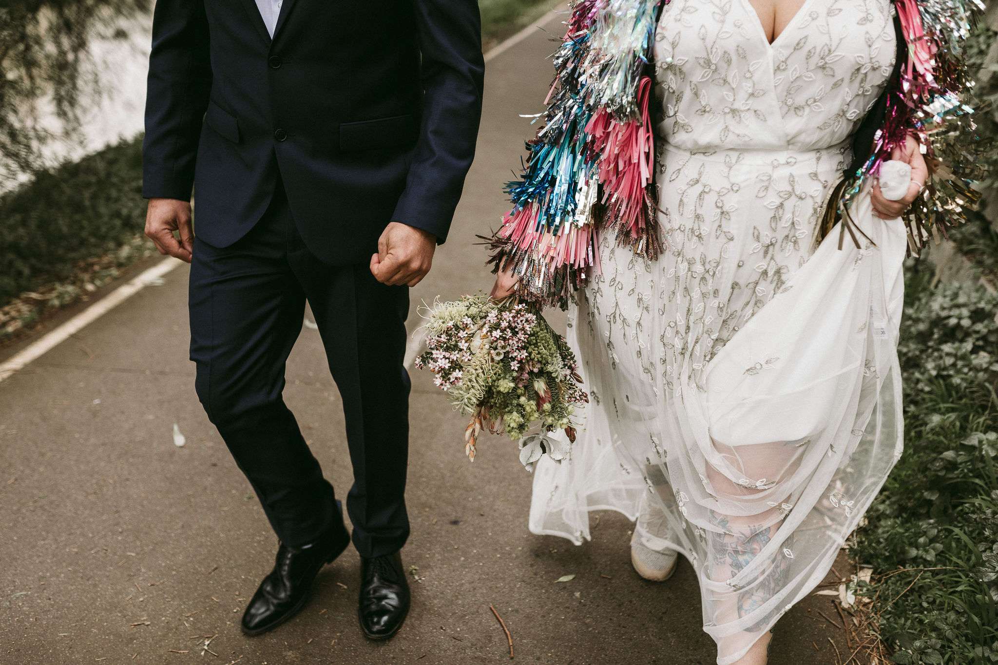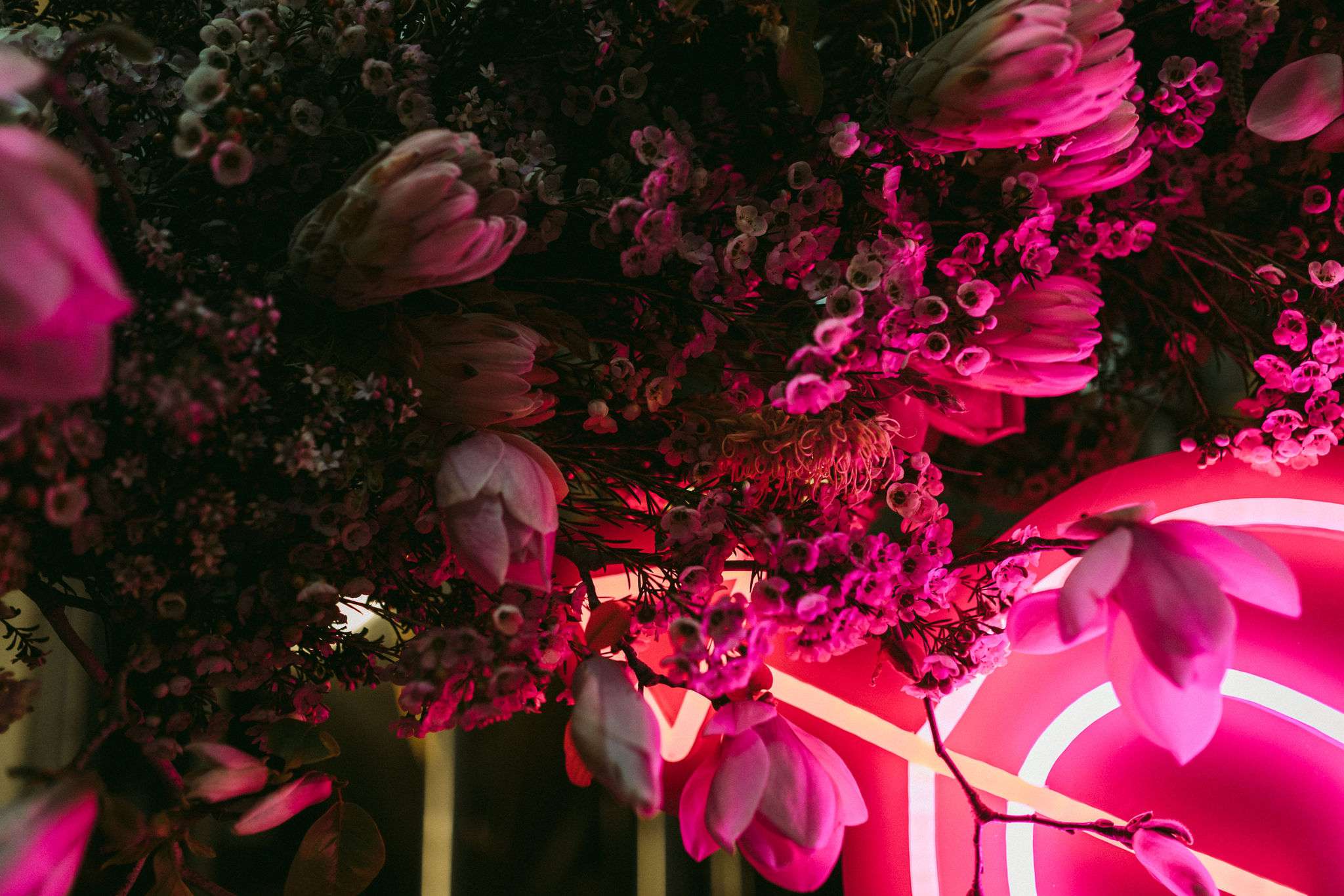 Esther wore an embellished cape wedding dress from ASOS, paired with Irregular Choice shoes (and Nikes for walking) and an incredible Rachel Burke jacket. They continued the relaxed disco-vibe with their reception decor; pairing neon signs with sumptuous florals by Good Grace and Humour. They added homely, vintage furniture with sequin backdrops and fairy lights. It’s no surprise that their favourite thing about planning the day was getting all the details just right.