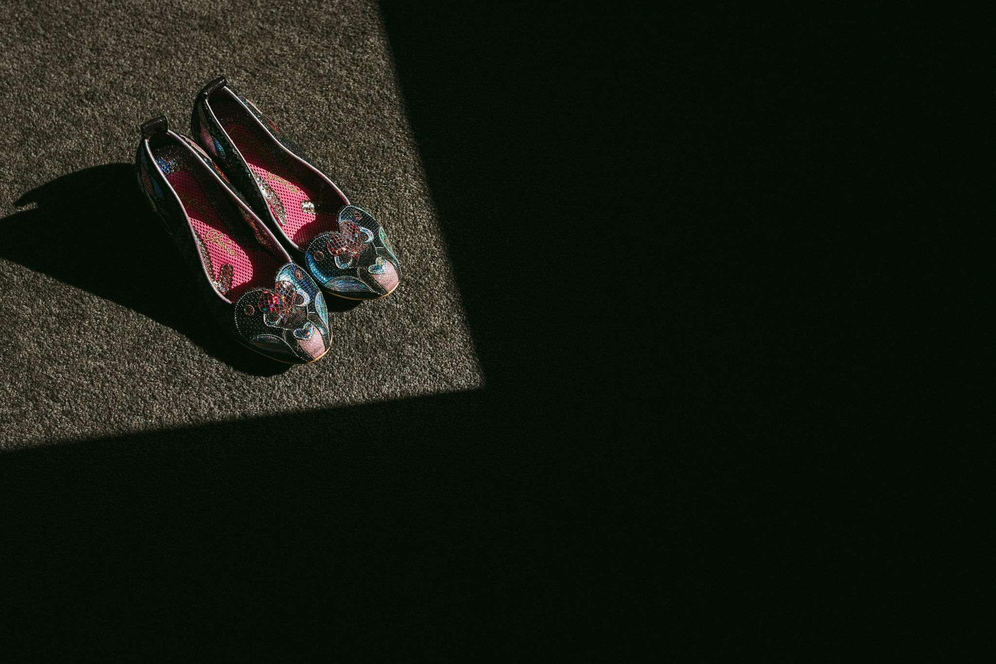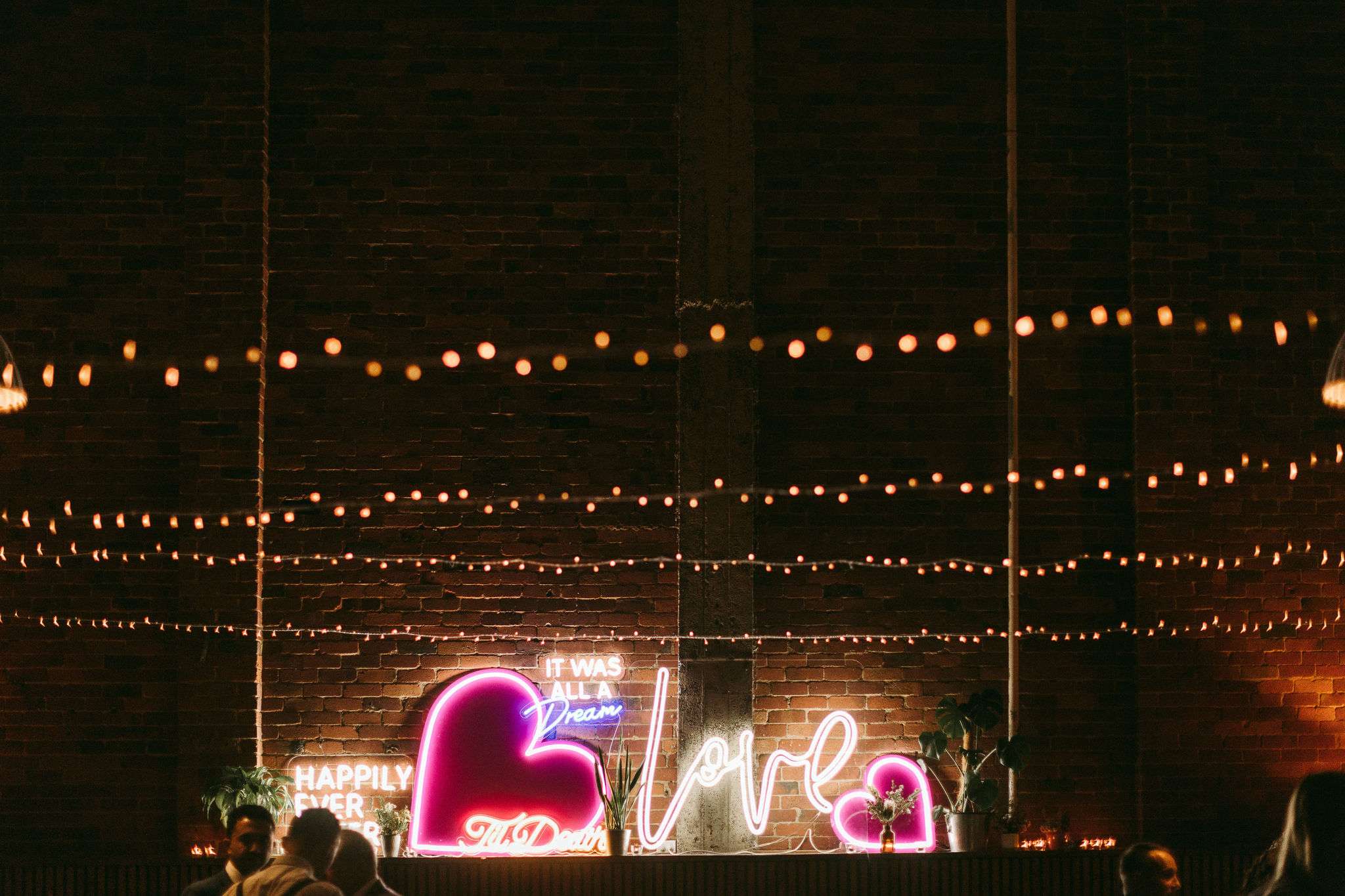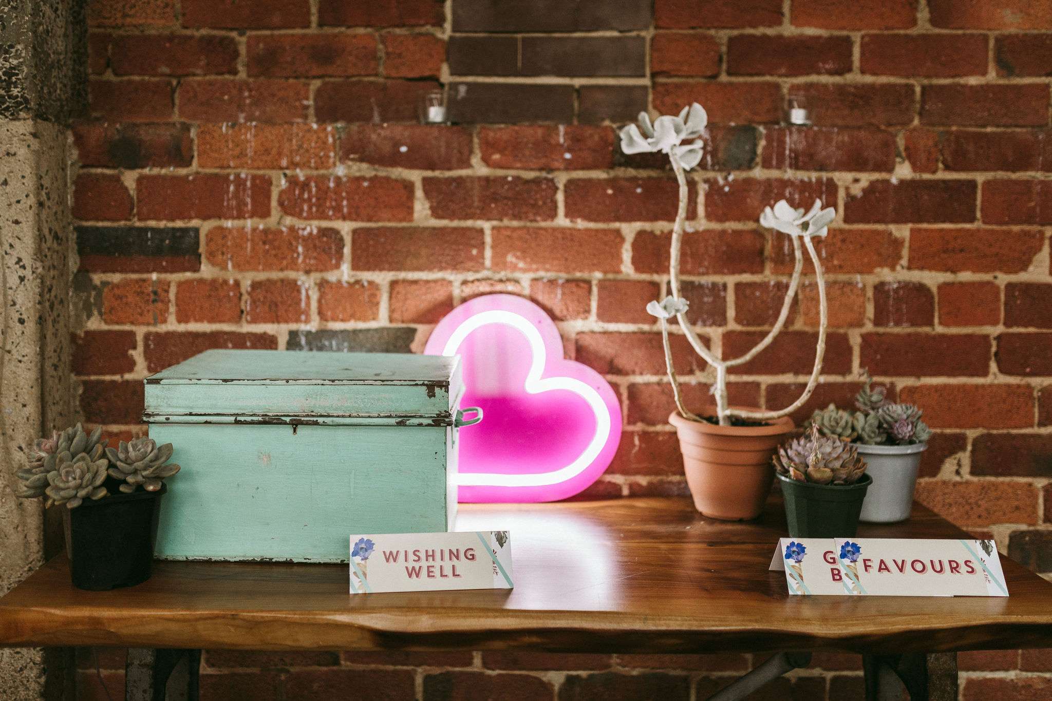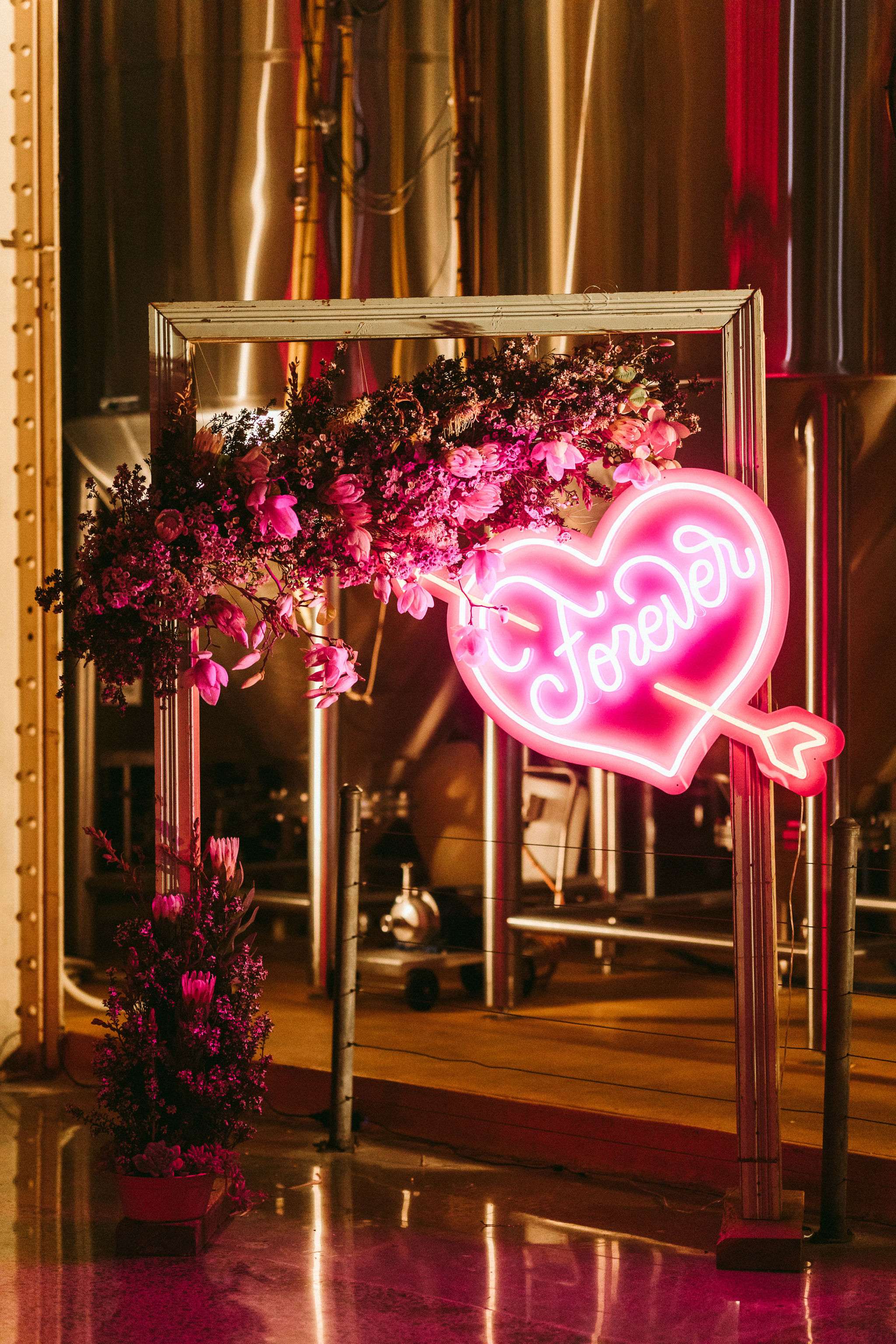 Esther wore an embellished cape wedding dress from ASOS, paired with Irregular Choice shoes (and Nikes for walking) and an incredible Rachel Burke jacket. They continued the relaxed disco-vibe with their reception decor; pairing neon signs with sumptuous florals by Good Grace and Humour. They added homely, vintage furniture with sequin backdrops and fairy lights. It’s no surprise that their favourite thing about planning the day was getting all the details just right.