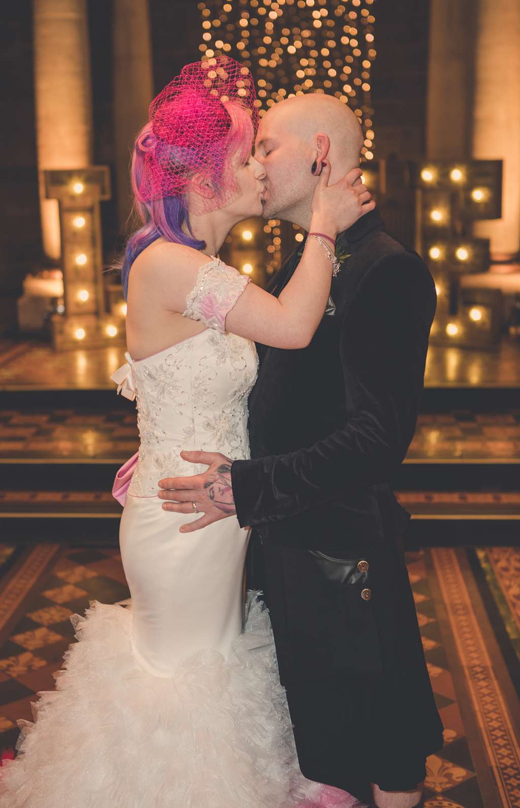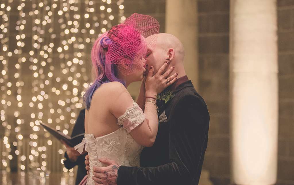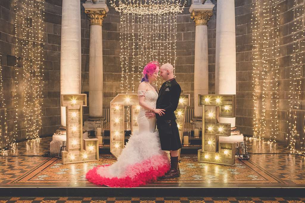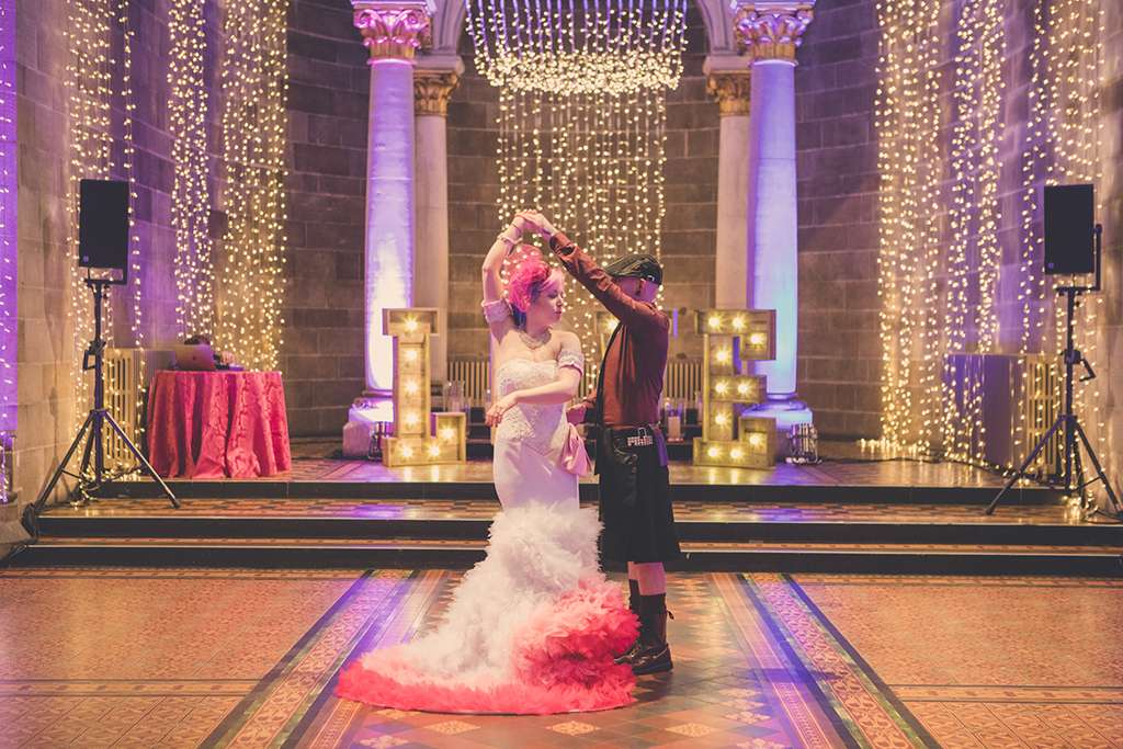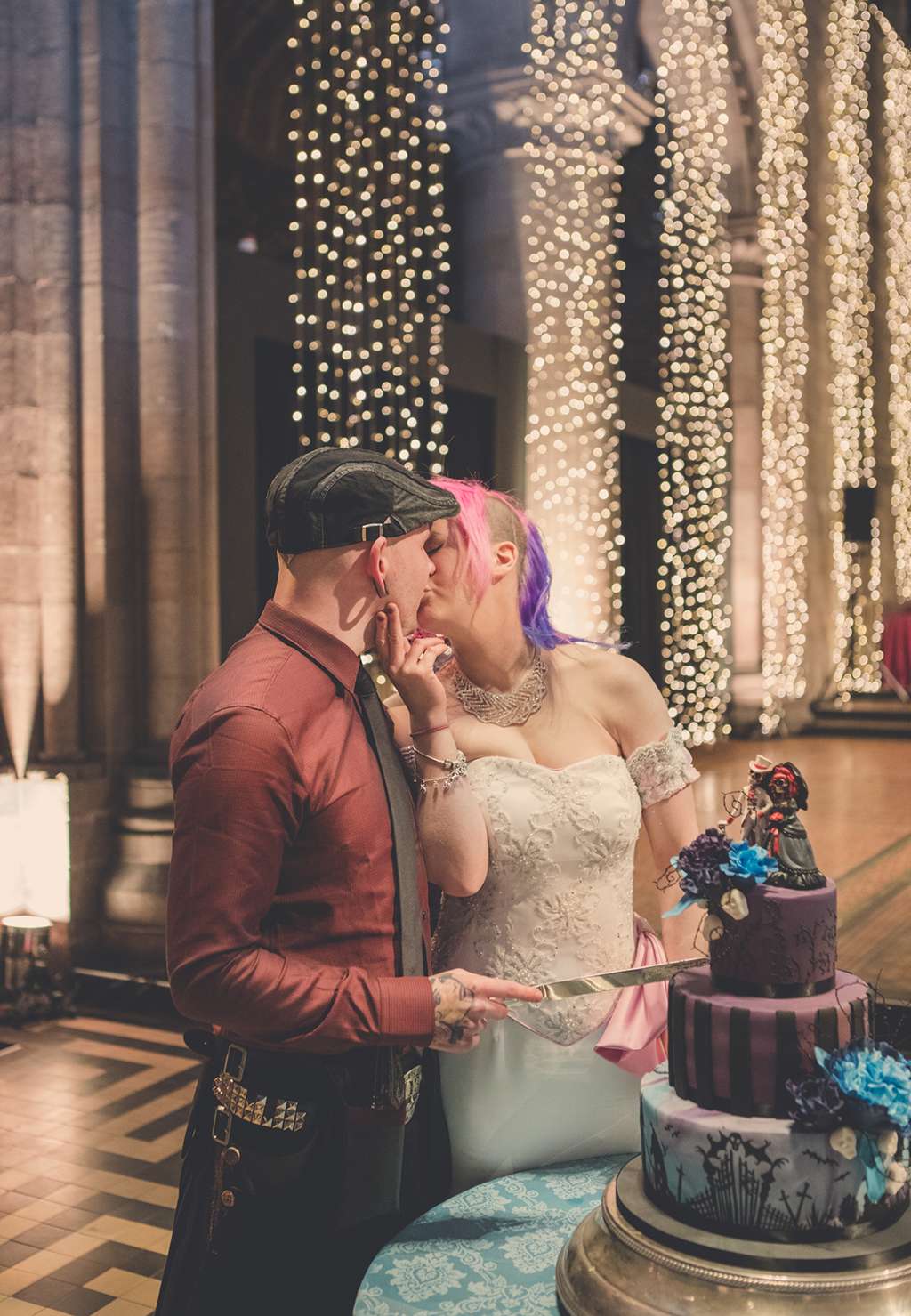 Instead of a traditional, sit-down wedding breakfast, they had a buffet, with all their favourite food; mini burgers and chips with curry sauce! They took inspiration from Tim Burton and Alice in Wonderland with coloured fairy lights, a blue and purple vegan cake with three different chocolate based layers and colourful unique outfits that represented them better than the usual ivory and white.
