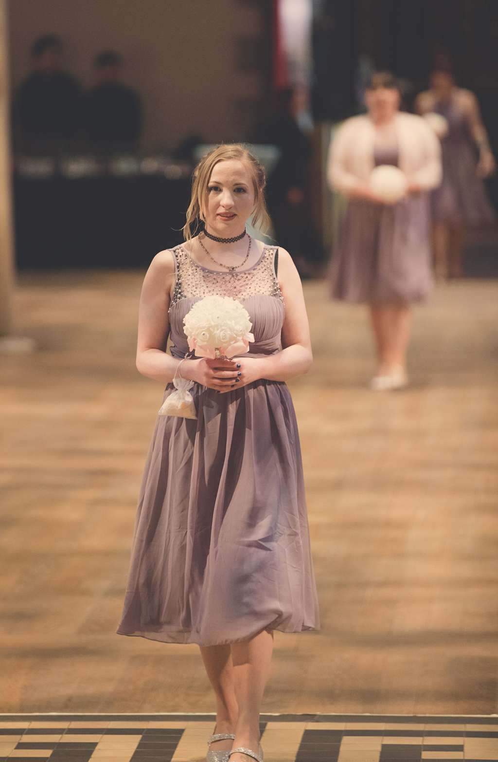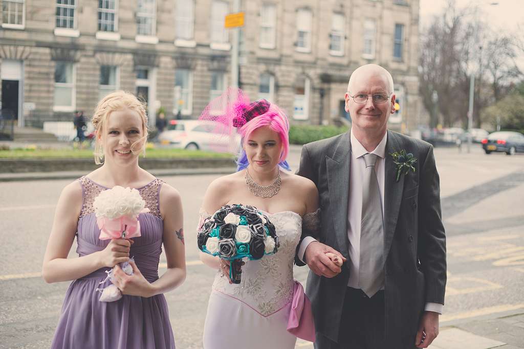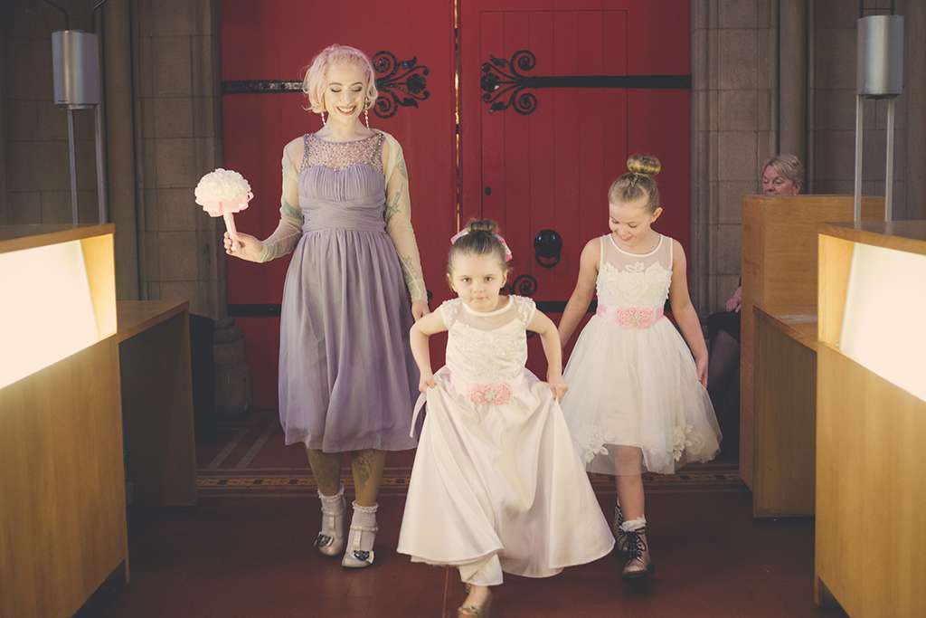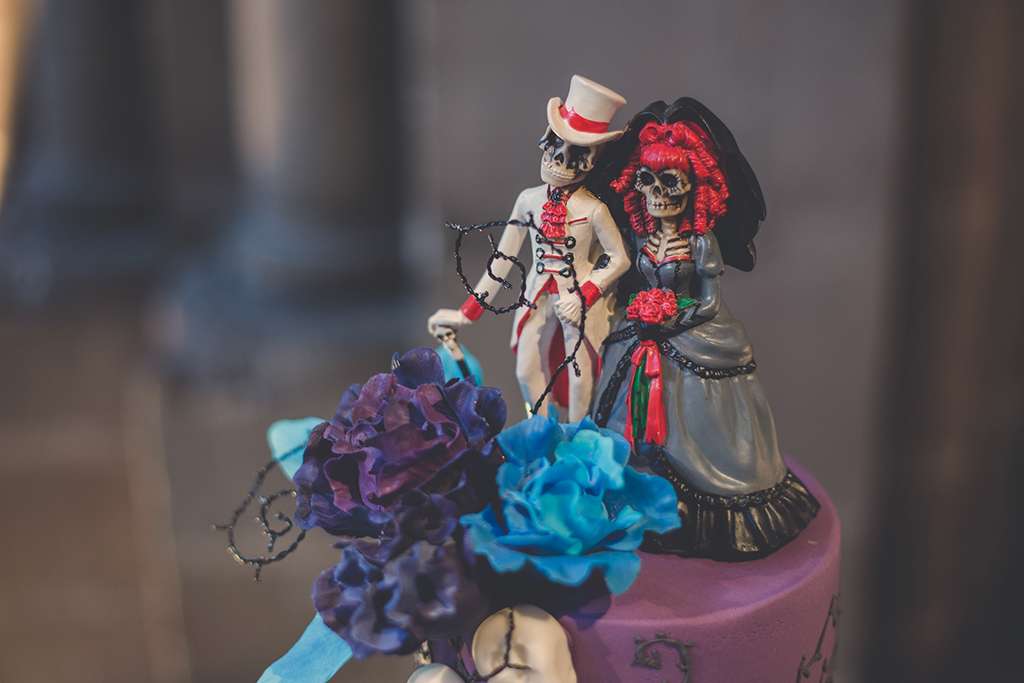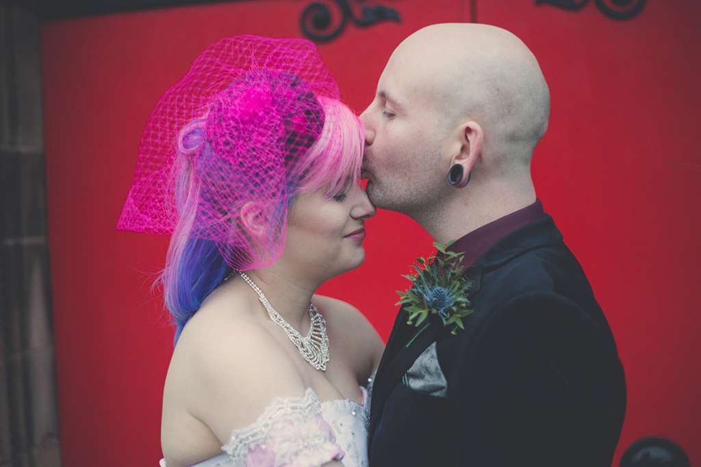 Instead of a traditional, sit-down wedding breakfast, they had a buffet, with all their favourite food; mini burgers and chips with curry sauce! They took inspiration from Tim Burton and Alice in Wonderland with coloured fairy lights, a blue and purple vegan cake with three different chocolate based layers and colourful unique outfits that represented them better than the usual ivory and white.