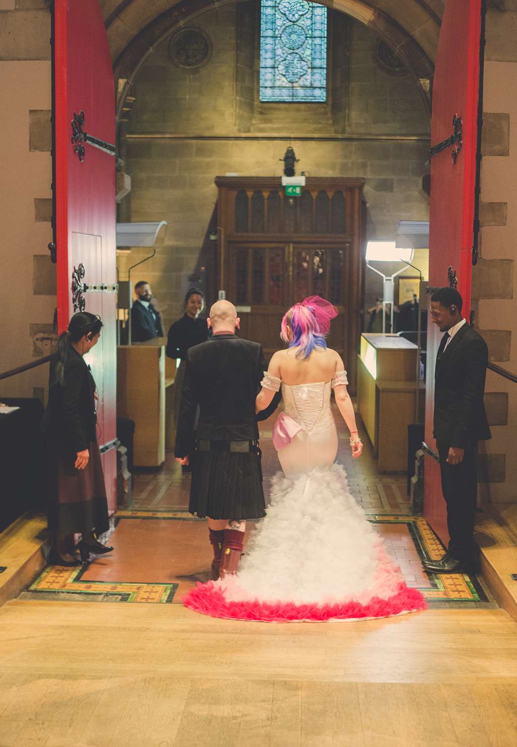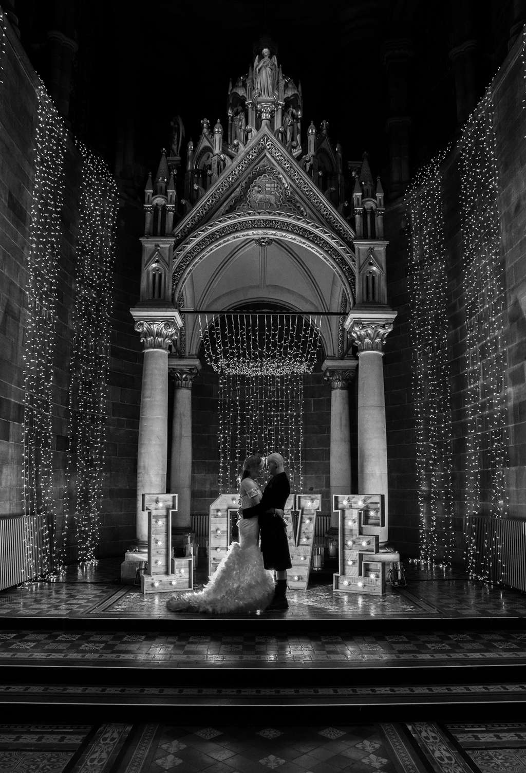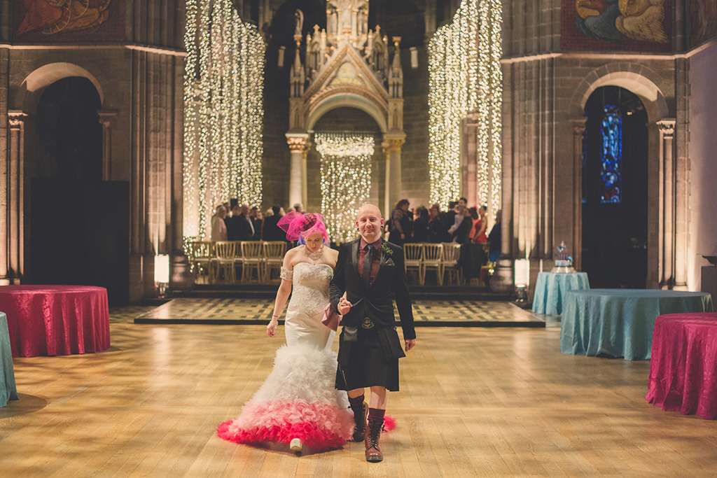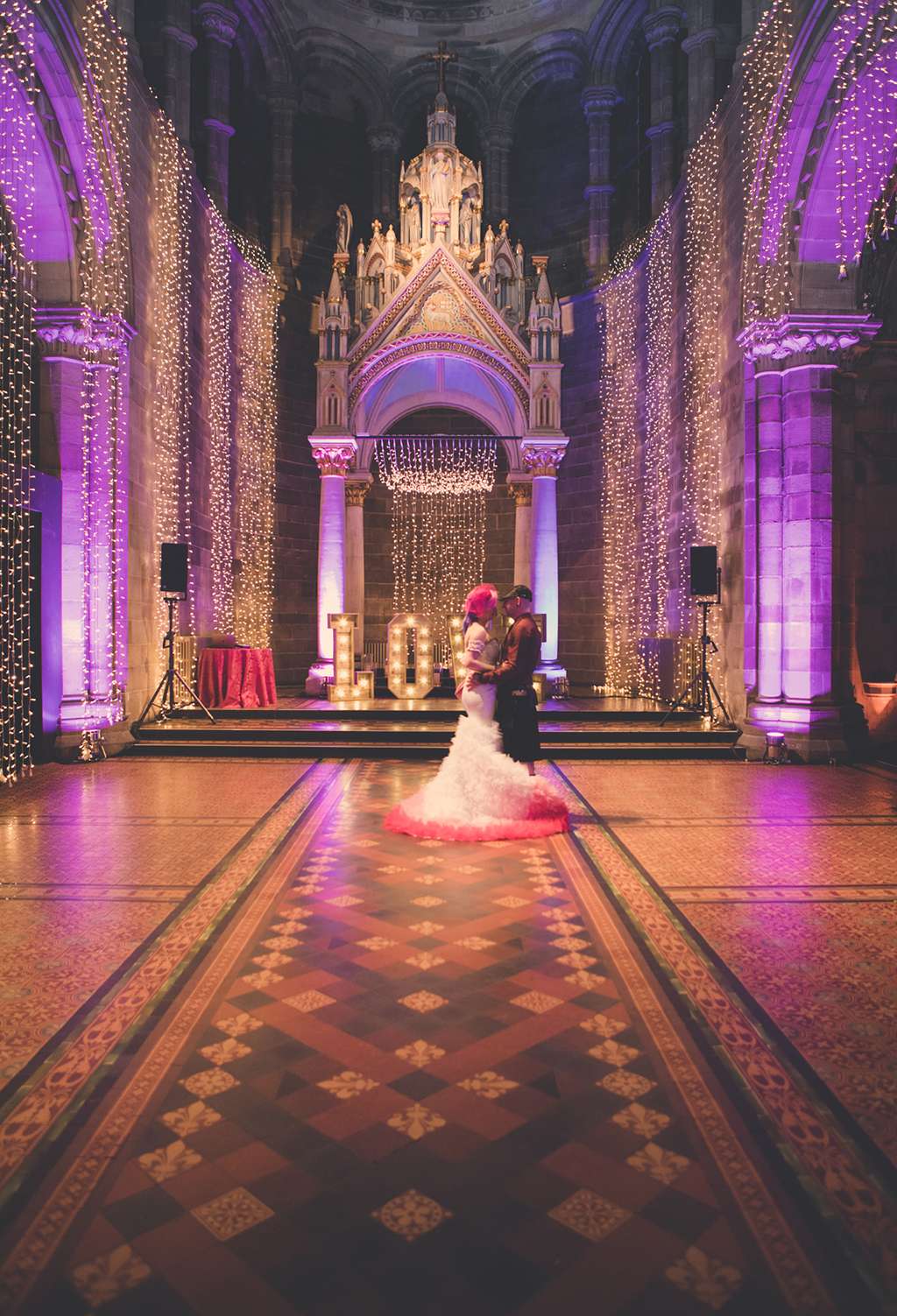 Kacii and Jay Jay married at Mansfield Traquair, Edinburgh. Known locally as ‘Edinburgh’s answer to the Sistine Chapel’, the exquisite, neo-Romanesque former church was an opulent setting for their March celebration. The couple made it their own, wanting a more casual, fun affair than is usually held there, so they eschewed the traditional expectations and did things the way they wanted!