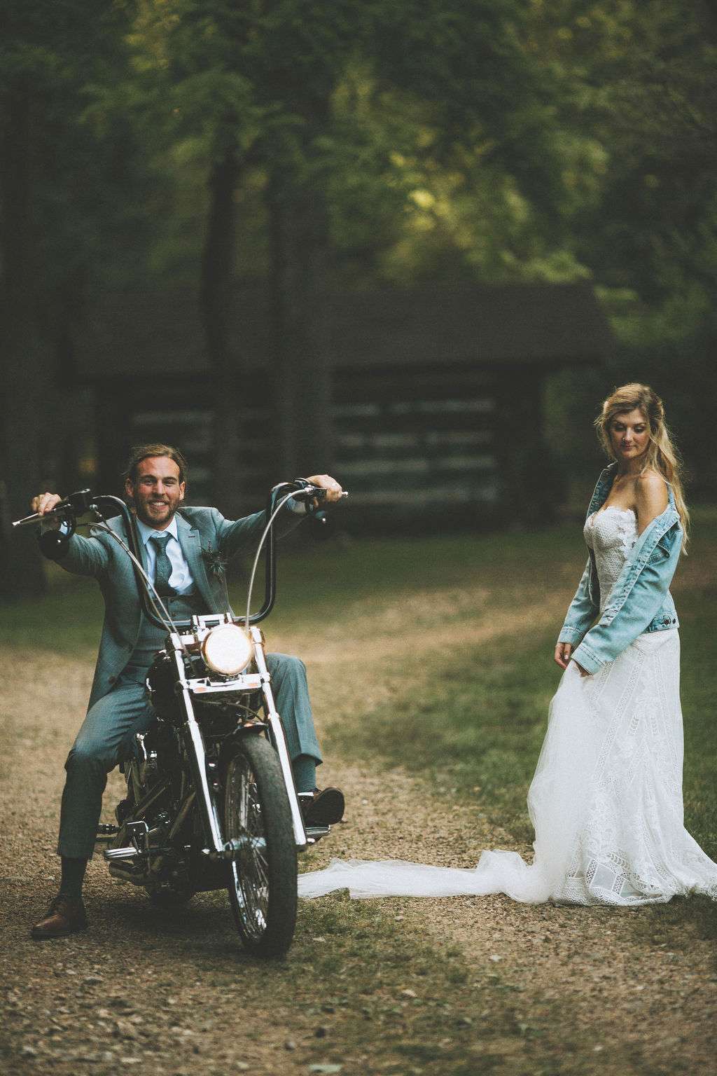 “I’ve never been a girly girl,” said Leslie, “I wanted to feel like a woodland fairy instead of a princess.” With a boho Rue de Seine dress and bare feet throughout the day, Leslie even entwined dried lavender, baby’s breath and other small wildflowers into her hair to become the ultimate woodland fairy bride. They added an edge by bringing in Dillon’s Harley Davidson in their photo session; “Going on rides together is something so special and to have our pictures on the bike was so badass. We felt truly Rock n Roll!”