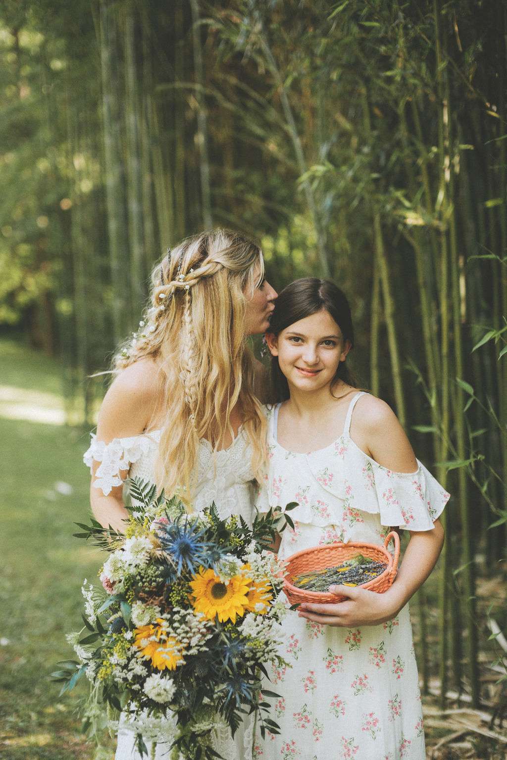 Everything decoration-wise could have been found in the woods. Hay-bales covered in burlap, a bohemian, natural wedding arbor designed by the maid of honour and cascading bouquets of thistle, wheat, wildflowers and ferns. Their cake, a gift by a childhood friend, was decorated with extra greenery and wildflowers. They lucked out with their reception decor; the barn they were loaned by family friends was already decorated, full of antiques and even an old airstream! They only had to bring in tables, chairs and a back drop – they didn’t need any other decoration.