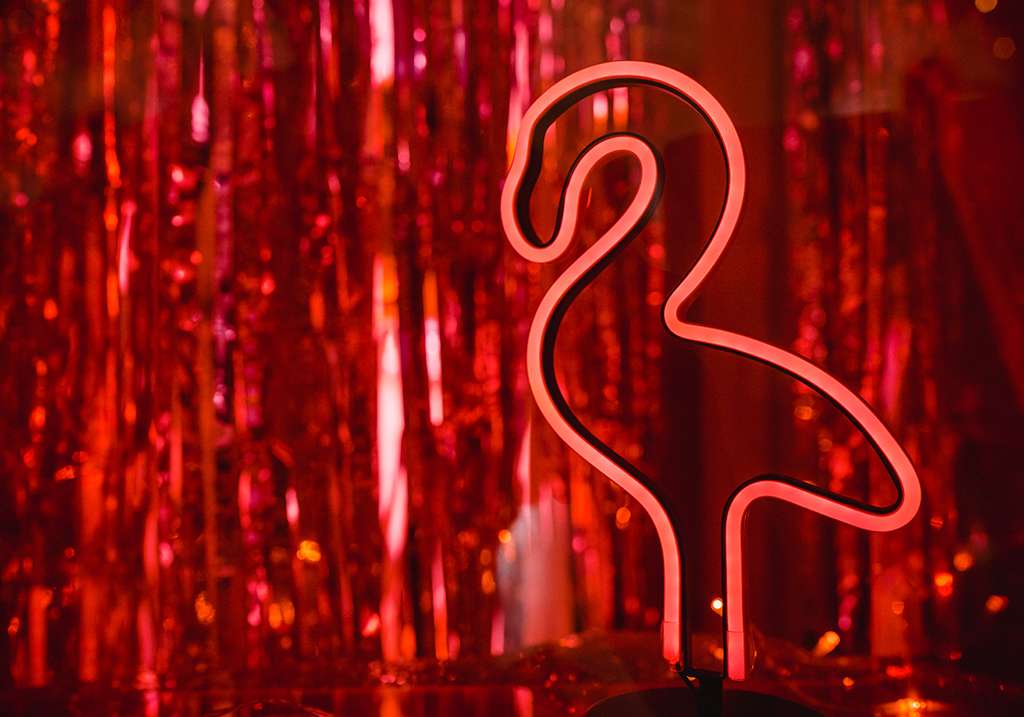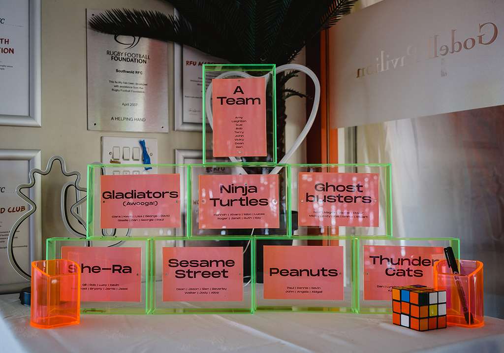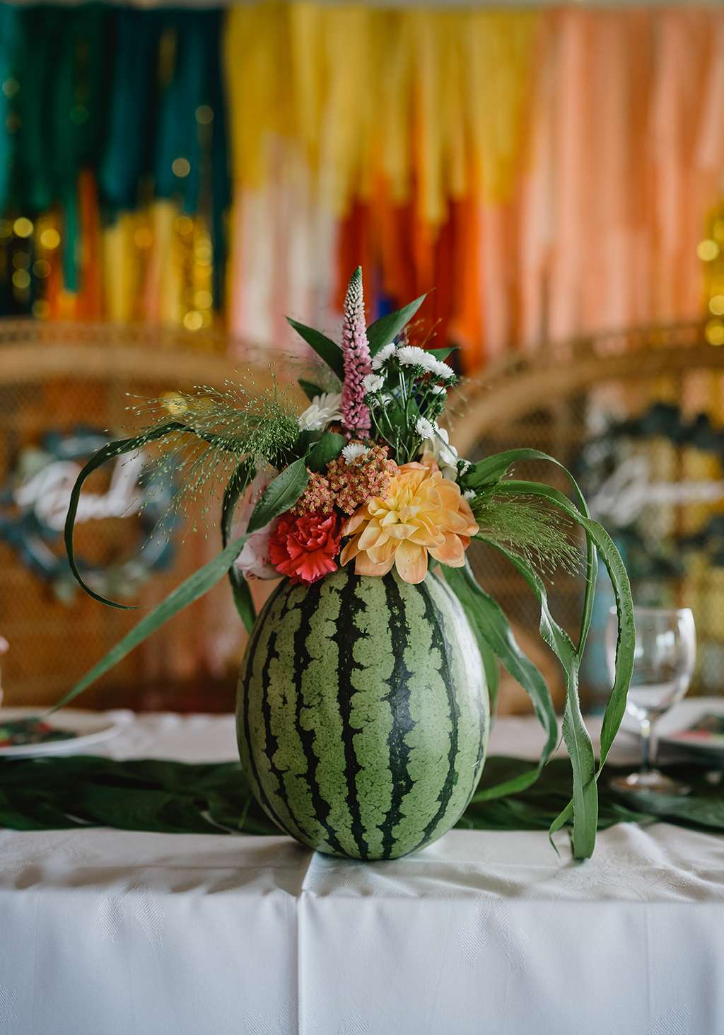 They continued the ‘80s theme with their decor; starting with ‘80s ‘thrones’ (aka peacock chairs) as well as tinsel walls, crepe paper backdrops and flower vases made of real pineapples. Each table had a vintage ‘80s toys on a wire which signposted where everyone should sit and they drank from Club Tropicana cocktail glasses. Amy wore trousers, had a custom painted leather jacket and wire flashing platform trainers with neon lights in the soles for the evening. Their entertainment was provided by an acoustic 80s cover band.