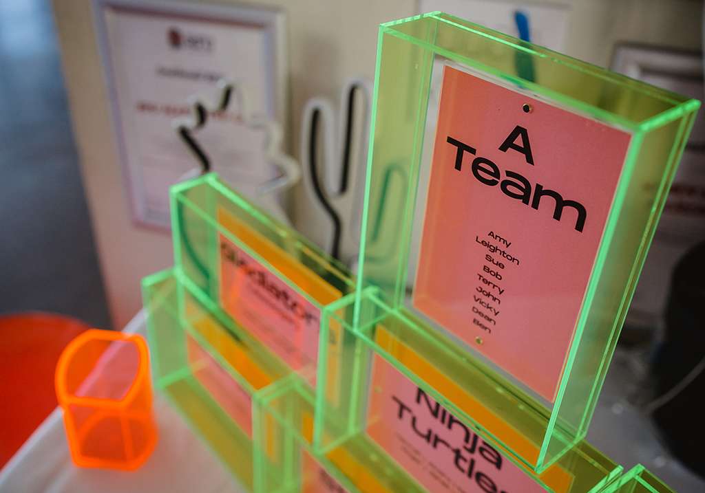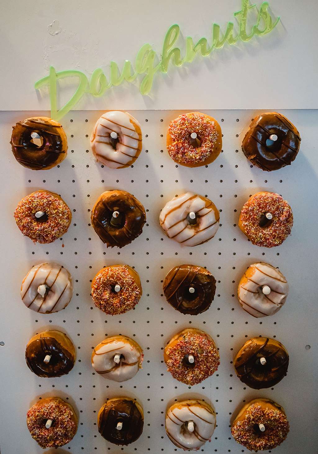 With a £12,000 budget the couple embarked on a lot of DIY to make their day come to life – as Amy is a designer, she obsesses over the tiny details, so they all had to be just-so! They made a doughnut stand from leg board, wooden dowels and cut acrylic. They used sheets of florescent glow edge acrylic from eBay and designed bespoke keyrings for each guest that doubled up as place settings and favours.