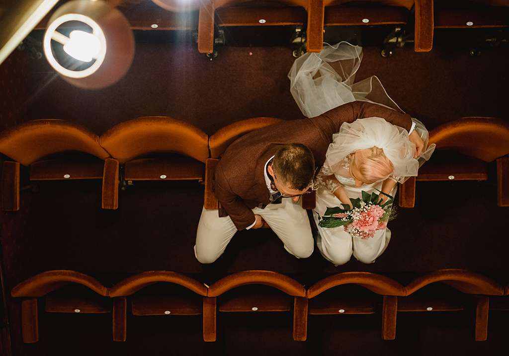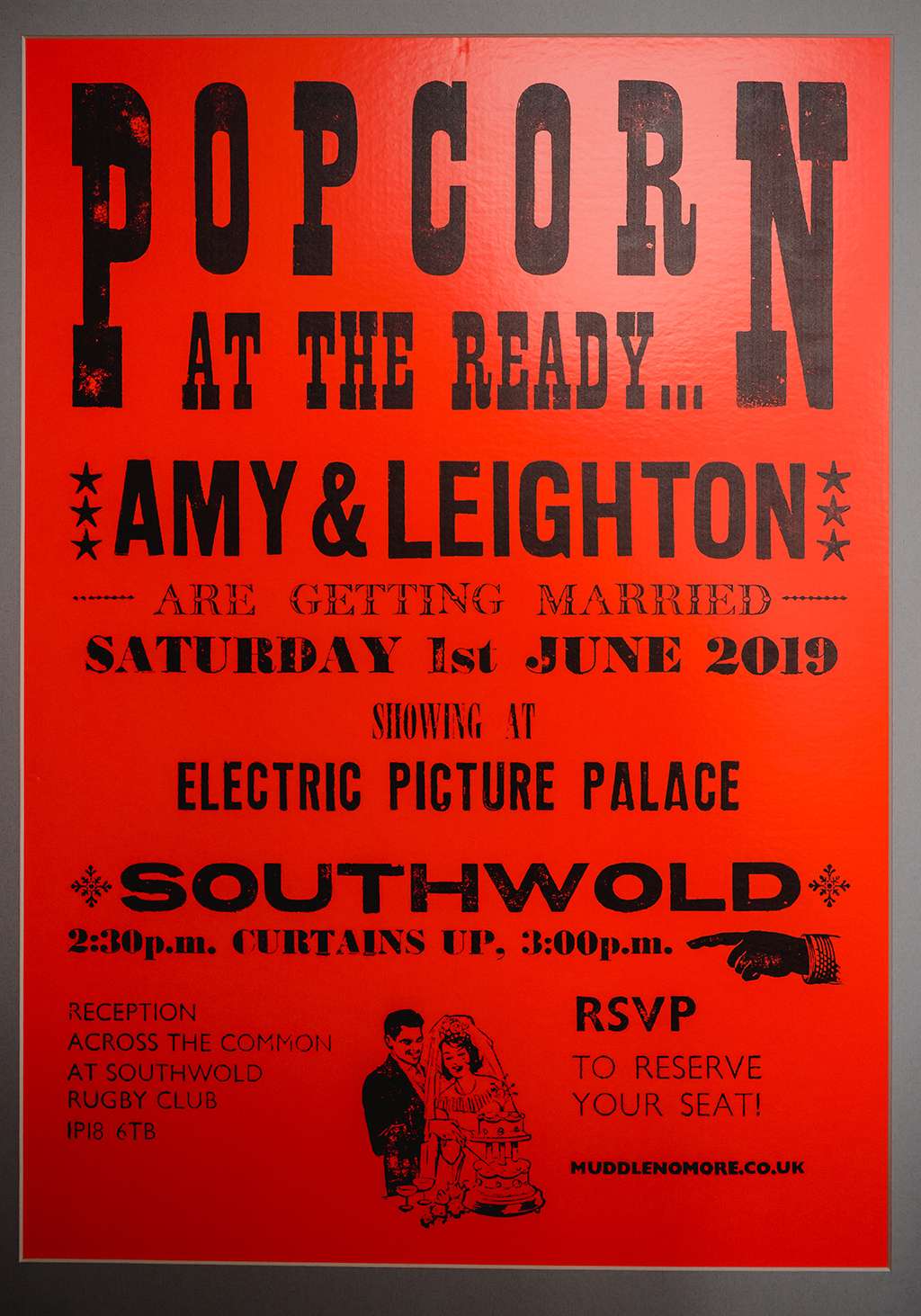 Amy designed posters for outside of the cinema which had a funny photograph of her and Leighton which was photoshopped from the original and iconic image of Kyle and Jason’s wedding from Neighbours in 1987. She also made their invitations, typesetting them by hand which took over a month – but saved them a bunch!