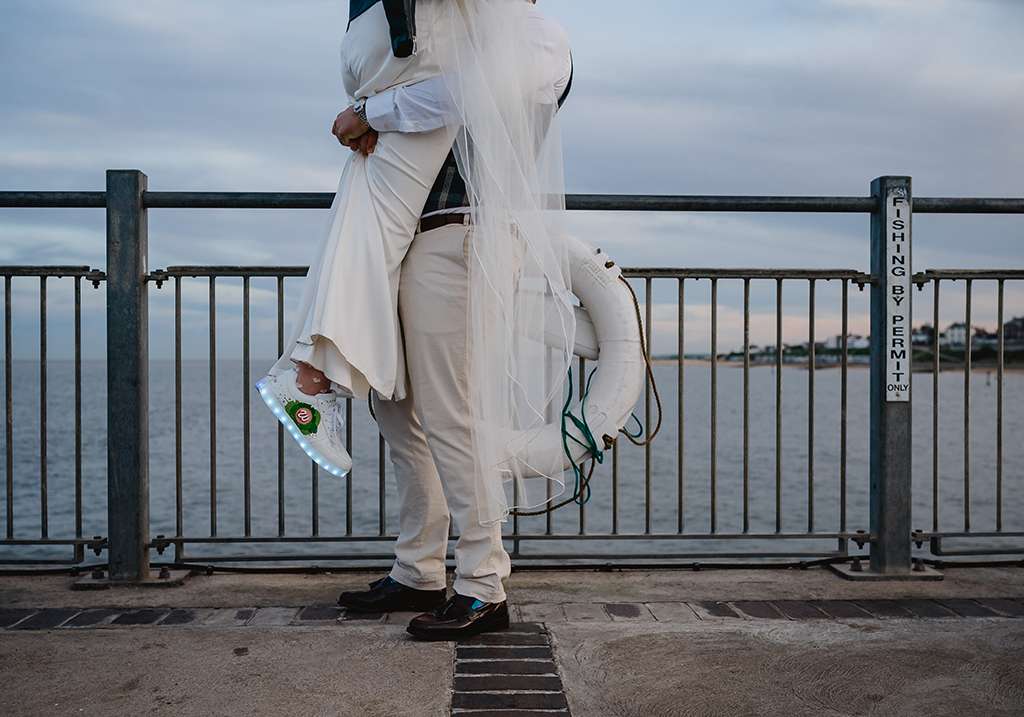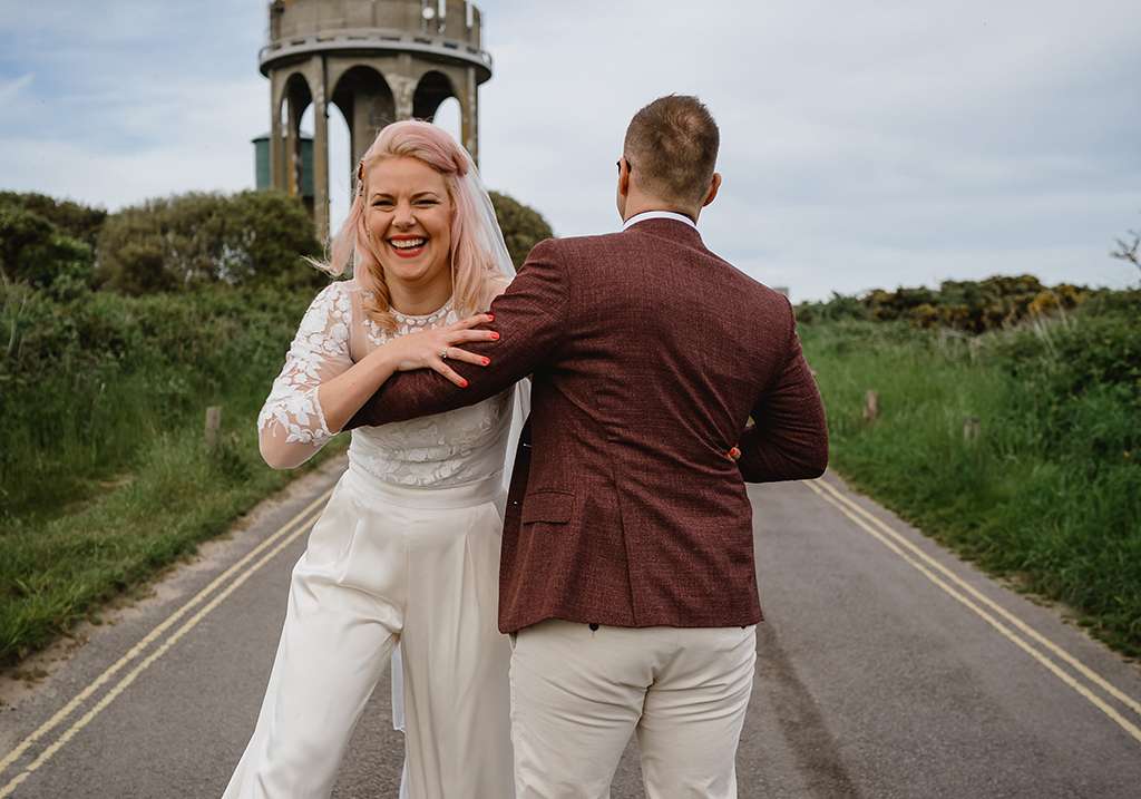Held in Southwold in June 2019, the bridal party began their wedding day with a dip in the Suffolk sea – a far cry from the normal champagne breakfast affair! The day continued with more quirks; their ceremony was on stage in a cinema, they hired a bouncy castle and sumo suits for a post-wedding duel and they lost traditional, fancy wedding transport in favour of walking through the town from the ceremony to reception venue, causing quite the stir with the locals as they went!
