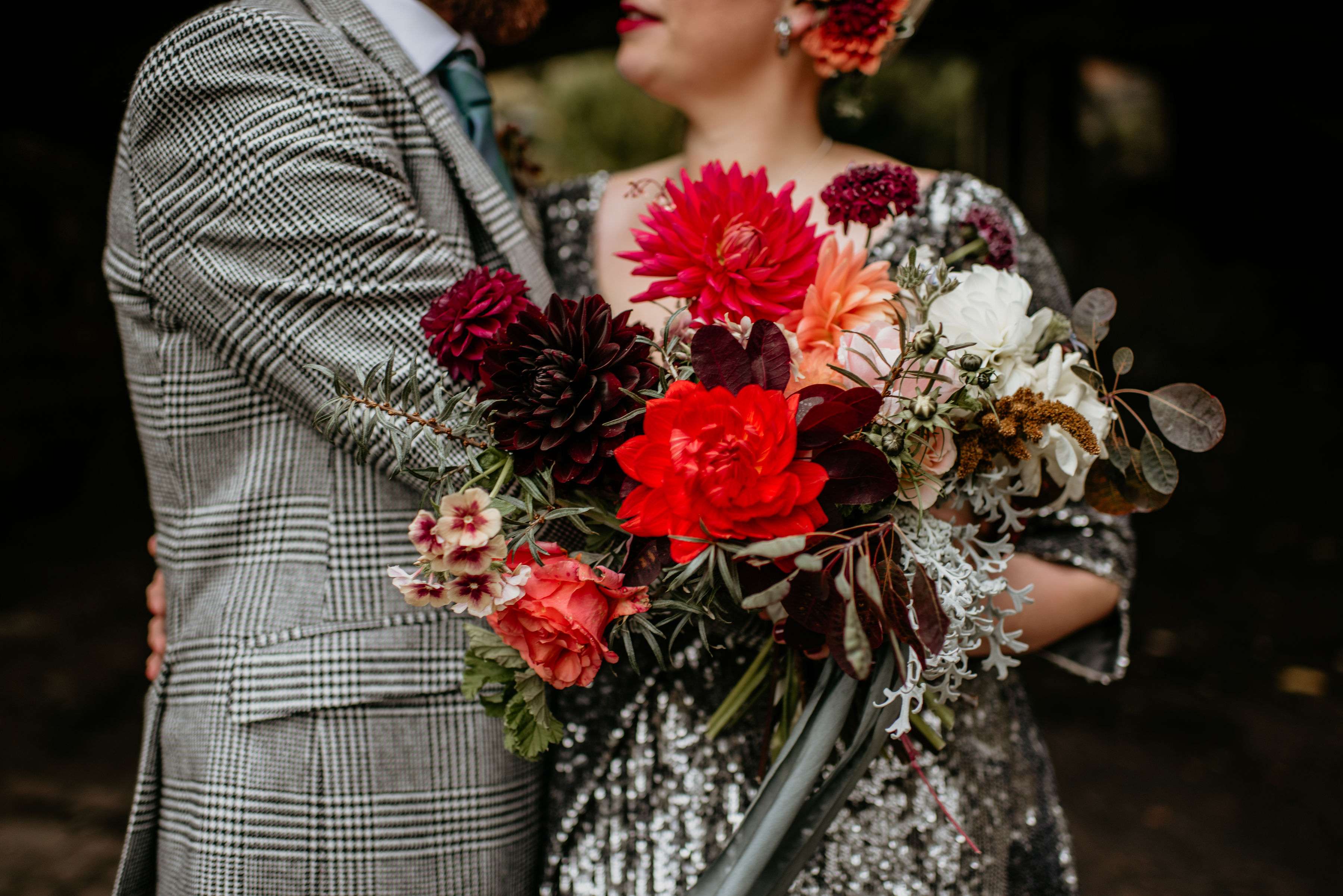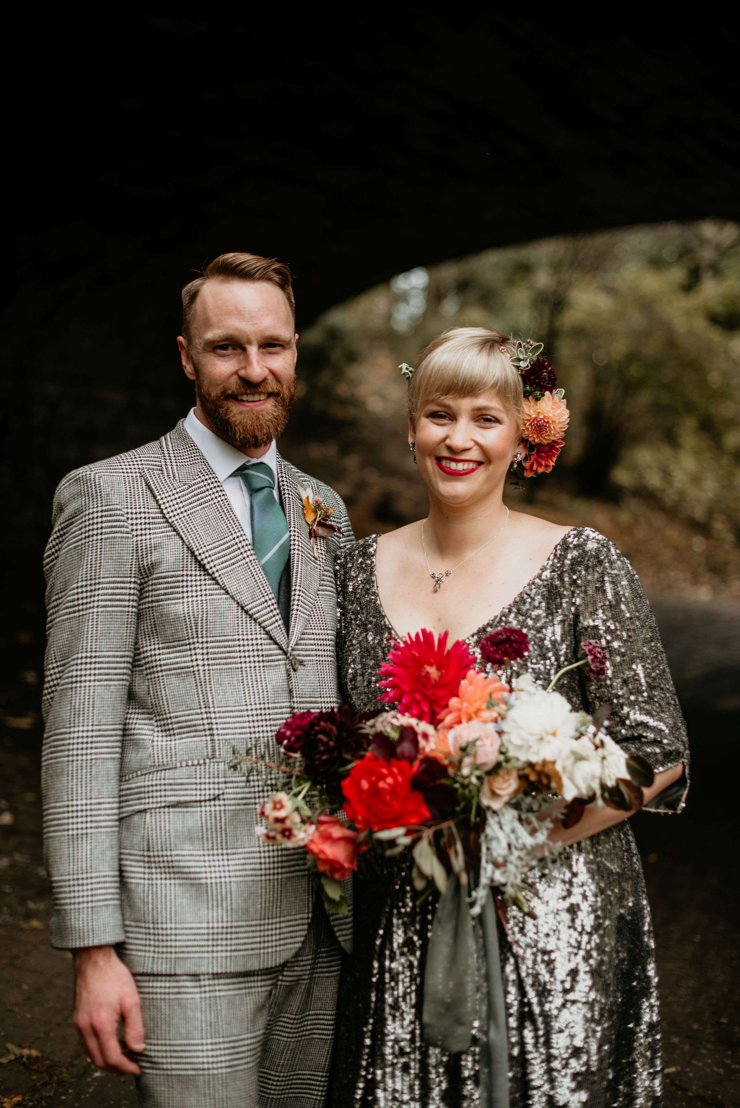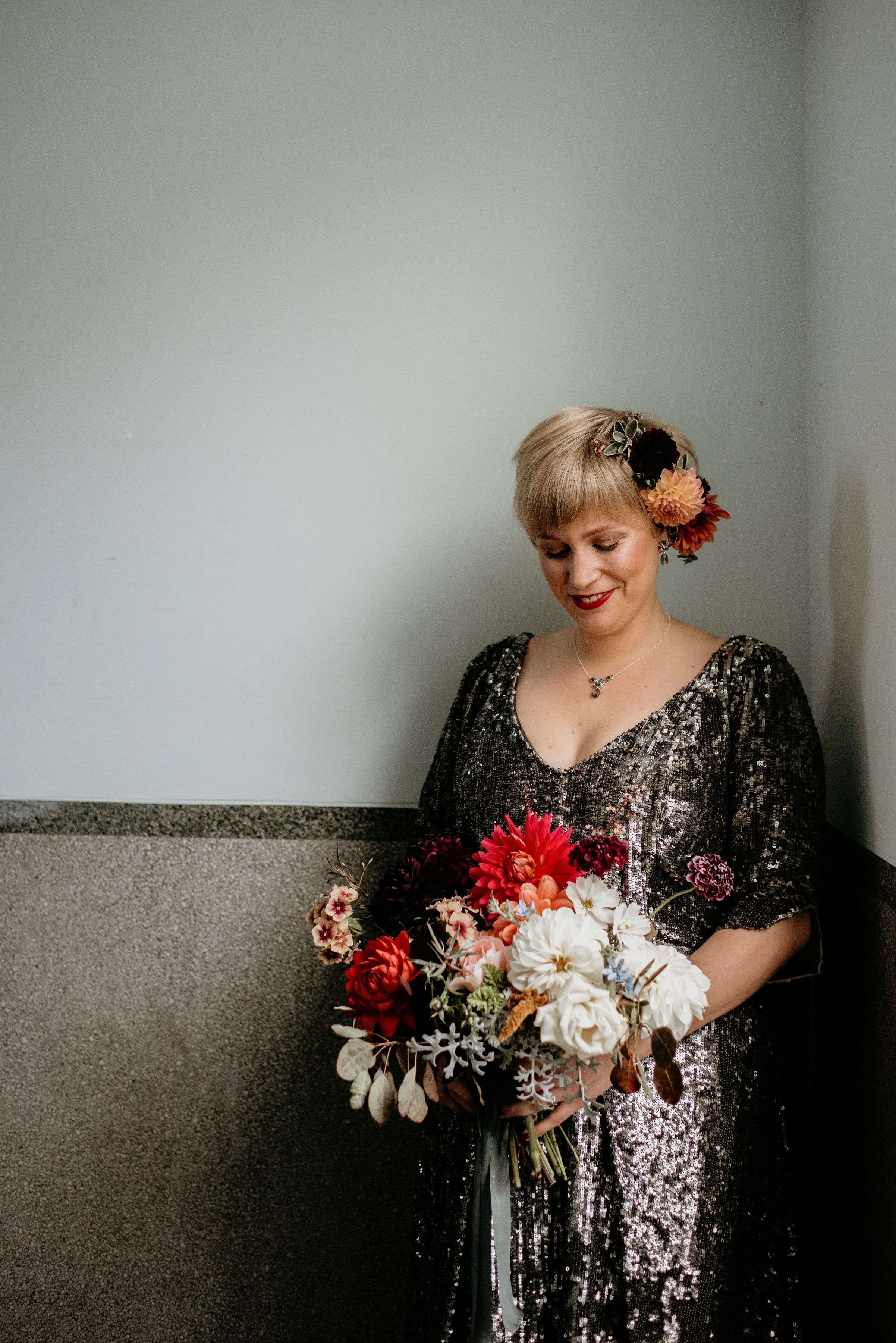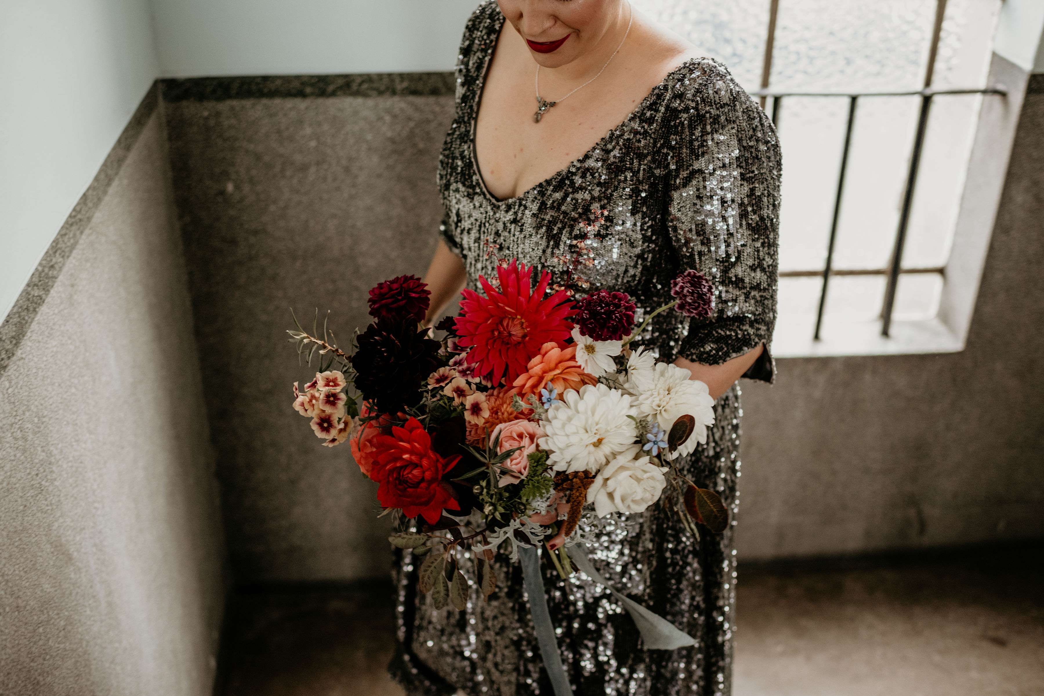 The bride wore a one-of-a-kind black and silver sequin dress. She dreamt up the main idea and sourced the fabric and then worked with Rowan Joy to make it a reality. “My dress was pretty unique”, she said. “Dreamt up between myself and my dressmaker, it was a sequin dream and everything that I had wanted in a wedding dress. Plus it’s a dress for life, I have worn it to two other occasions since the wedding. This was really important to me, I have a background in textile design and I always knew I would wear a wedding dress that could be worn repeatedly.”