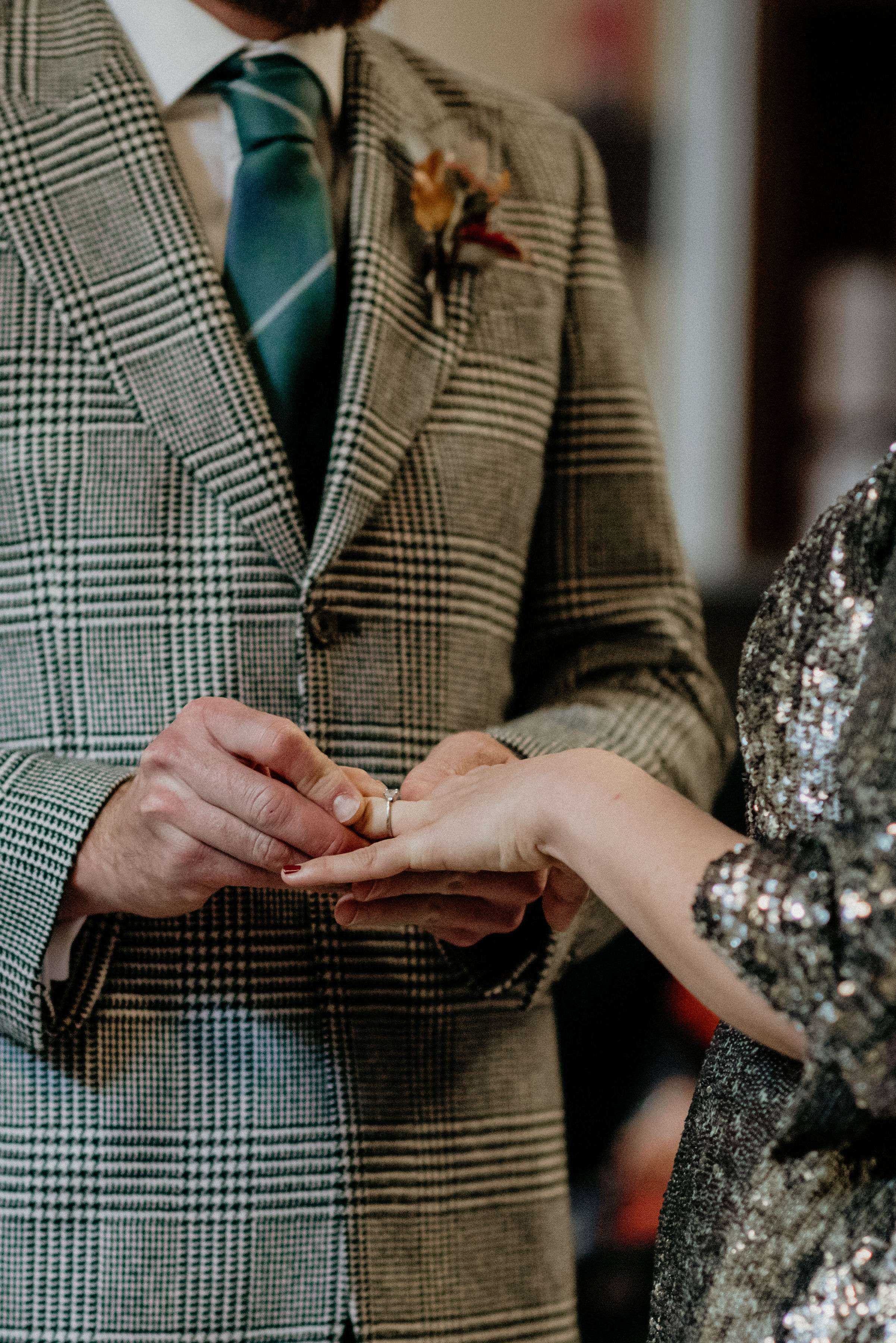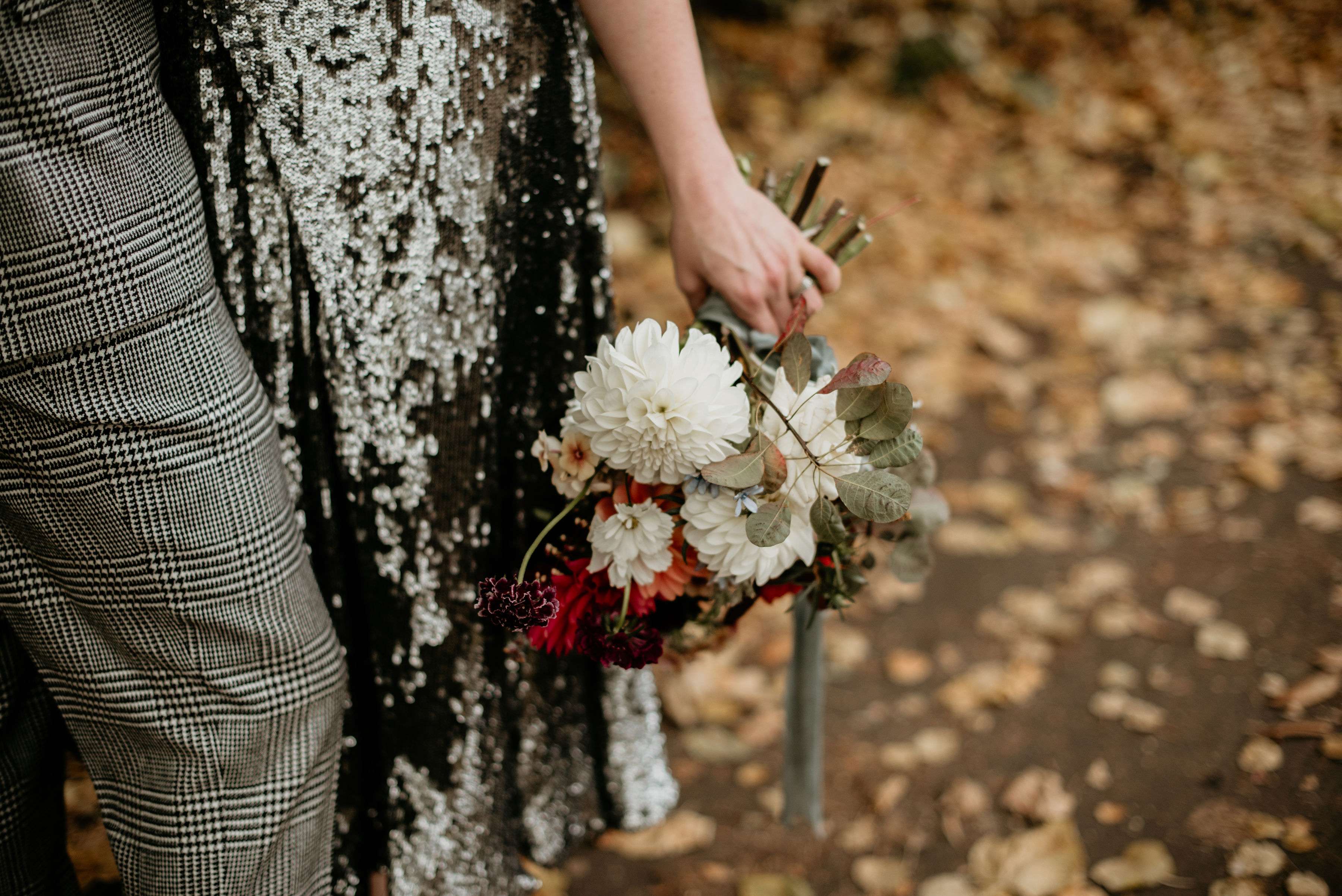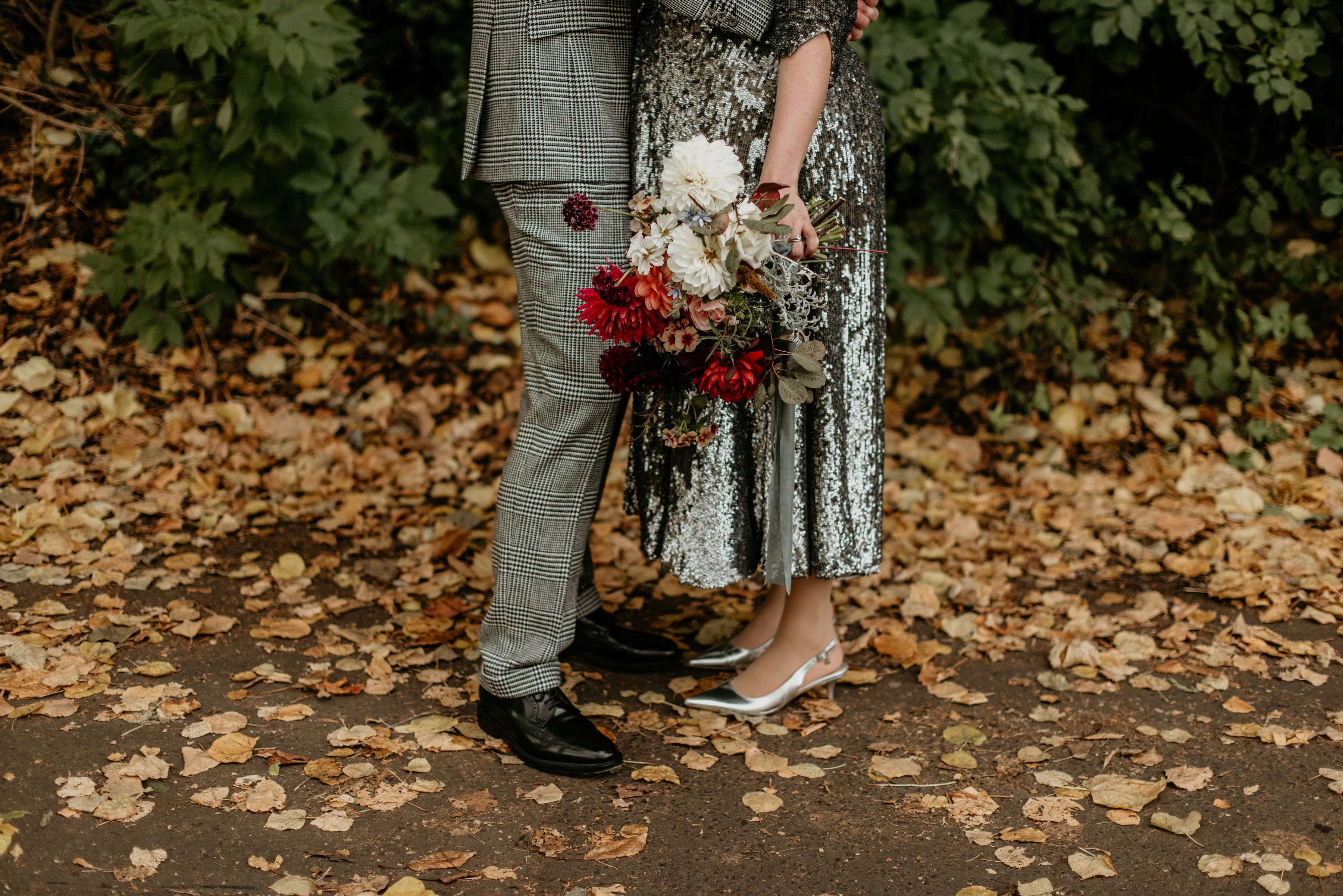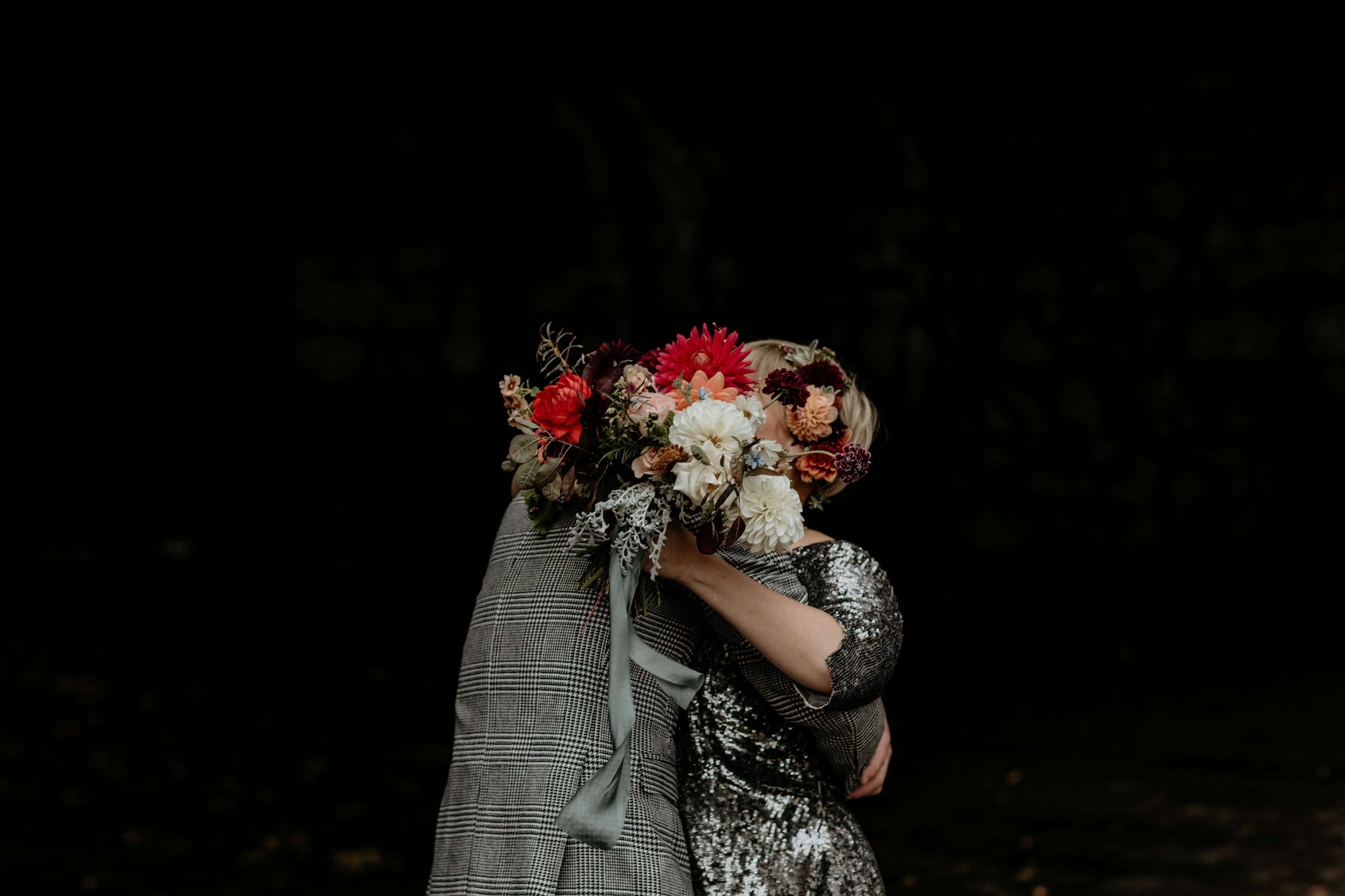 The bride wore a one-of-a-kind black and silver sequin dress. She dreamt up the main idea and sourced the fabric and then worked with Rowan Joy to make it a reality. “My dress was pretty unique”, she said. “Dreamt up between myself and my dressmaker, it was a sequin dream and everything that I had wanted in a wedding dress. Plus it’s a dress for life, I have worn it to two other occasions since the wedding. This was really important to me, I have a background in textile design and I always knew I would wear a wedding dress that could be worn repeatedly.”