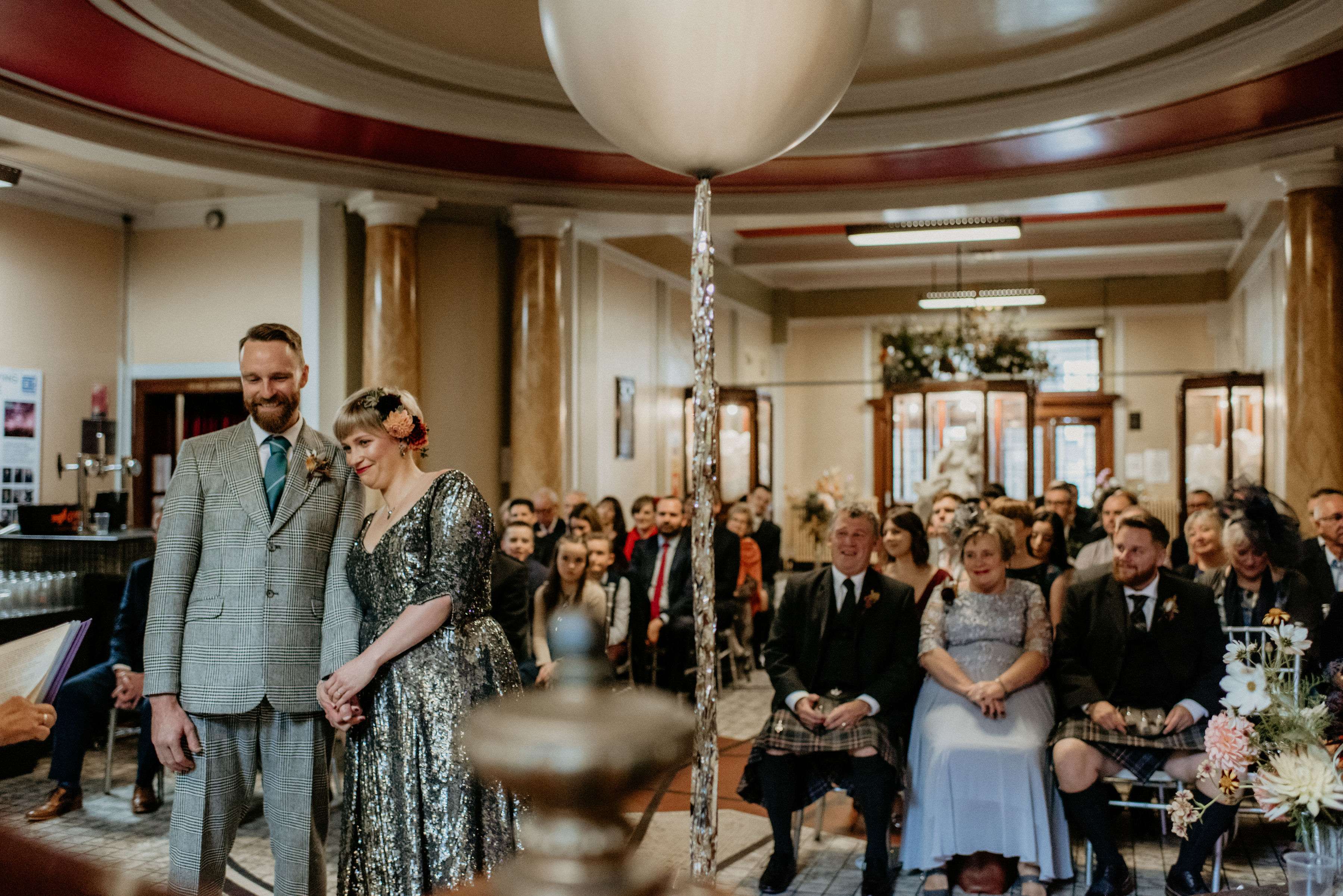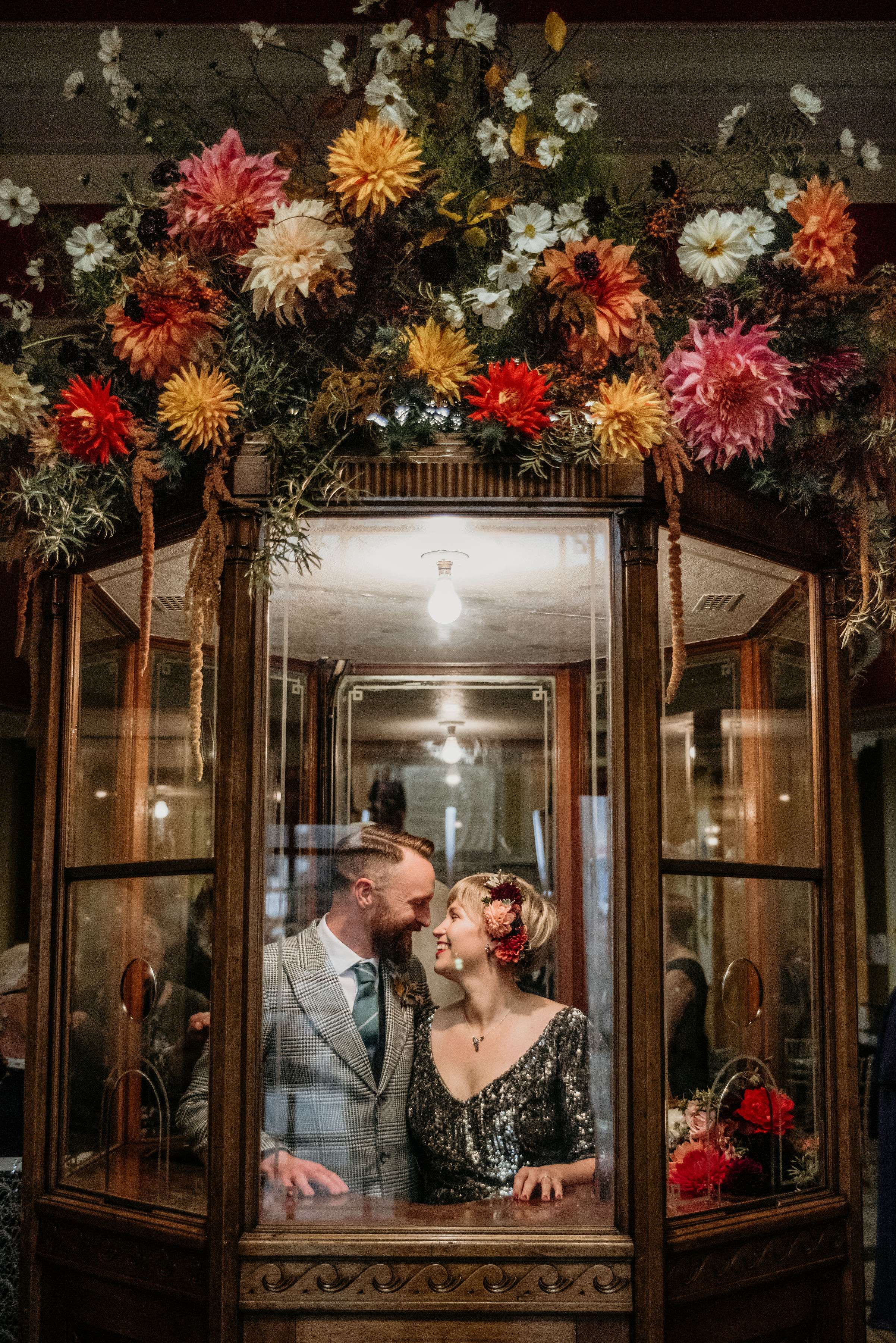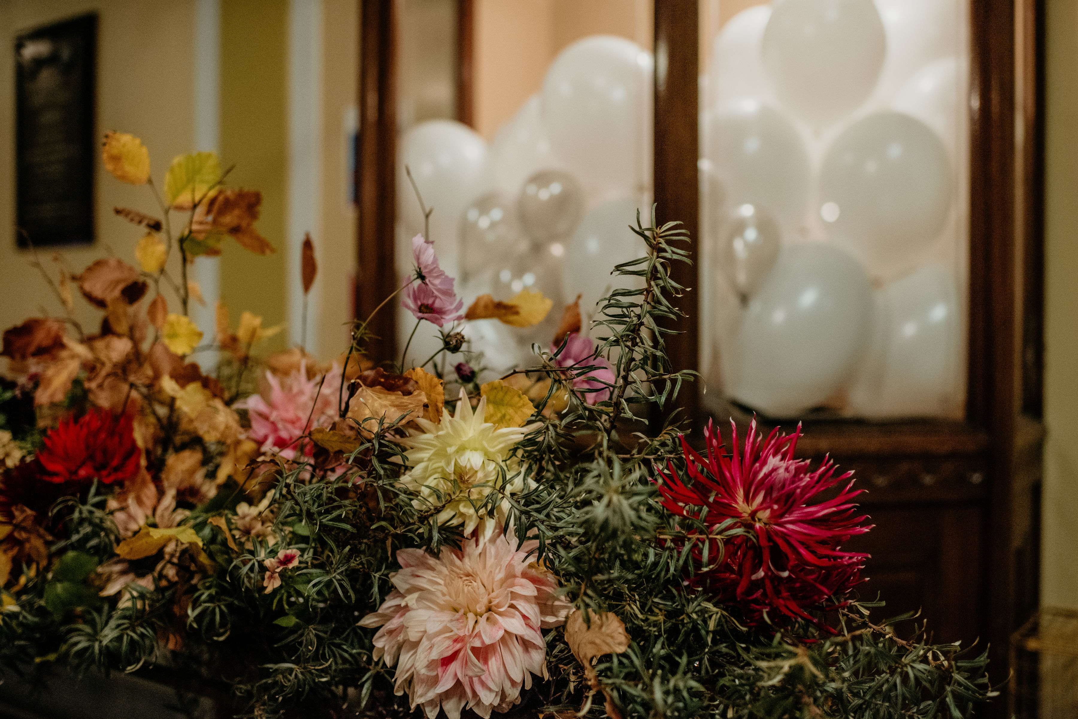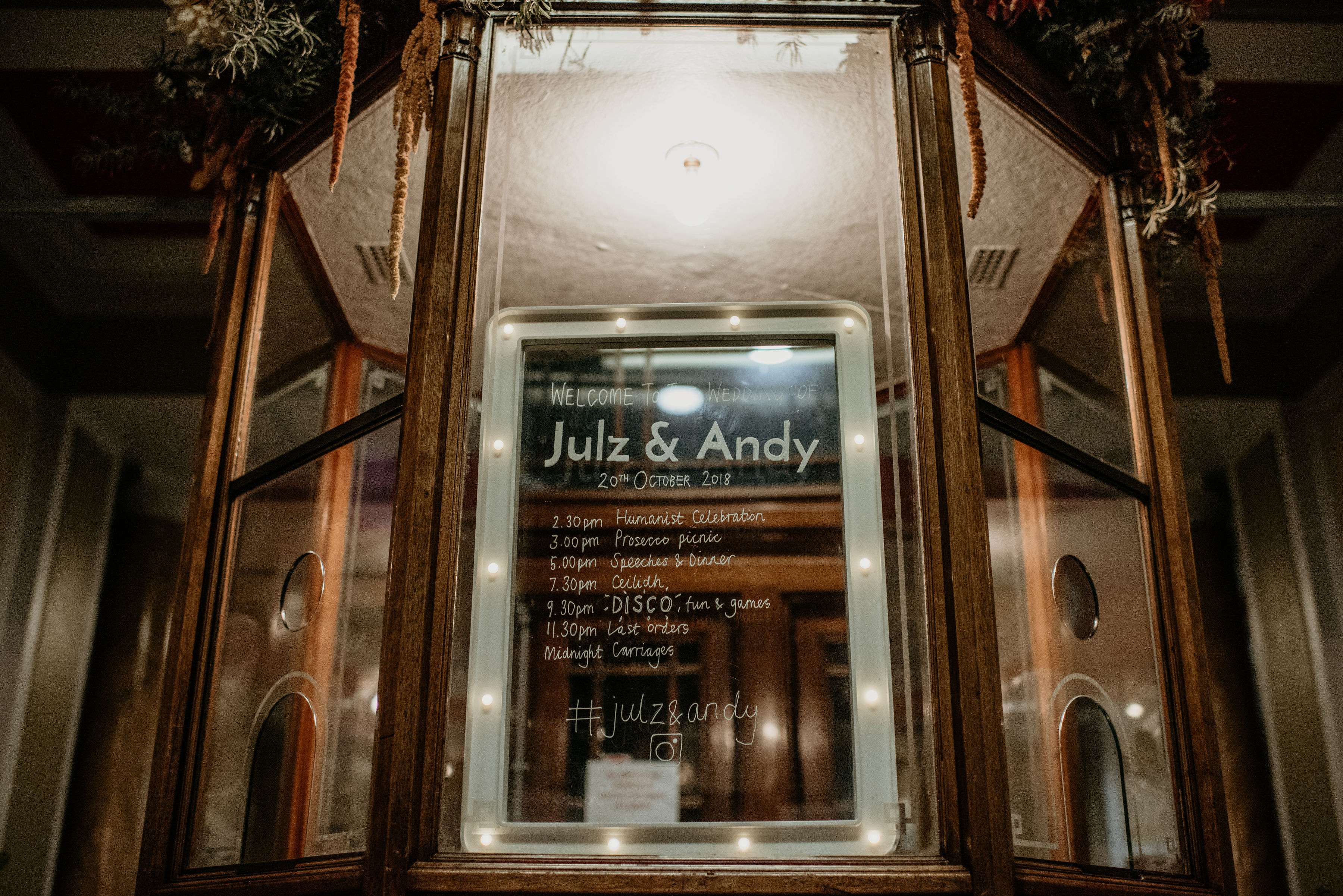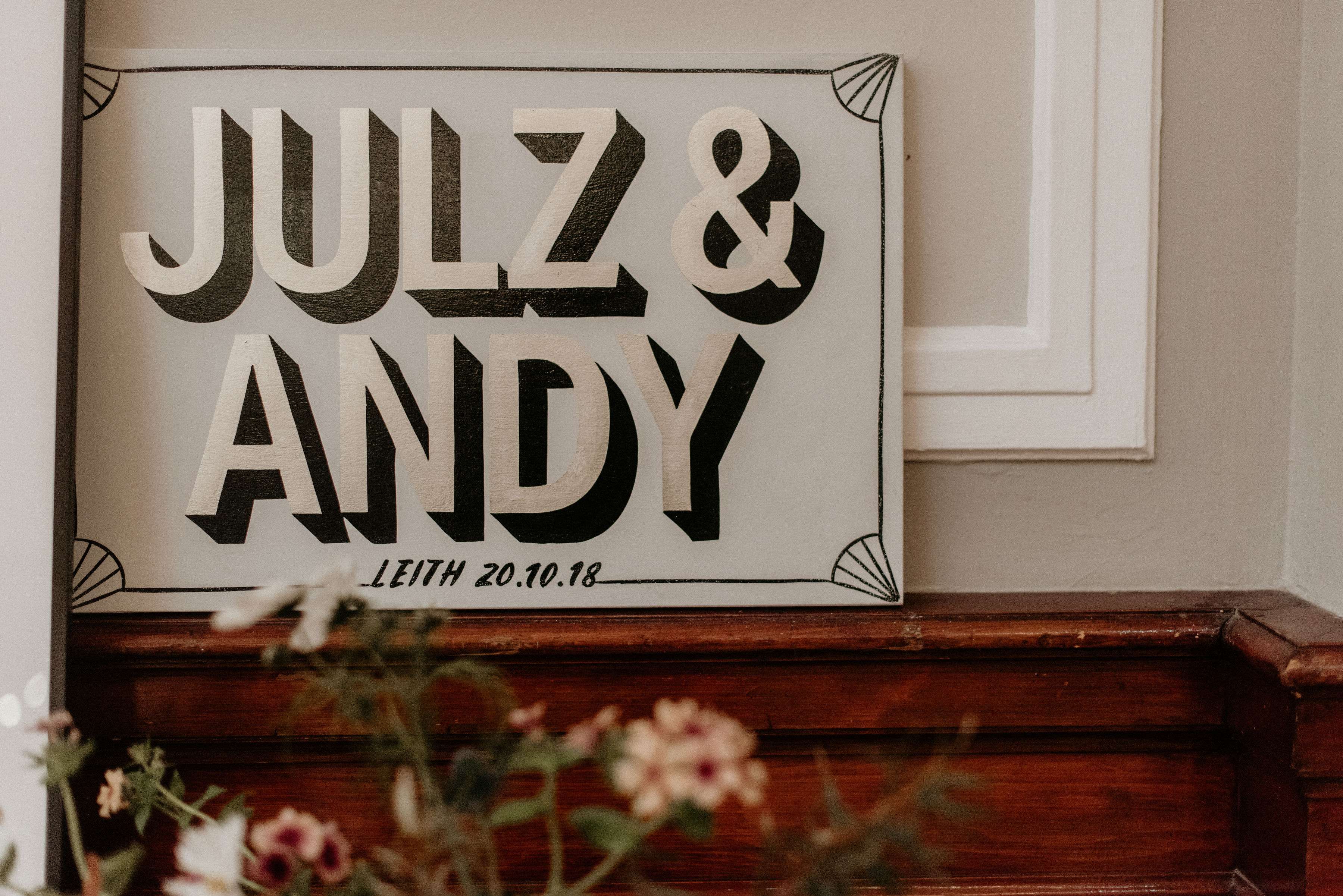 They were married in October at Leith Theatre in Edinburgh, an old art deco theatre. Although it was undergoing a massive renovation and development, it was very easy to dress because it was already is stunning. “I come from a creative background so found it really easy to dream up a ‘vision’ of how I wanted the place to look”, explained Julz. “I wanted flowers, food, disco and autumn rolled into one.”