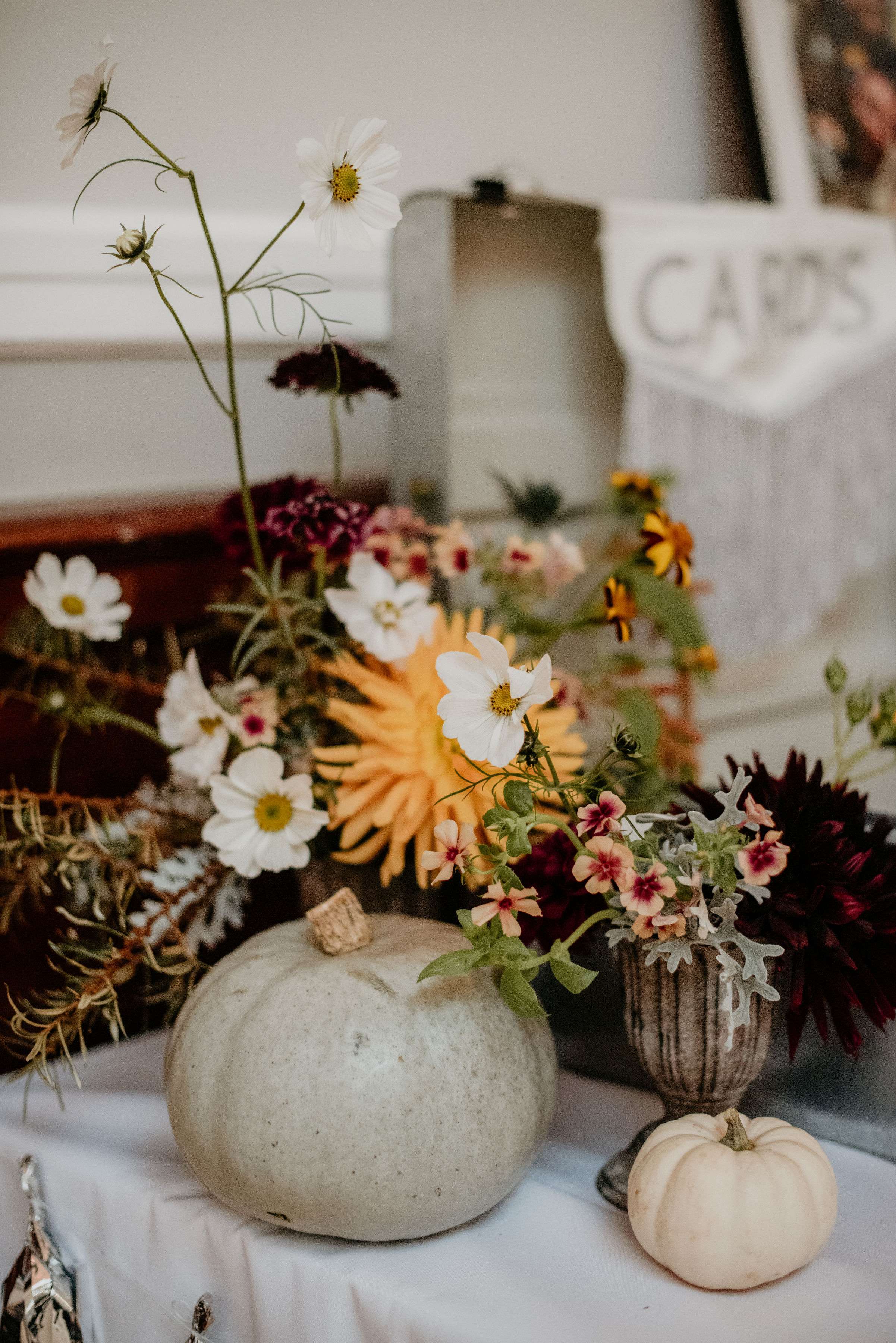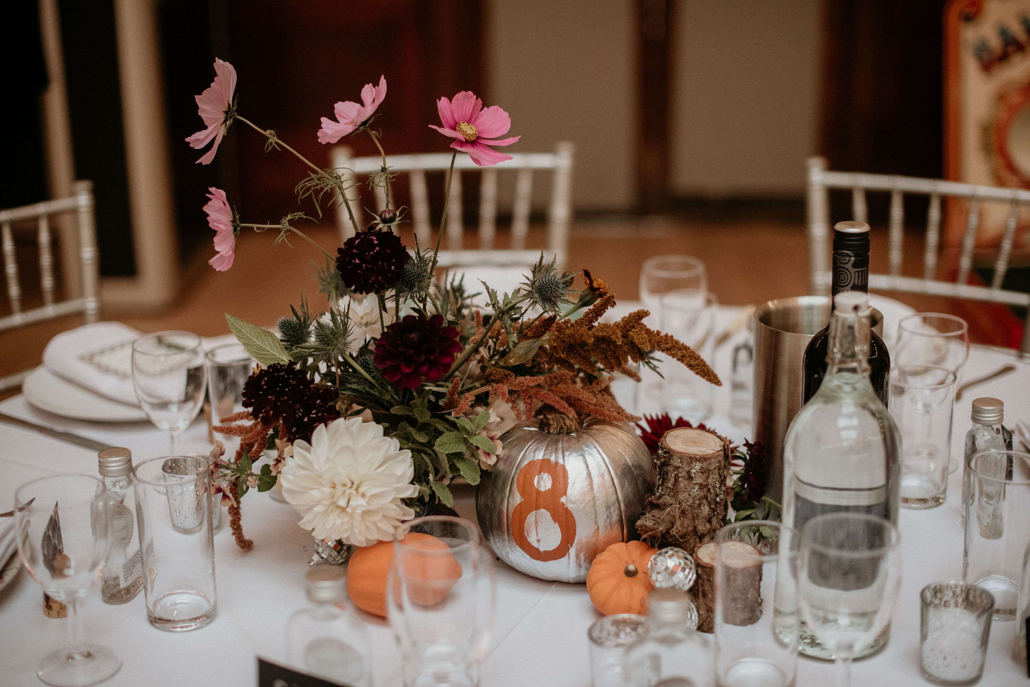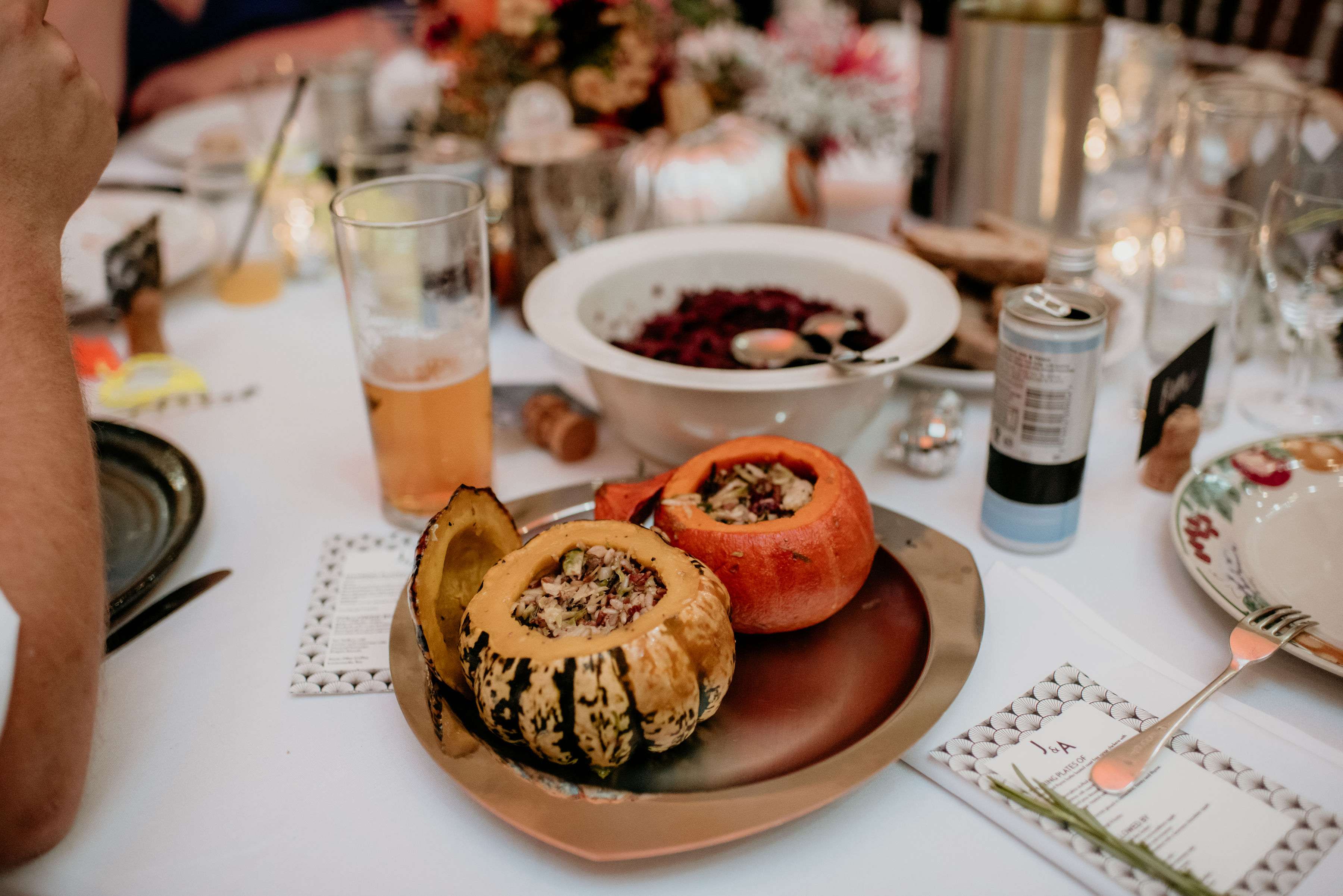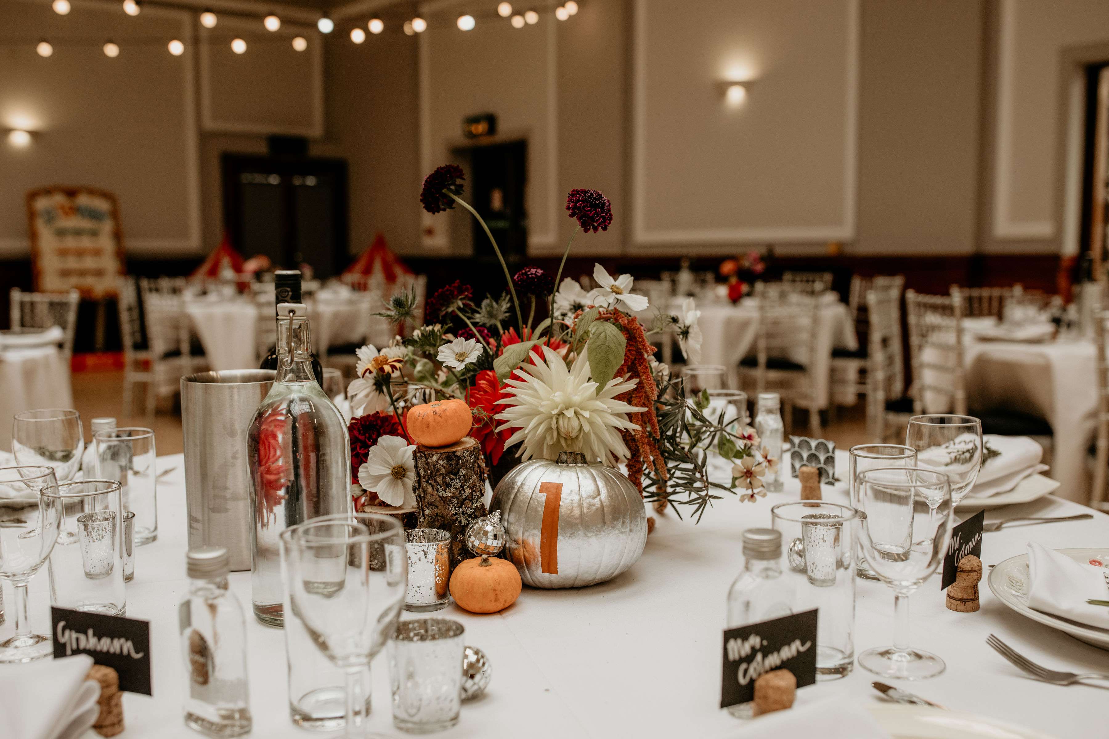 After their short but sweet ceremony the couple had a mini-picnic together in their own 1960s caravan that they parked outside the venue. “It was a really lovely moment. We got to laugh, chat and eat food as husband and wife! ( I also got to take off the tights I had been wearing, they were so uncomfortable!)” They then headed over to their reception which was decorated by their florist and themselves with silver spray-painted pumpkins, pineapples and pears.