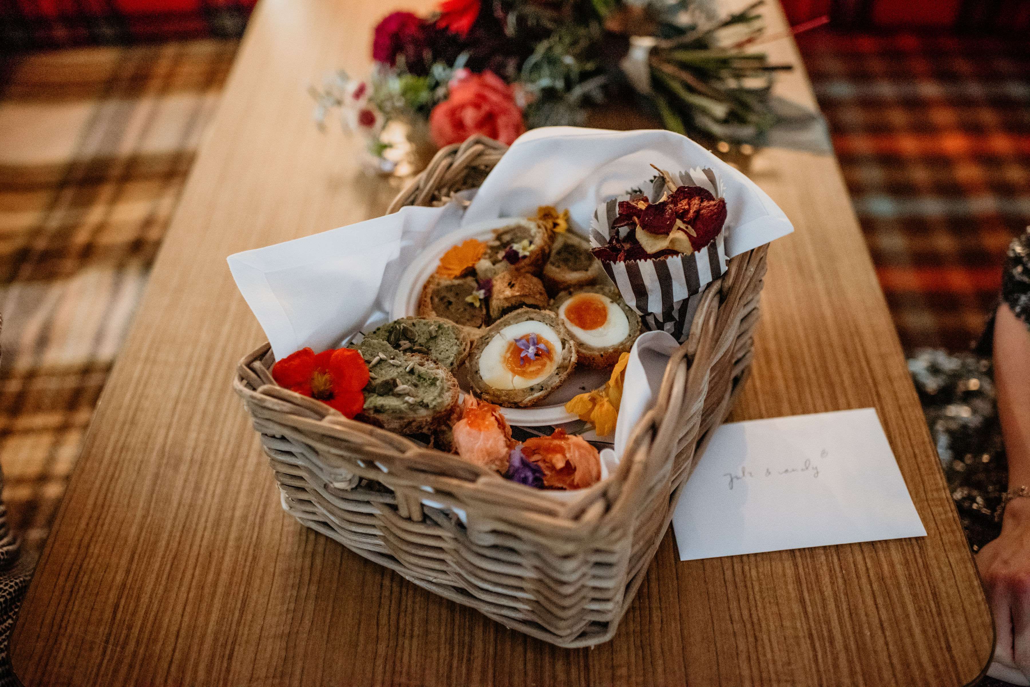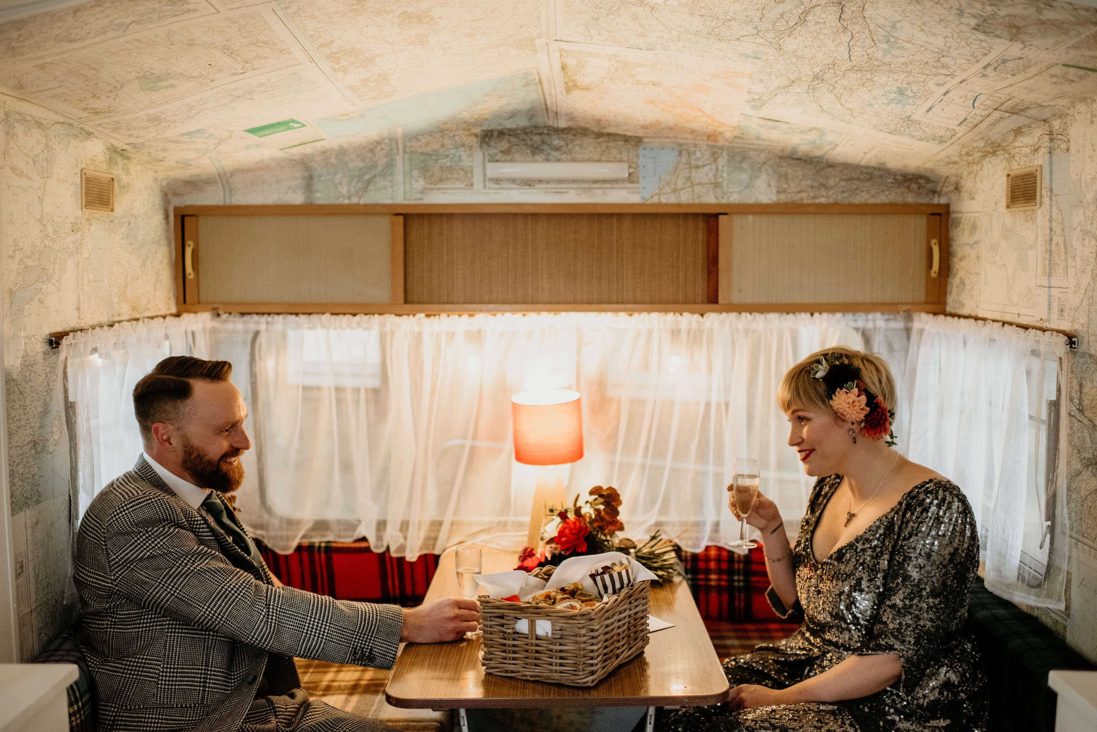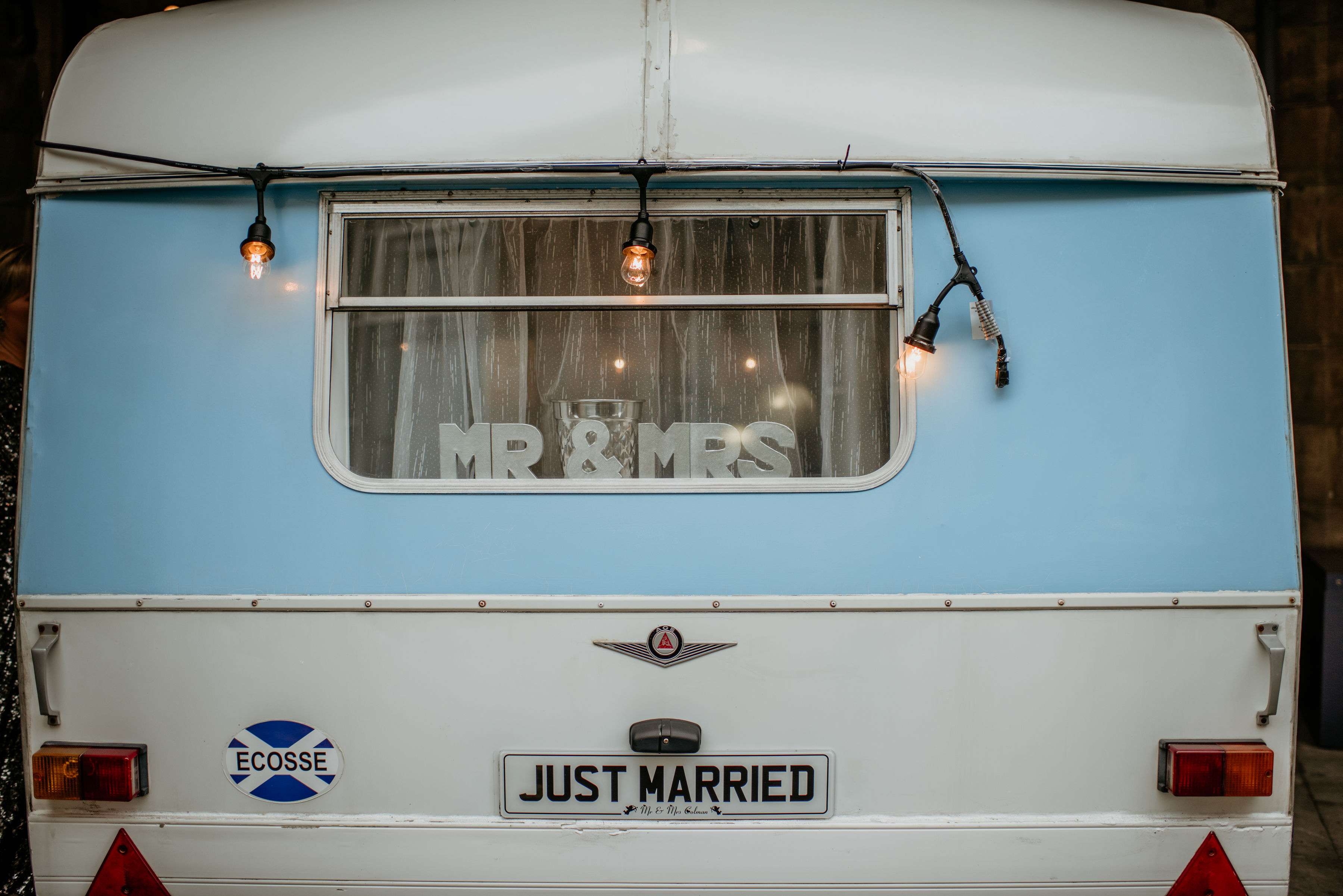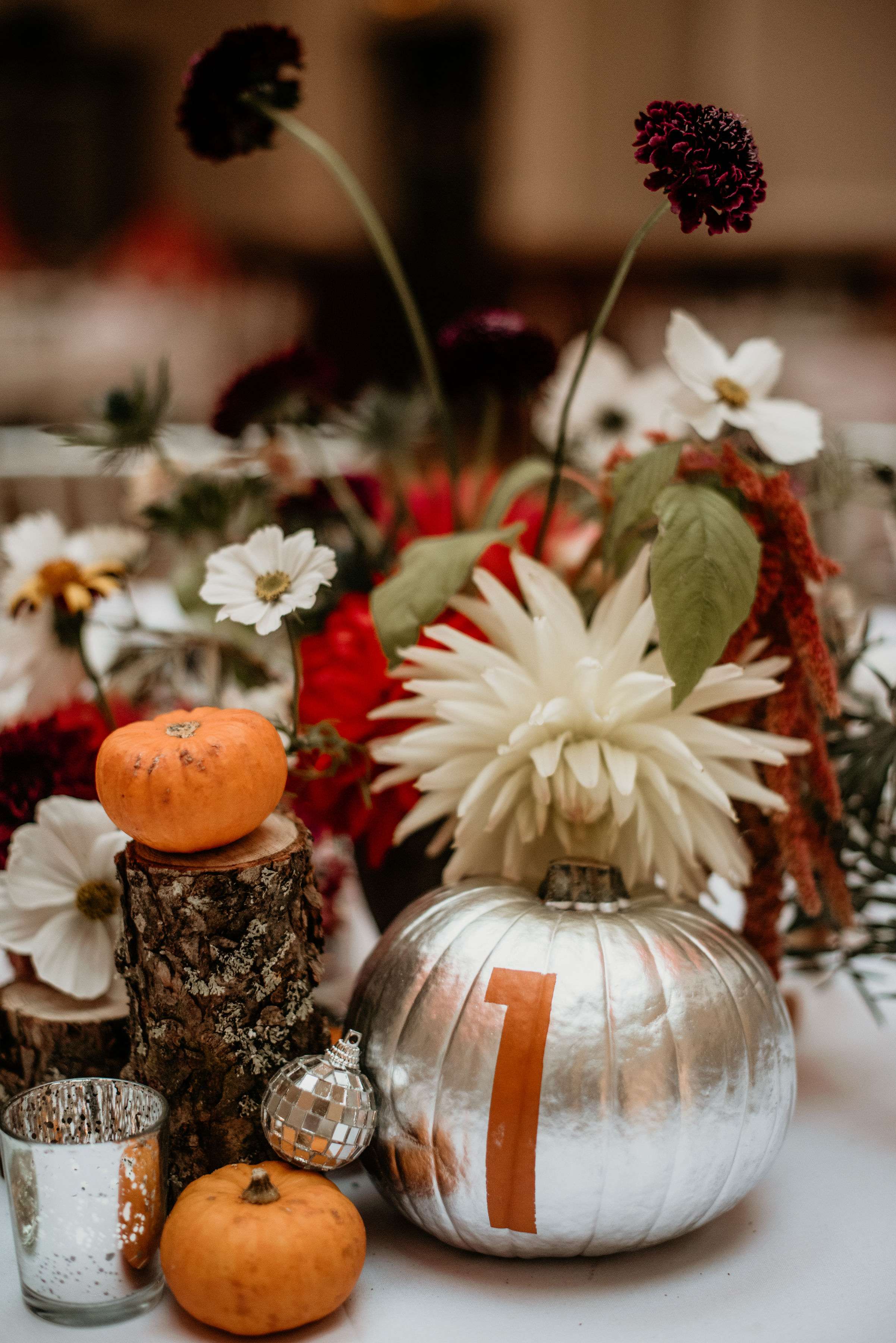 After their short but sweet ceremony the couple had a mini-picnic together in their own 1960s caravan that they parked outside the venue. “It was a really lovely moment. We got to laugh, chat and eat food as husband and wife! ( I also got to take off the tights I had been wearing, they were so uncomfortable!)” They then headed over to their reception which was decorated by their florist and themselves with silver spray-painted pumpkins, pineapples and pears.