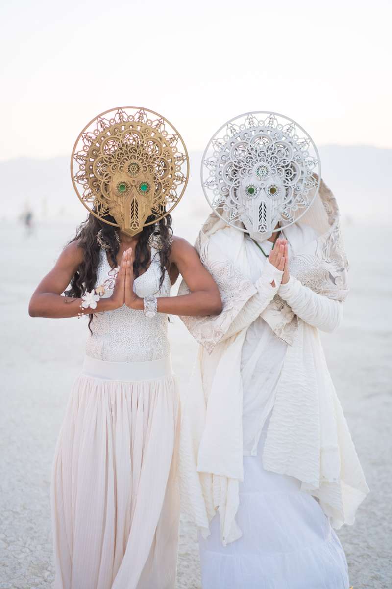 Their friend, Xuan-Ann, got registered as an officiant in the state of Nevada so she could marry them. “Getting married at Burning Man was definitely out of the ordinary”, Yoshi began. “Unlike most brides, I didn’t plan much except our wedding outfits, the gifts, the date and the ceremony location. I left everything else up to synchronicity. Everything ended up coming together magically, thanks to the help of our friends who wanted to make our special day as stress-free as possible. One of the principles of Burning Man is gifting so instead of receiving wedding presents, we offered gifts to our guests. Our friends were given symbols of our love: custom face chains with our initials designed by our friend Ipek Design, and paper fans that featured one of Gilles’ Burning Man photos with our motto ‘Make Your Life An Art Piece.”