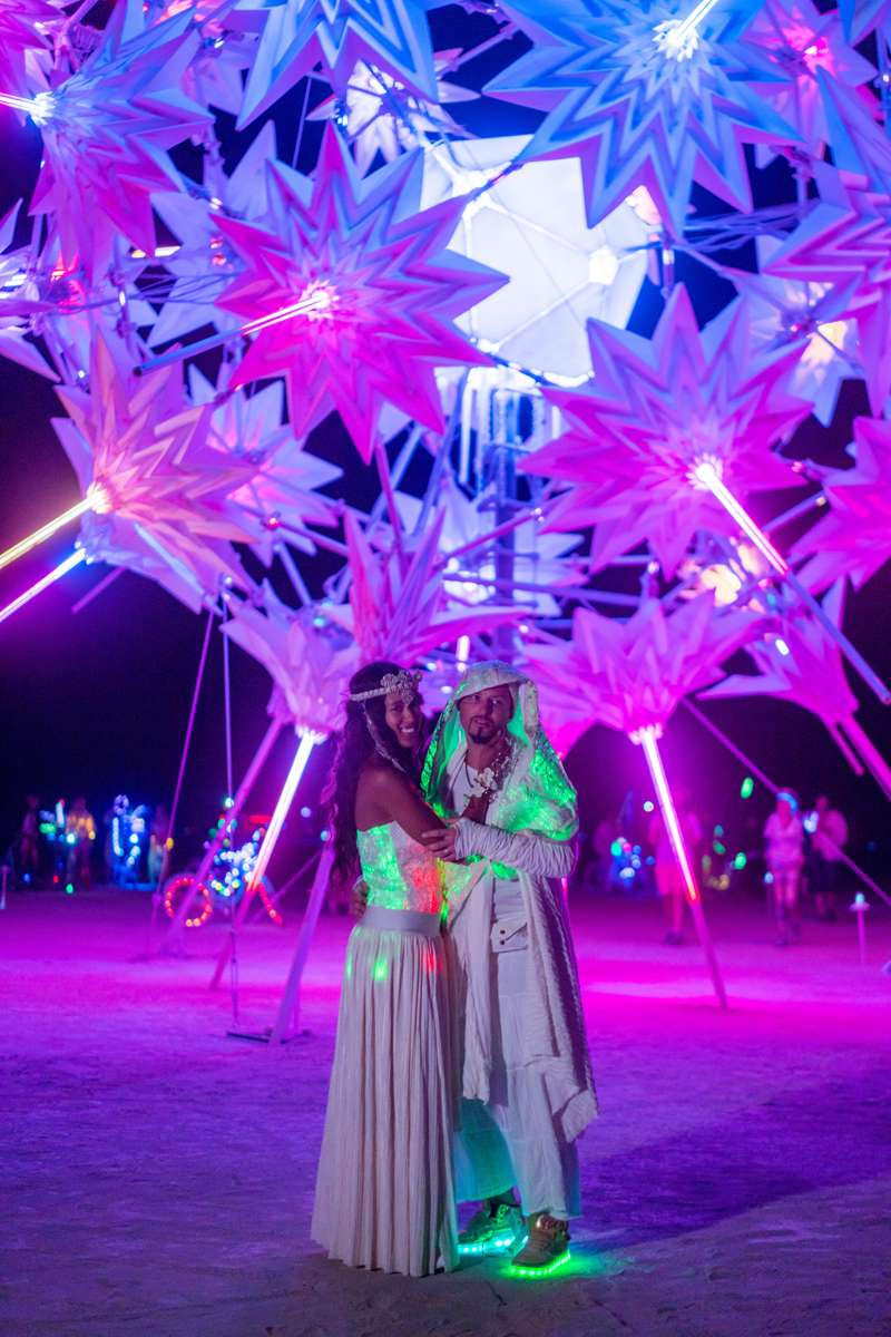 The ceremony itself took place in front of the RadiaLumia sculpture. “Gilles and I descended from the fire-pumping Carl the Chameleon with our faces hidden, wearing futuristic laser cut masks. It was funny to see the reactions of everyone. No one had been expecting us to be dressed like that. We took photos with everyone before starting the ceremony which was before the mesmerising colour changing RadiaLumia sculpture created by the FoldHaus art collective. The software engineers of the RadiaLumia installation coordinated the lights to turn on when Gilles and I exchanged rings and activated the fibre optic lighting in our wedding outfits.”
