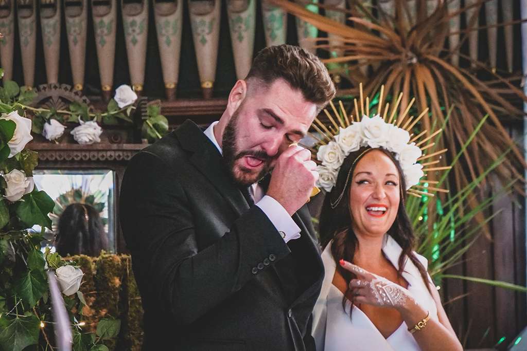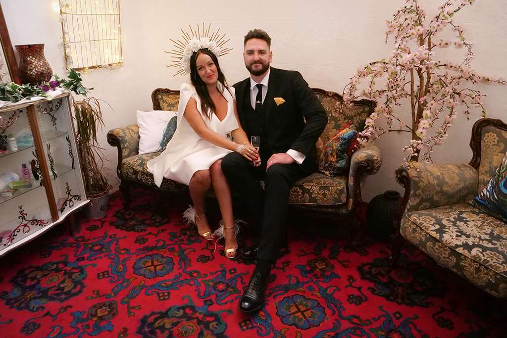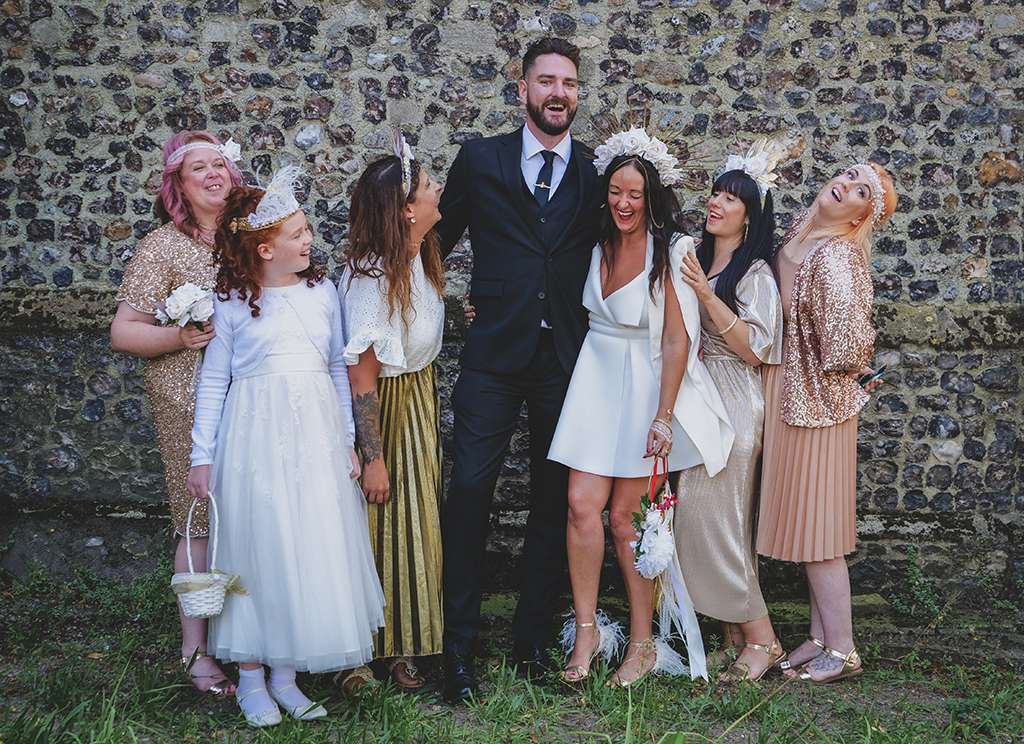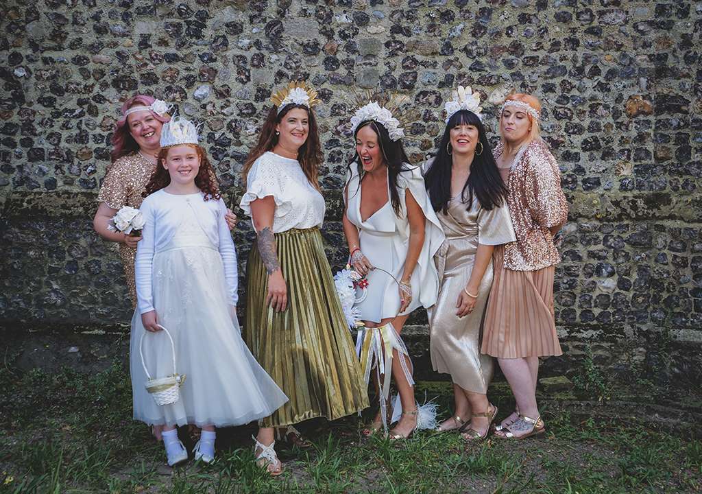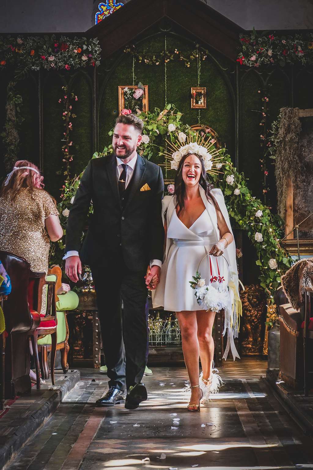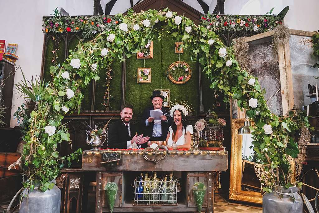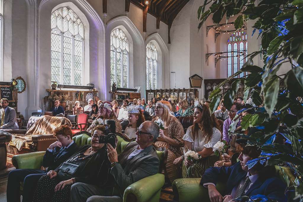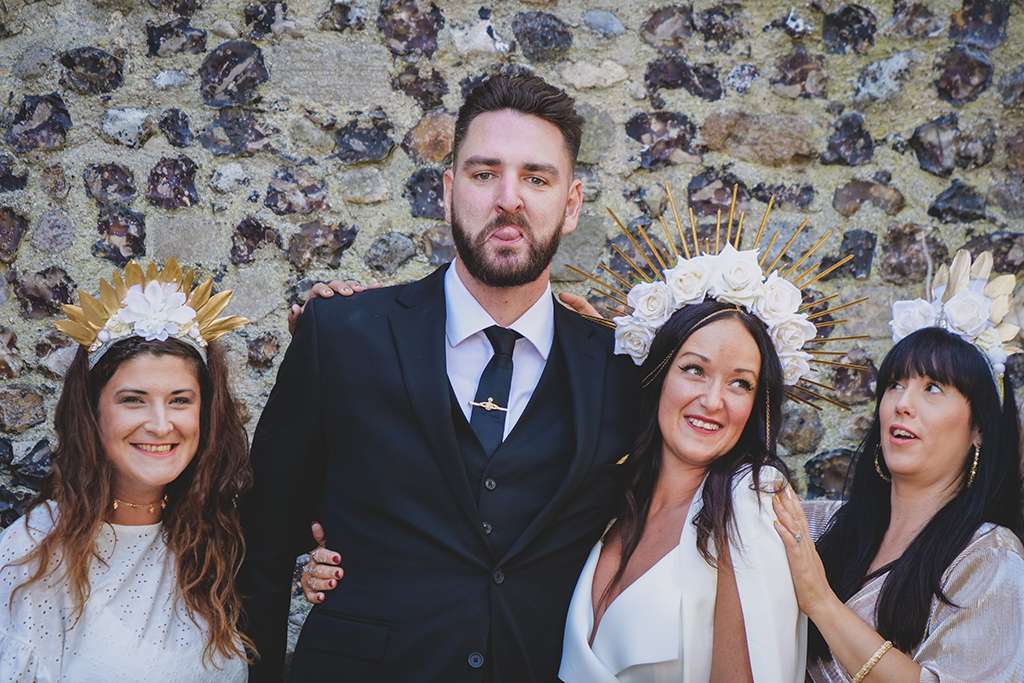 Their ceremony was held at The Flint Room – a former church that has since been turned into an alternative wedding venue, complete with mismatched vintage furniture, decor and even a prosecco bar. “The decadent meets eclectic meets spiritual venue was perfectly fitting for our ‘From Ibiza to the Norfolk Broads’ theme,” explained Laura. To further the connection between the two places, they included a unity sand ceremony in their nuptials. “We had a bottle of sand from both my favourite beach in Ibiza, and the beach we live right next to in Norfolk, which we each poured our containers into a bowl to signify our lives joining together.”