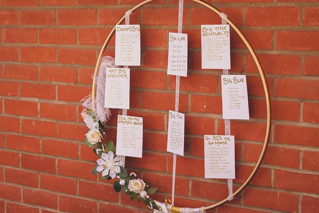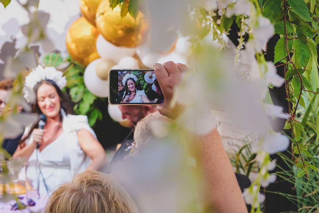 For decorations, they went with a classic White Isle theme of white and gold, spraying wine bottles gold and decorating with white pompoms, they handmade keepsake bouquets instead of fresh flowers, and concentrated the majority of their decor budget on an incredible white, gold and yellow balloon installations by Deck Above.