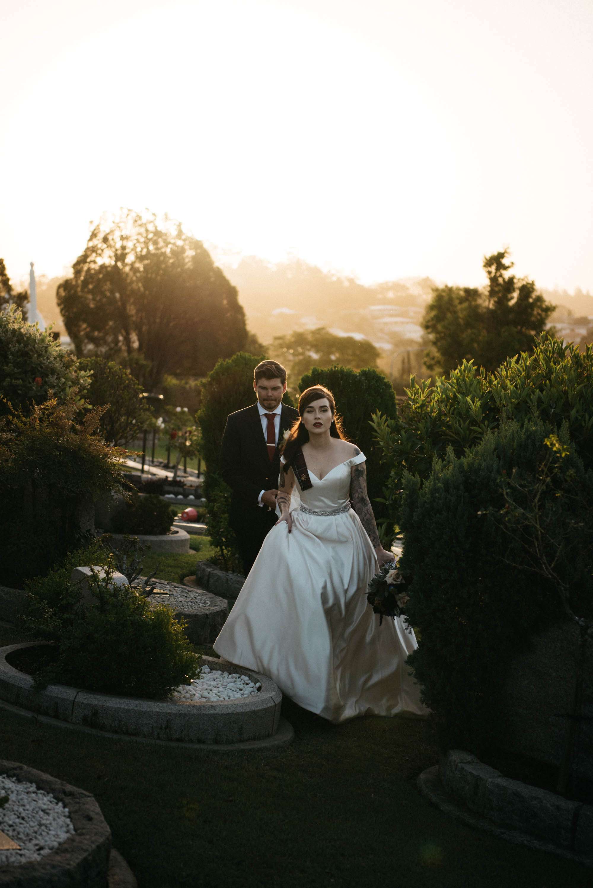 Kate and Jordon were married in an intimate ceremony at Mt Thompson Crematorium, where the bride works, in Holland Park, Brisbane. They wanted the wedding to reflect their lives and everything they’ve built together. They included nods to the bride’s Scottish heritage such as the tartan sash attached to her Sherri Hill dress and by having a handfasting and whiskey ceremony. The wedding cake was made with Belgian chocolate as a nod to Jordon being born in Belgium.