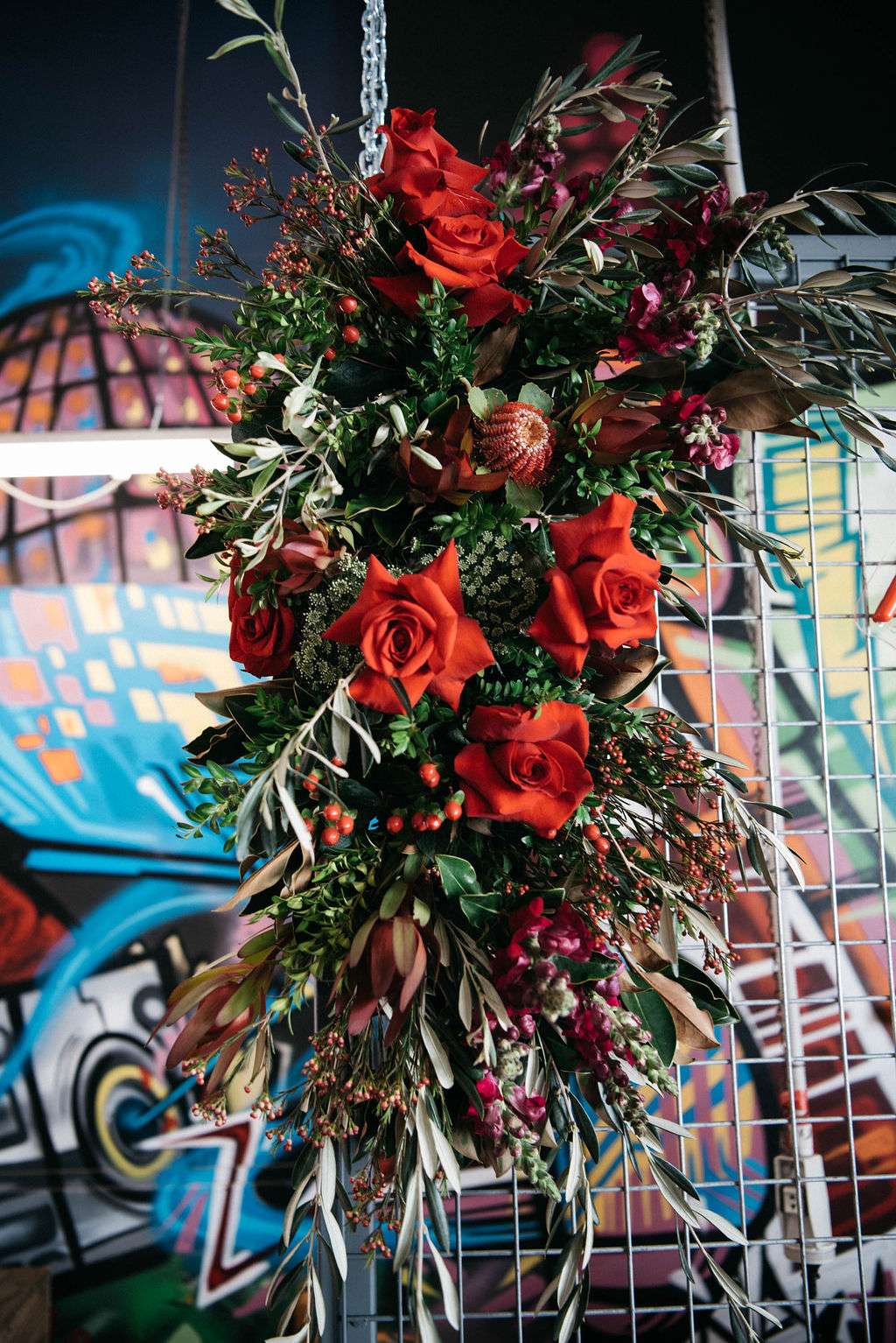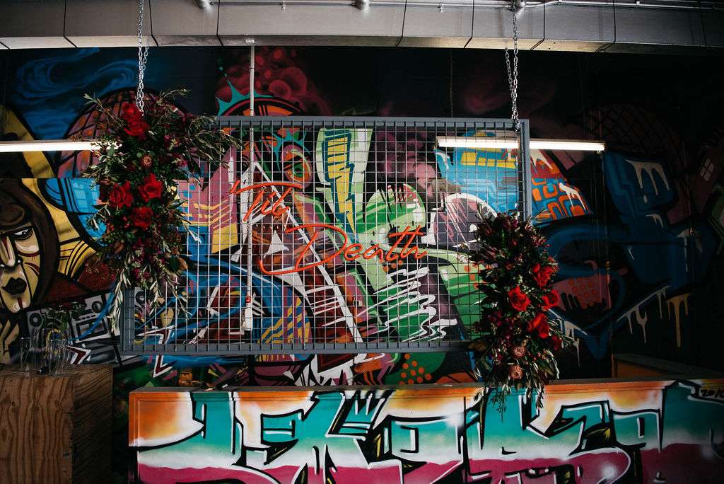 The venue was very industrial with graffiti on the walls, exposed ceilings, pallet walls and an all together grungy vibe, so they chose decor elements to complement. “We wanted to balance that with a touch of elegance through flowers, vase candles and red velvet vintage couches. Music also had a very prominent role, which would be surprising to no one who knows us. We brought our personality and love of music through things like decorating the stairwell with gig posters (just like a music venue would be), styling our signage and stationary like the back of a record, decorating the pallet wall with lyrics and gig posters and adding little touches like a guitar case wishing well. We wanted our personality to shine through, but not overrun what was already there in the space.”
