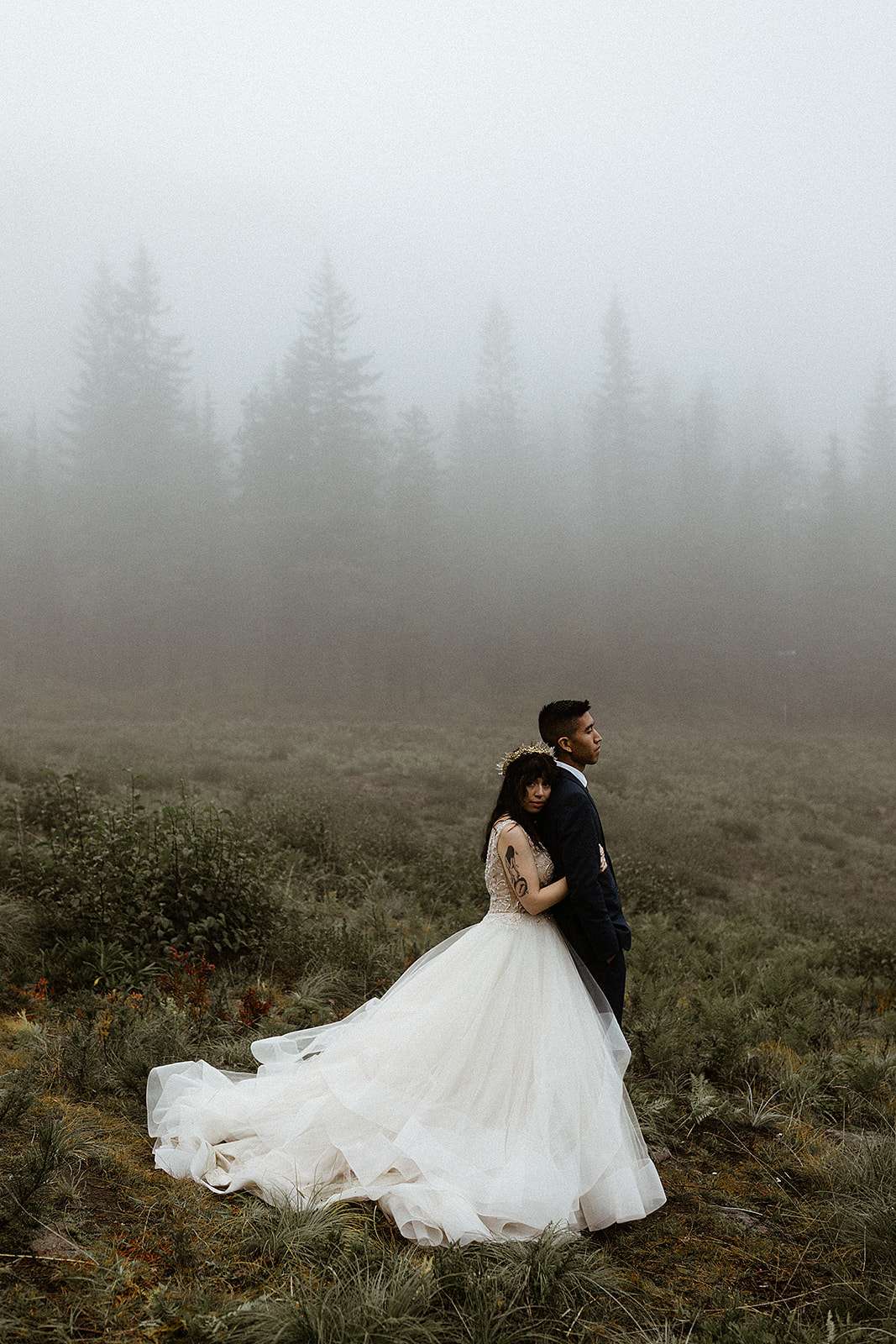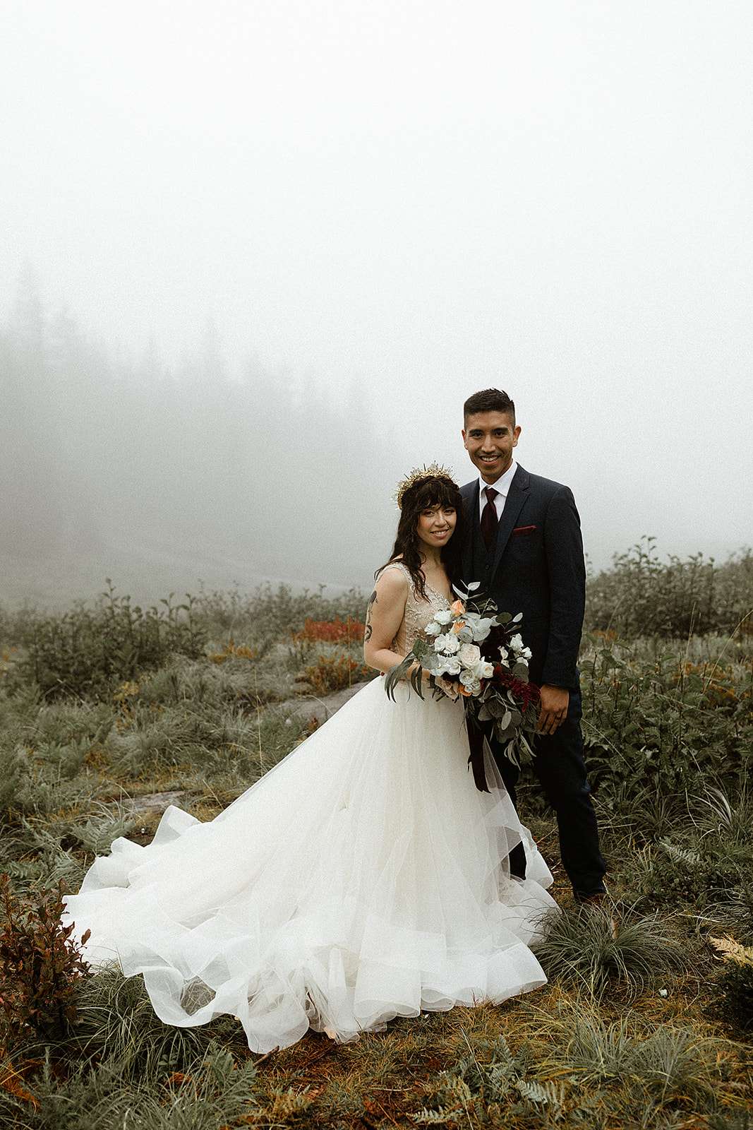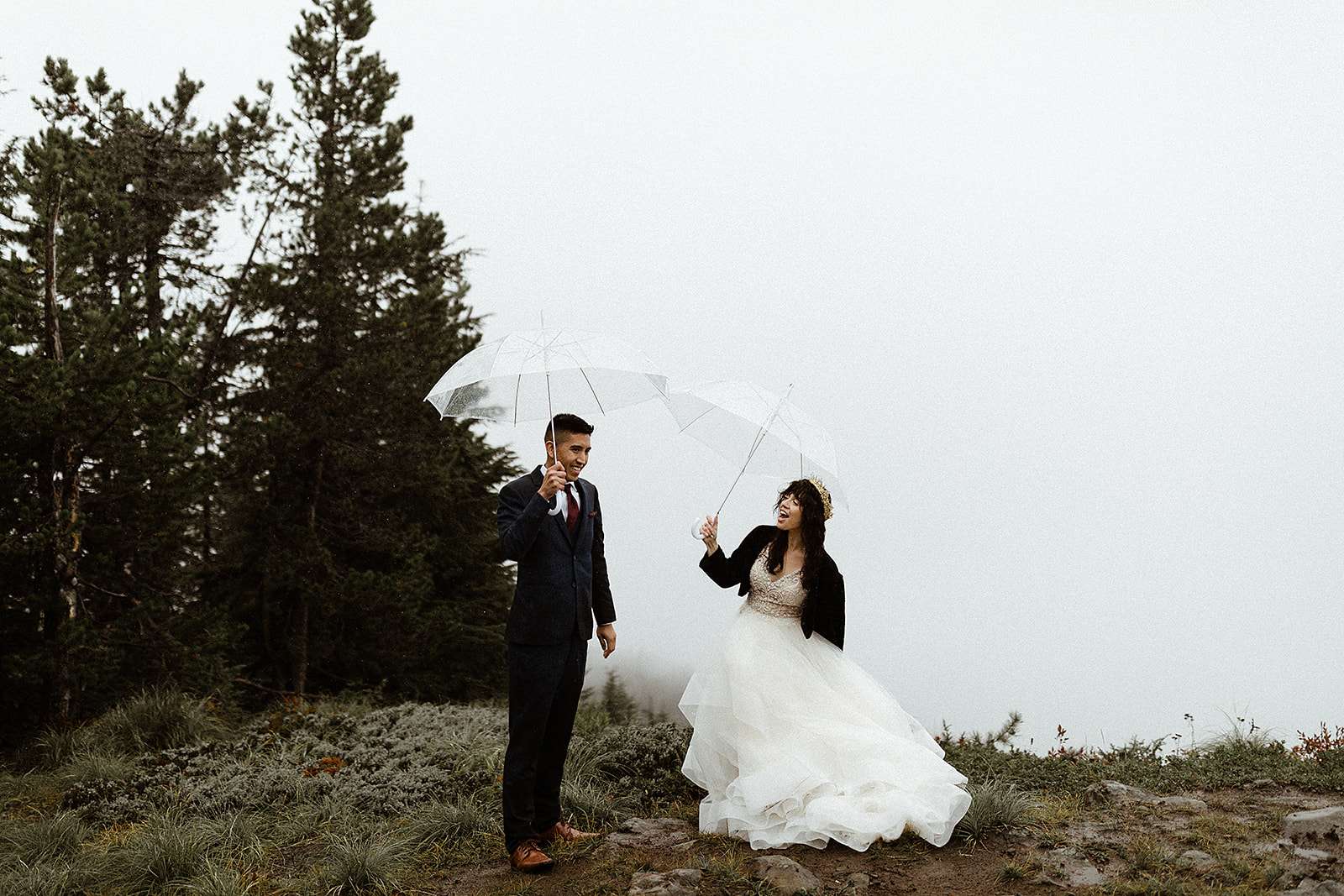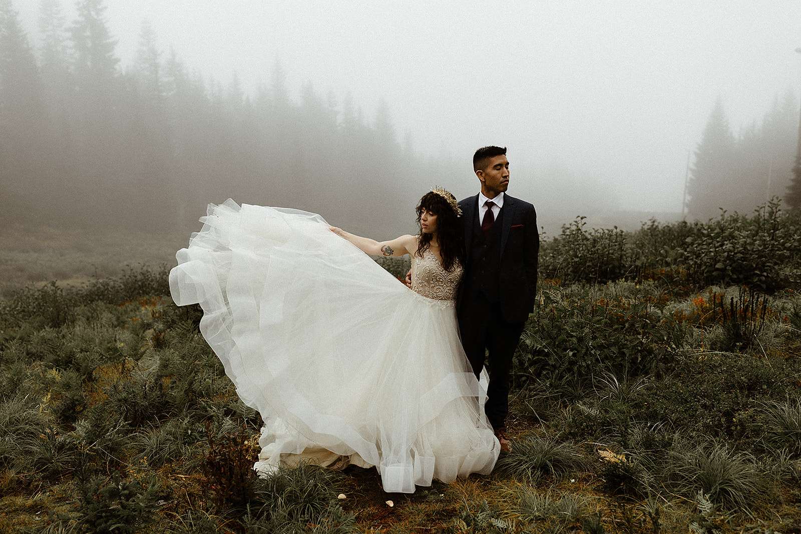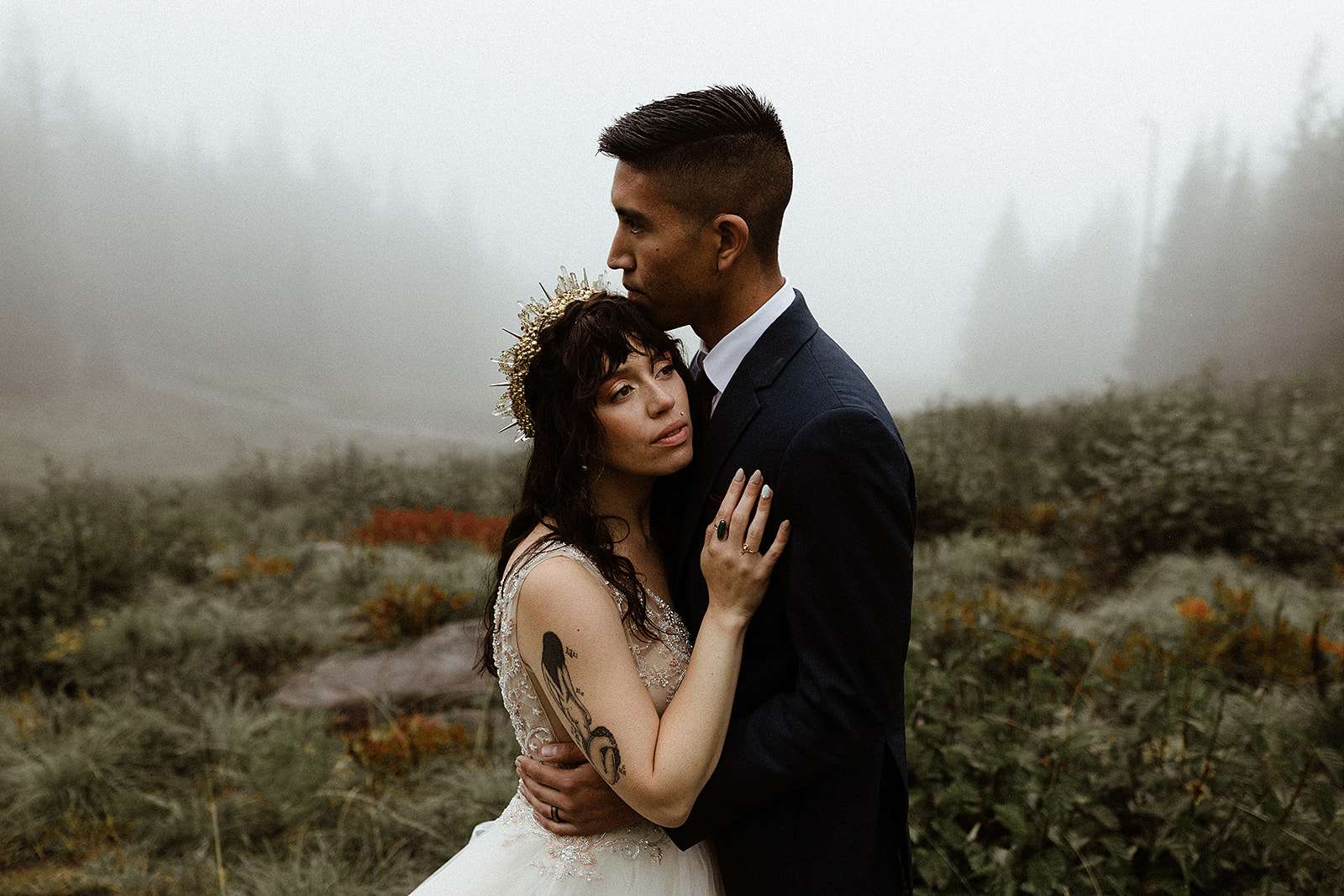 “I think there were a lot of things that made our wedding unique”, explained the bride. “We married a day before the equinox and the shift is season was extremely present (as I’m sure you could see by our foggy and rainy photos). We married on the side of a mountain overlooking a volcano (which unfortunately couldn’t be seen because of the fog). We were married on indigenous sacred land and when we arrived at the base of the mountain a Native tribe was having a ceremony asking for blessings from the earth for rain and protection for salmon during their travel in winter months.”