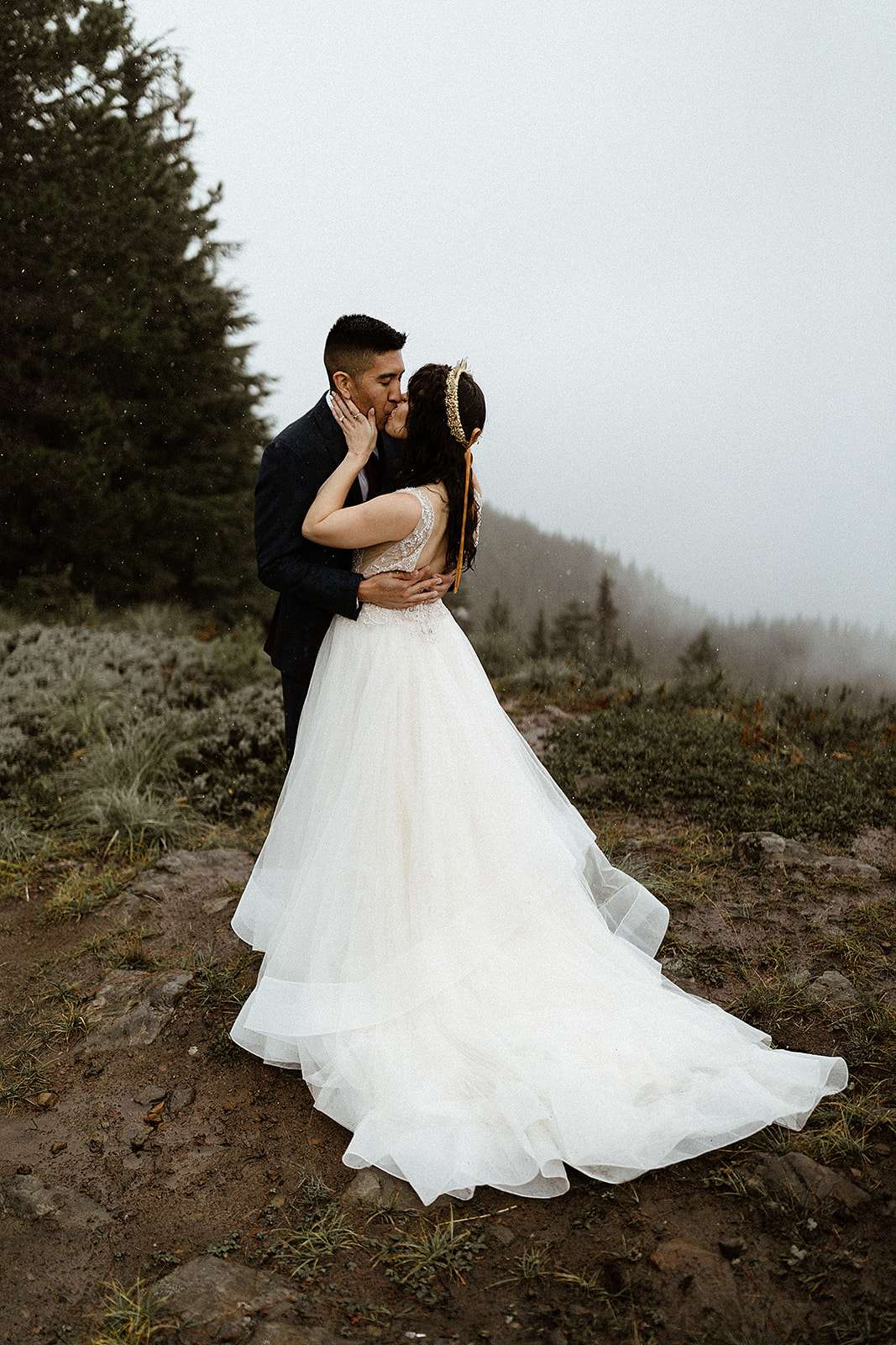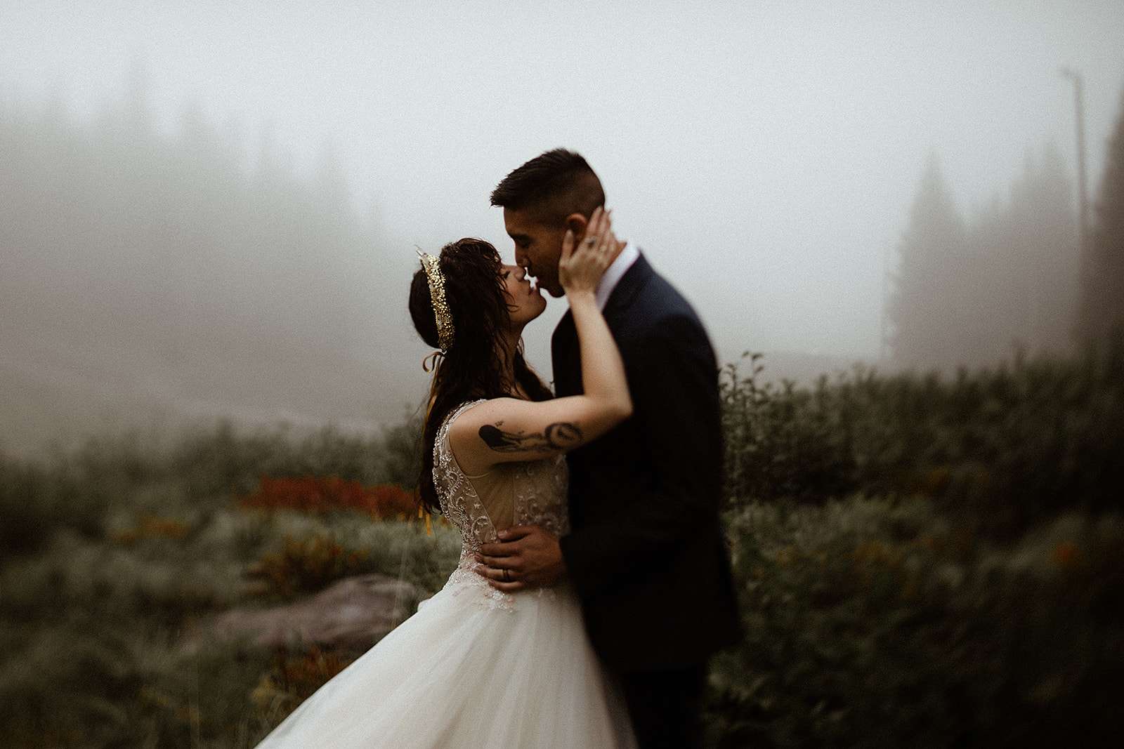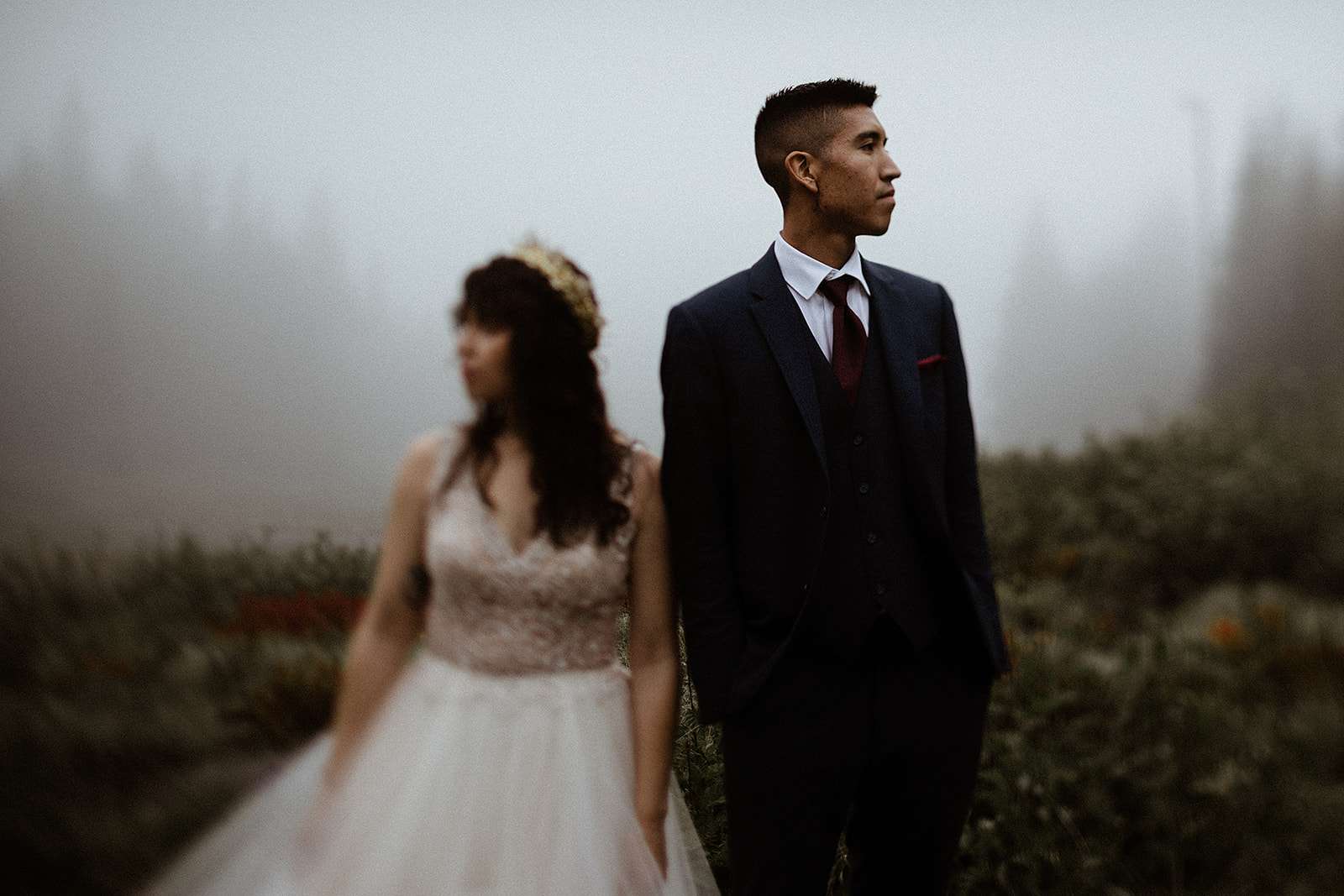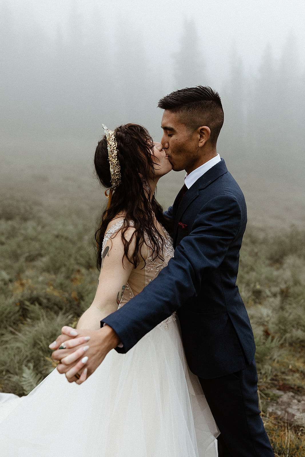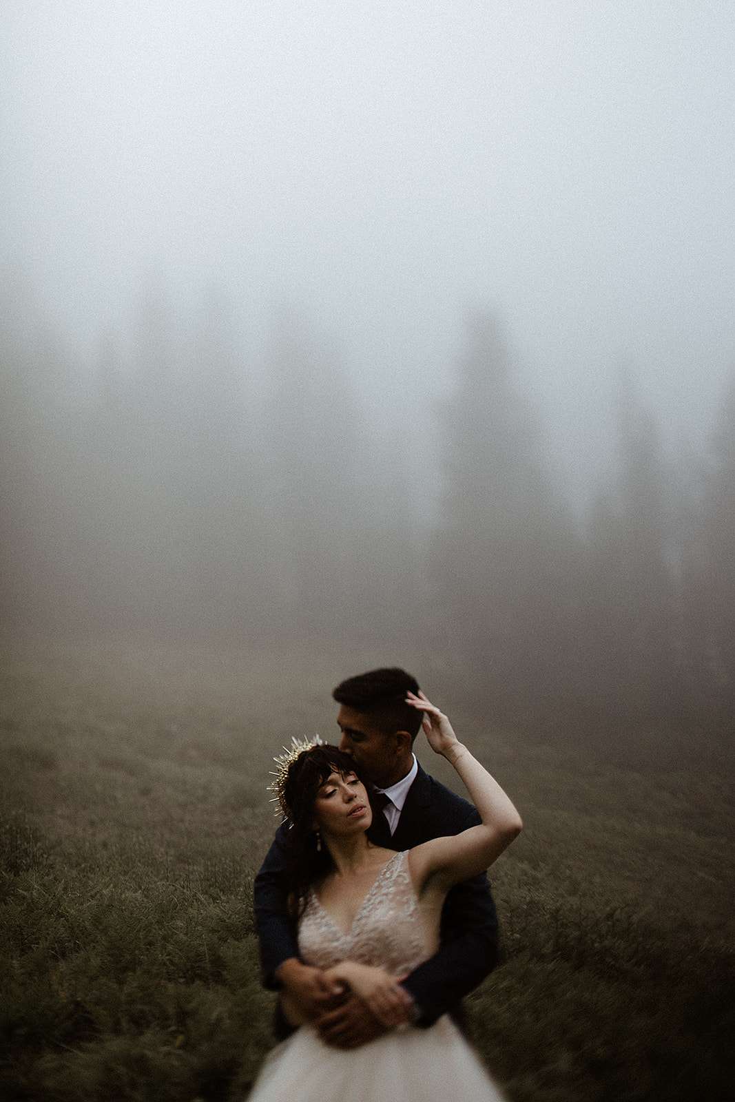 “I think there were a lot of things that made our wedding unique”, explained the bride. “We married a day before the equinox and the shift is season was extremely present (as I’m sure you could see by our foggy and rainy photos). We married on the side of a mountain overlooking a volcano (which unfortunately couldn’t be seen because of the fog). We were married on indigenous sacred land and when we arrived at the base of the mountain a Native tribe was having a ceremony asking for blessings from the earth for rain and protection for salmon during their travel in winter months.”
