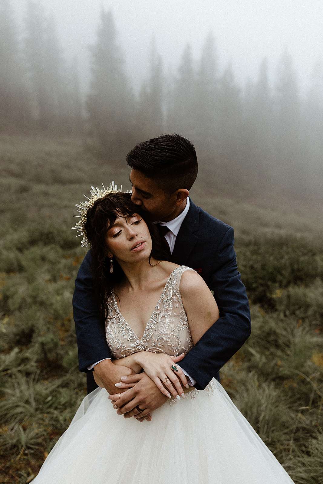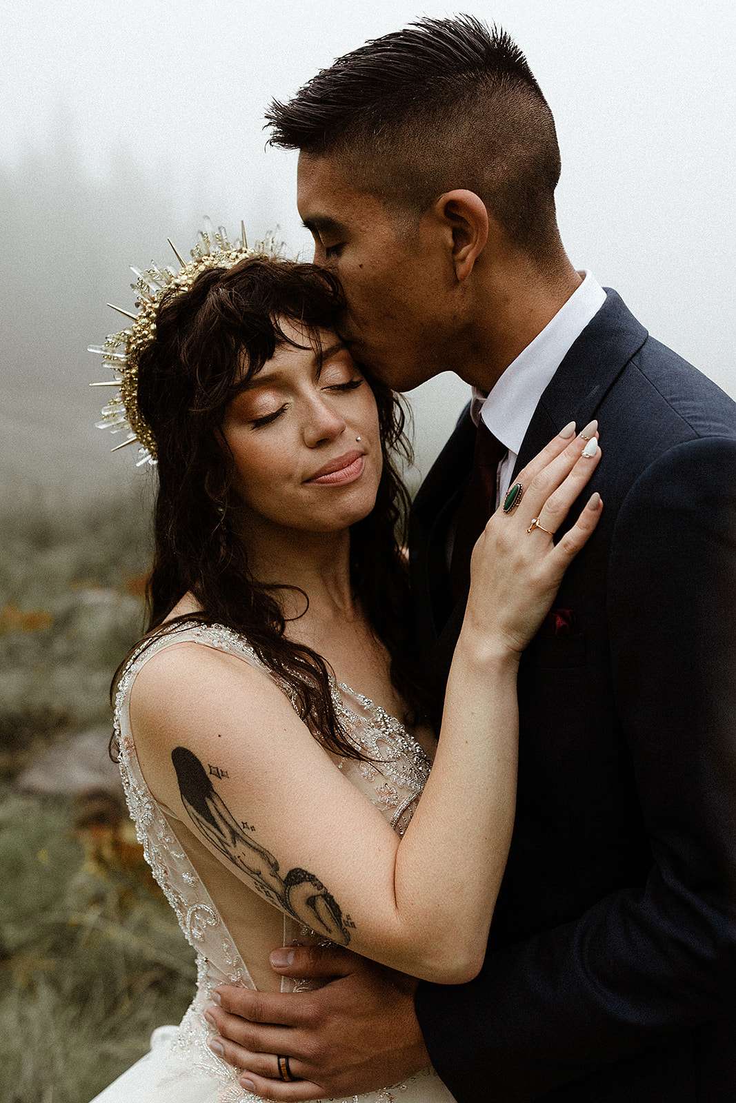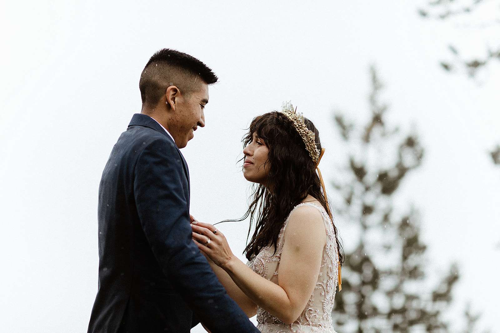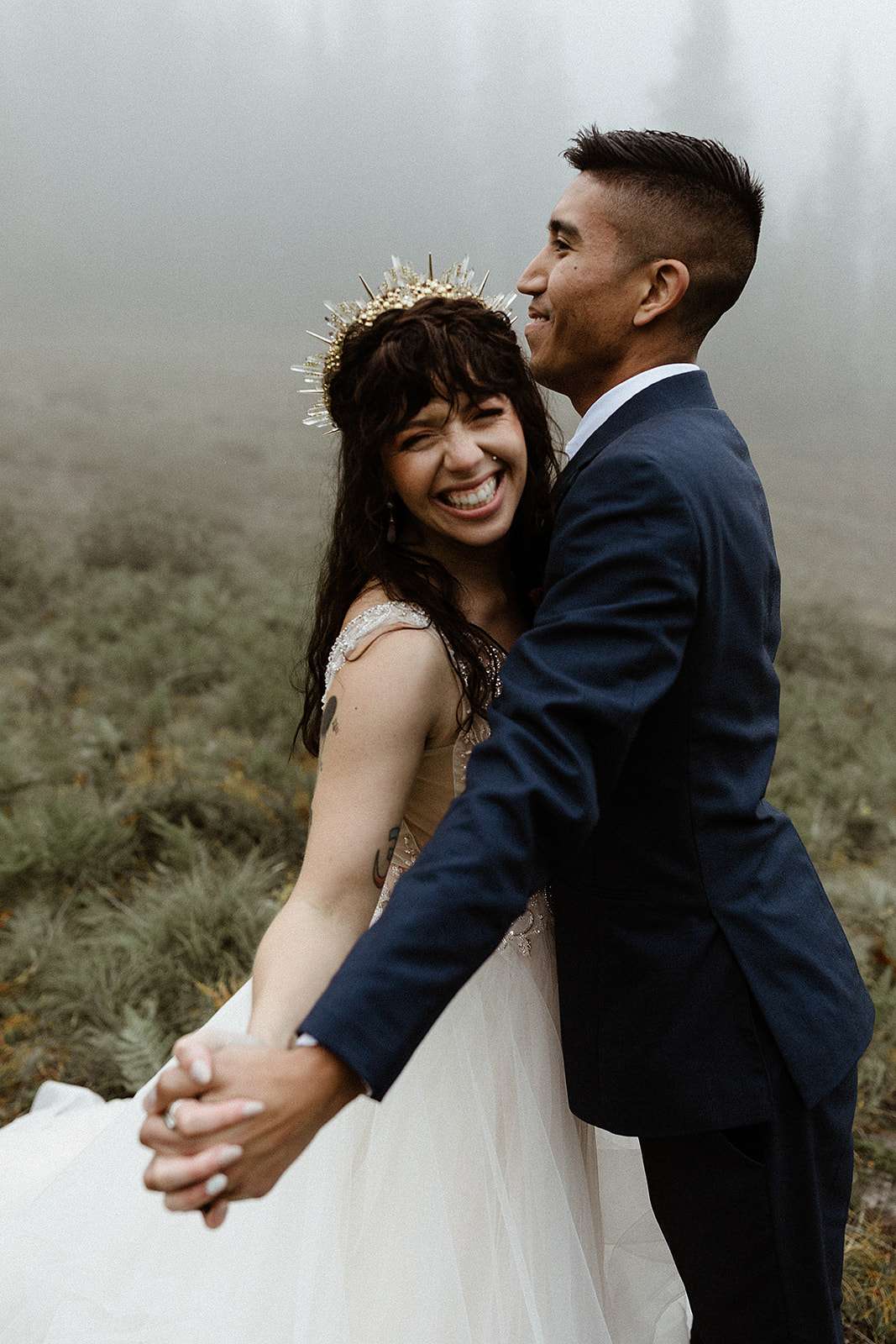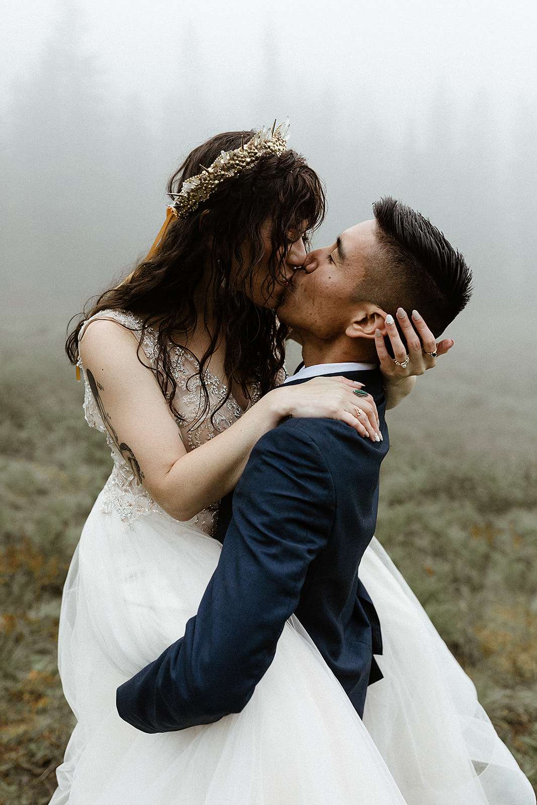 “I think there were a lot of things that made our wedding unique”, explained the bride. “We married a day before the equinox and the shift is season was extremely present (as I’m sure you could see by our foggy and rainy photos). We married on the side of a mountain overlooking a volcano (which unfortunately couldn’t be seen because of the fog). We were married on indigenous sacred land and when we arrived at the base of the mountain a Native tribe was having a ceremony asking for blessings from the earth for rain and protection for salmon during their travel in winter months.”